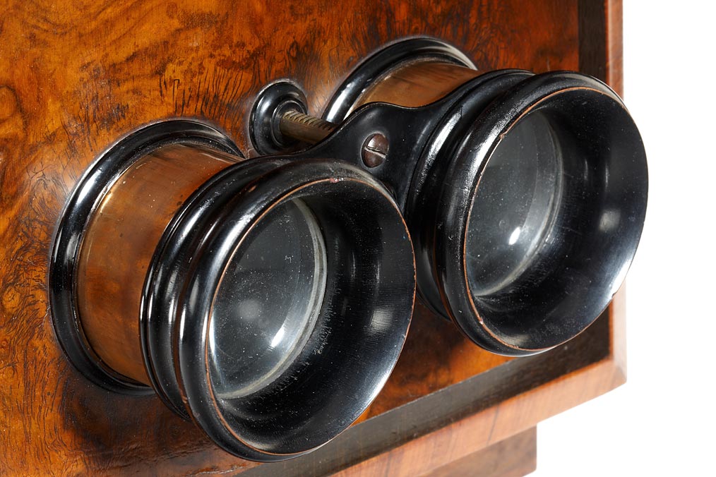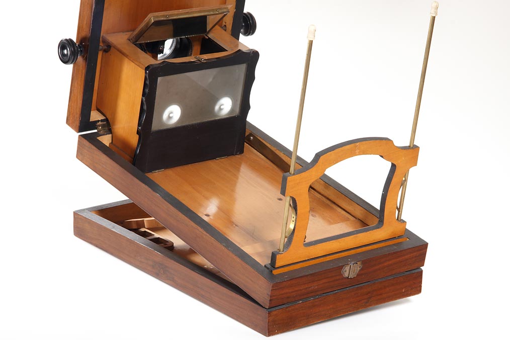 three-part box form large French stereographoscope with burl wood veneer and ebony banding, on the inside a collapsible frame with reflecting lid and ground glass for viewing stereo slides, rack and pinion focus, in very good condition.
