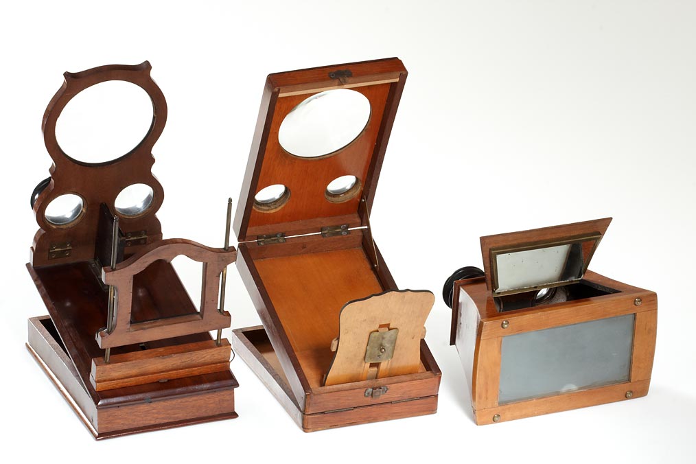 nice compilation of two small stereographoscopes and a handheld viewer made of wood, (1,2) two well designed and beautifully crafted French folding scopes in nearly mint condition, perfect finish and lenses, (3) in addition to the scopes comes a plain, but elegant wooden Brewster scope with hinged mirror in good original condition. (3)