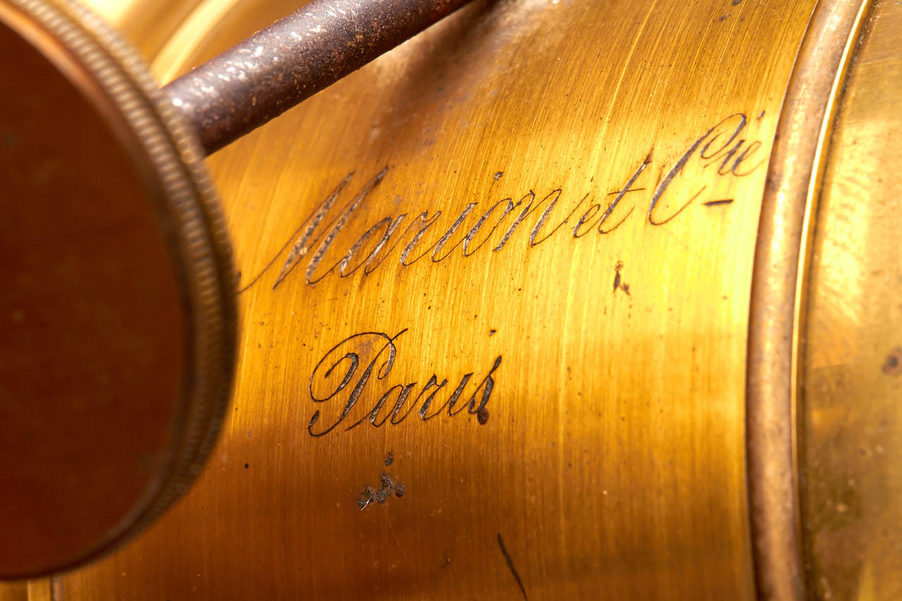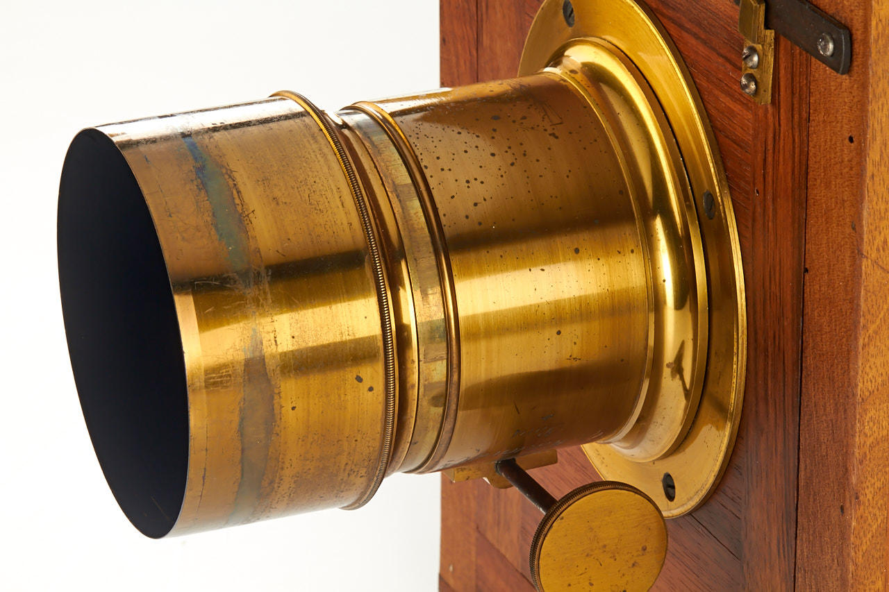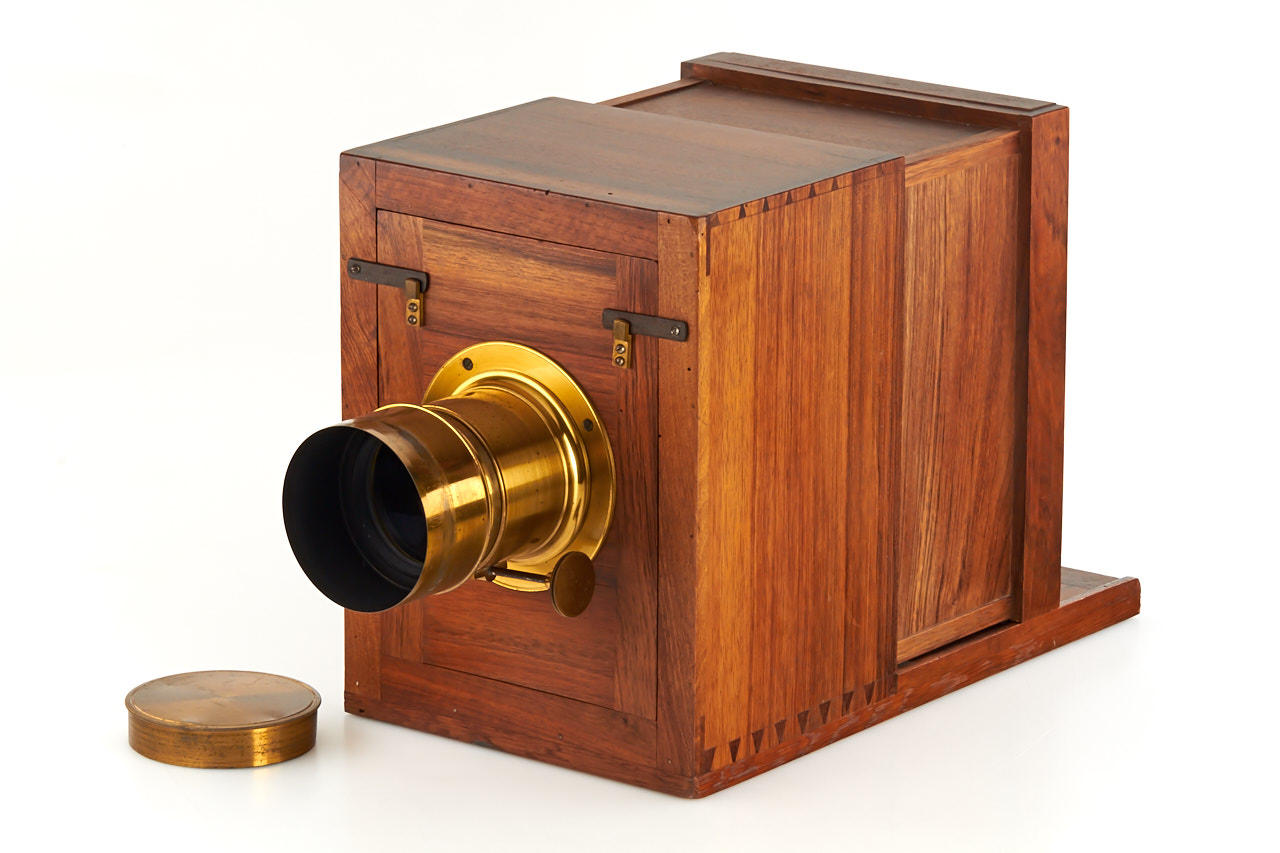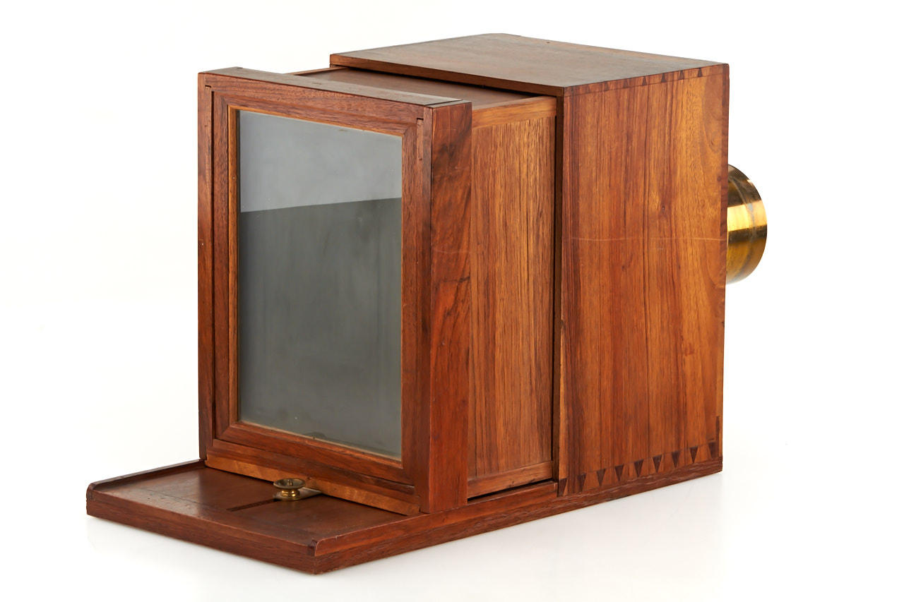 early camera from Daguerreotype/wet plate transitional period, full plate size, in exceptional, beautiful original condition, with matching Marion Paris Petzval type lens (total height with hood 21cm, front and rear element diameter 8cm, rack and pinion focusing, very good optics, with only few minimal scratches, matching shutter cap) with large original wooden tripod c.94cm height in lowest position (wooden frame around the table added later, otherwise in original condition and from a matching period), an excellent and very attractive early outfit
