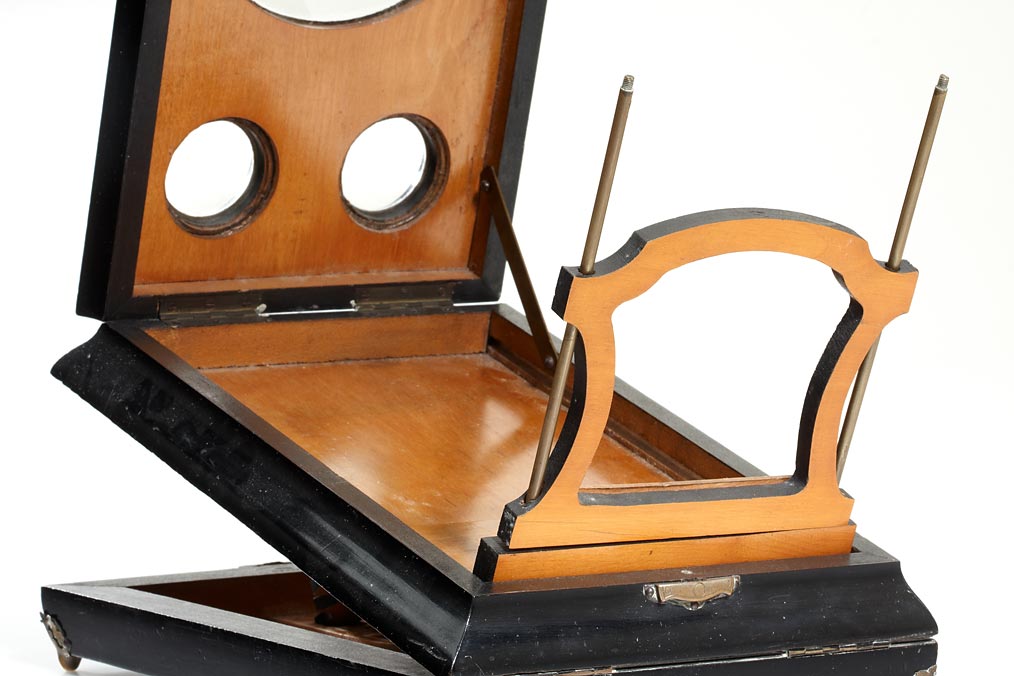 beautiful set consisting of a stereo-viewer and a 'Pantoscope' stereographoscope, both made of wood with lacquer finish and decorative carving, the luxury handheld stereo-viewer with silver plated oculars, central focus and hinged mirror to view 6x13 cards and slides alike.(2)