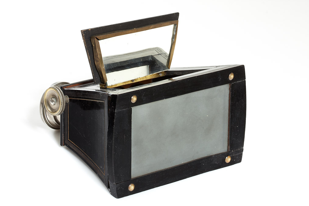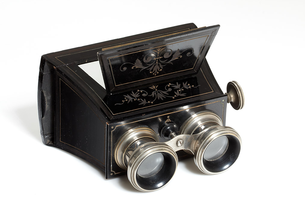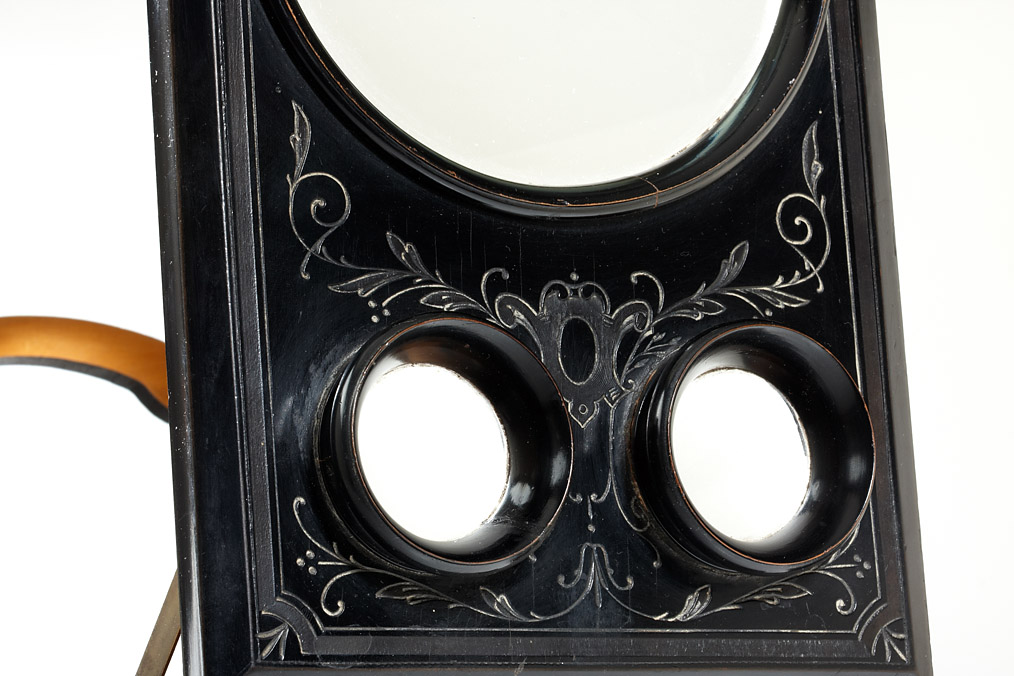 beautiful set consisting of a stereo-viewer and a 'Pantoscope' stereographoscope, both made of wood with lacquer finish and decorative carving, the luxury handheld stereo-viewer with silver plated oculars, central focus and hinged mirror to view 6x13 cards and slides alike.(2)