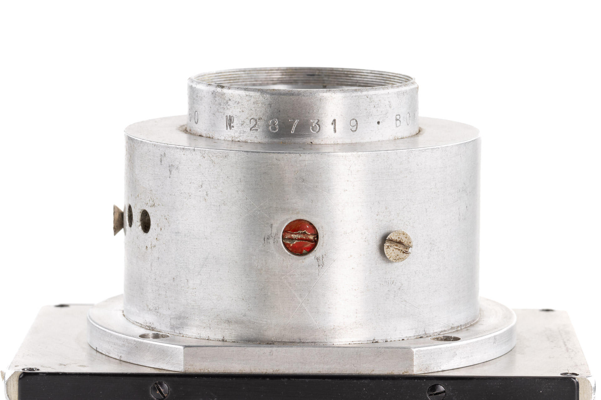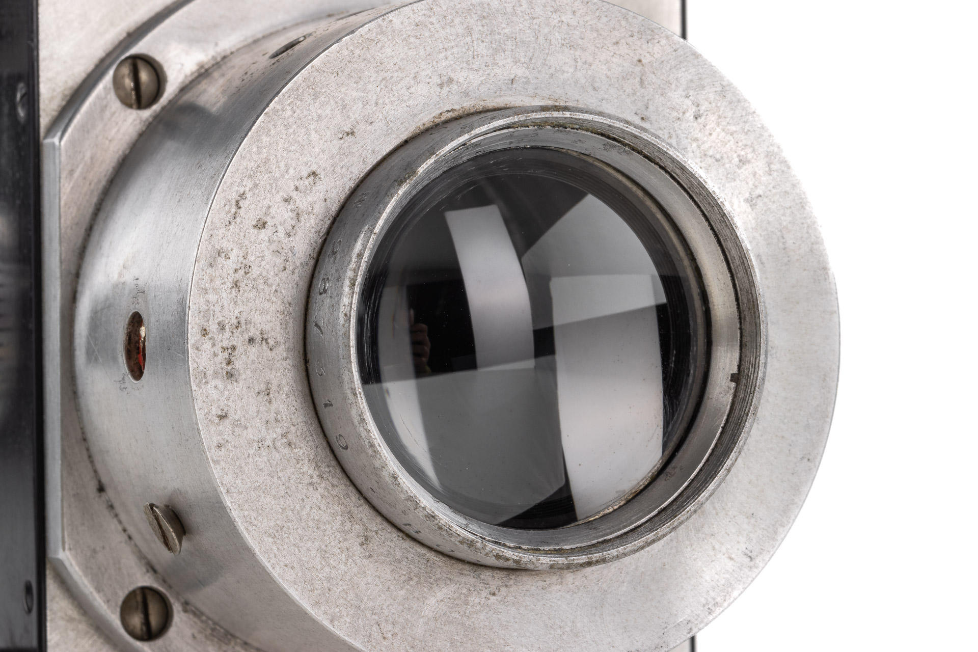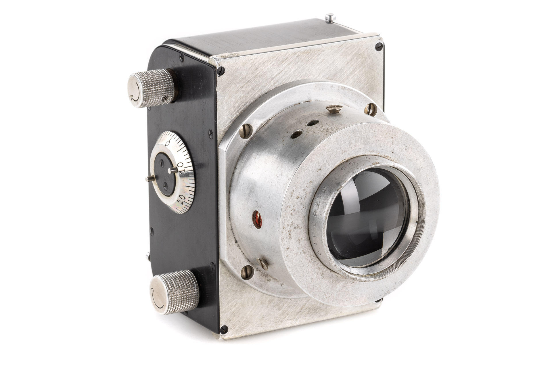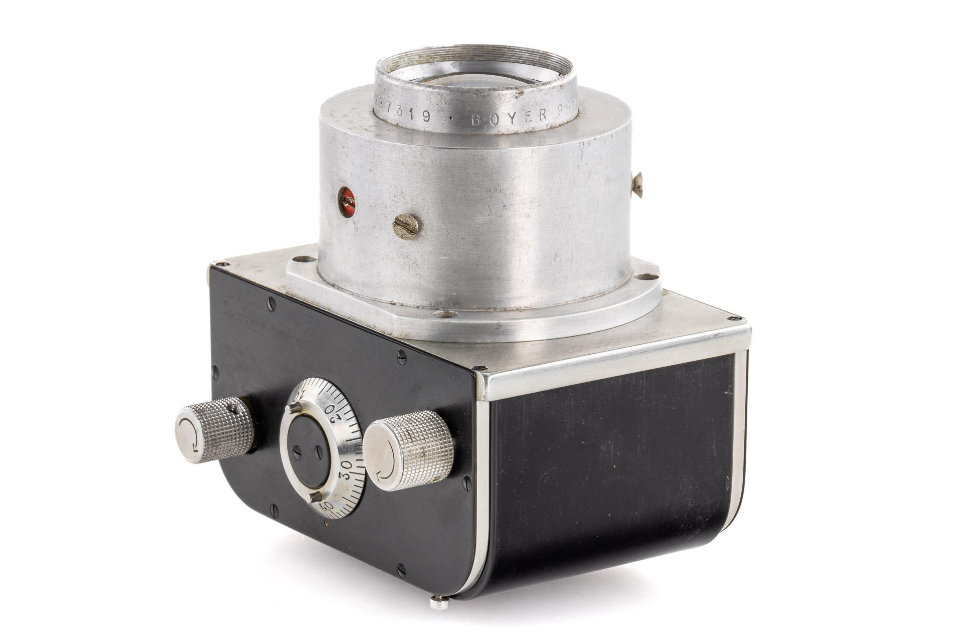 interesting and very well constructed scientific camera, all metal with some high polished parts, 24x24mm on 35mm film, frame counter, no shutter and no finder, fixed focus at ca.35cm, with clean and clear fast uncoated projection lens Boyer Jade 1.9/60mm no.287319 (1930s), in near mint condition, only very few of these cameras are known to exist