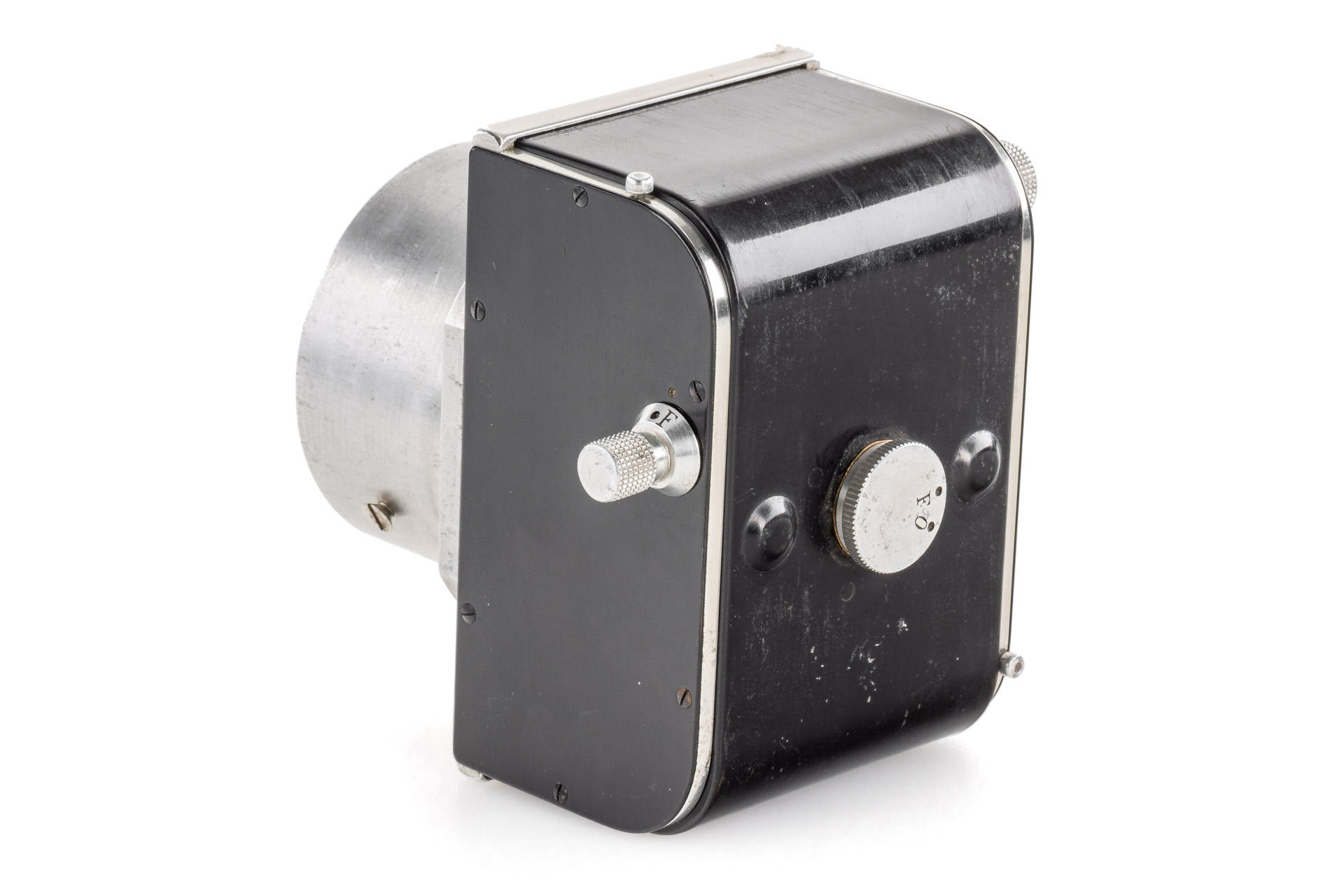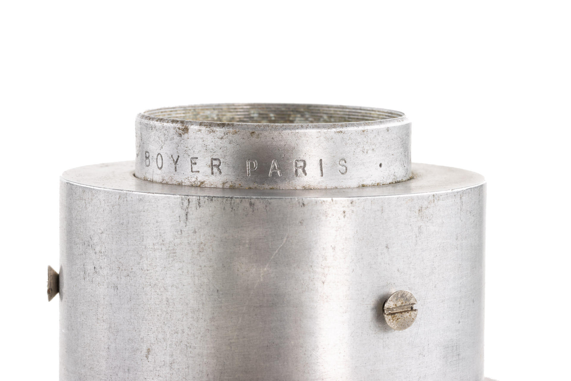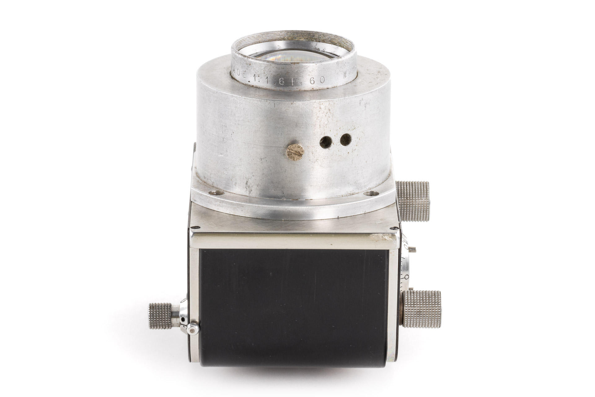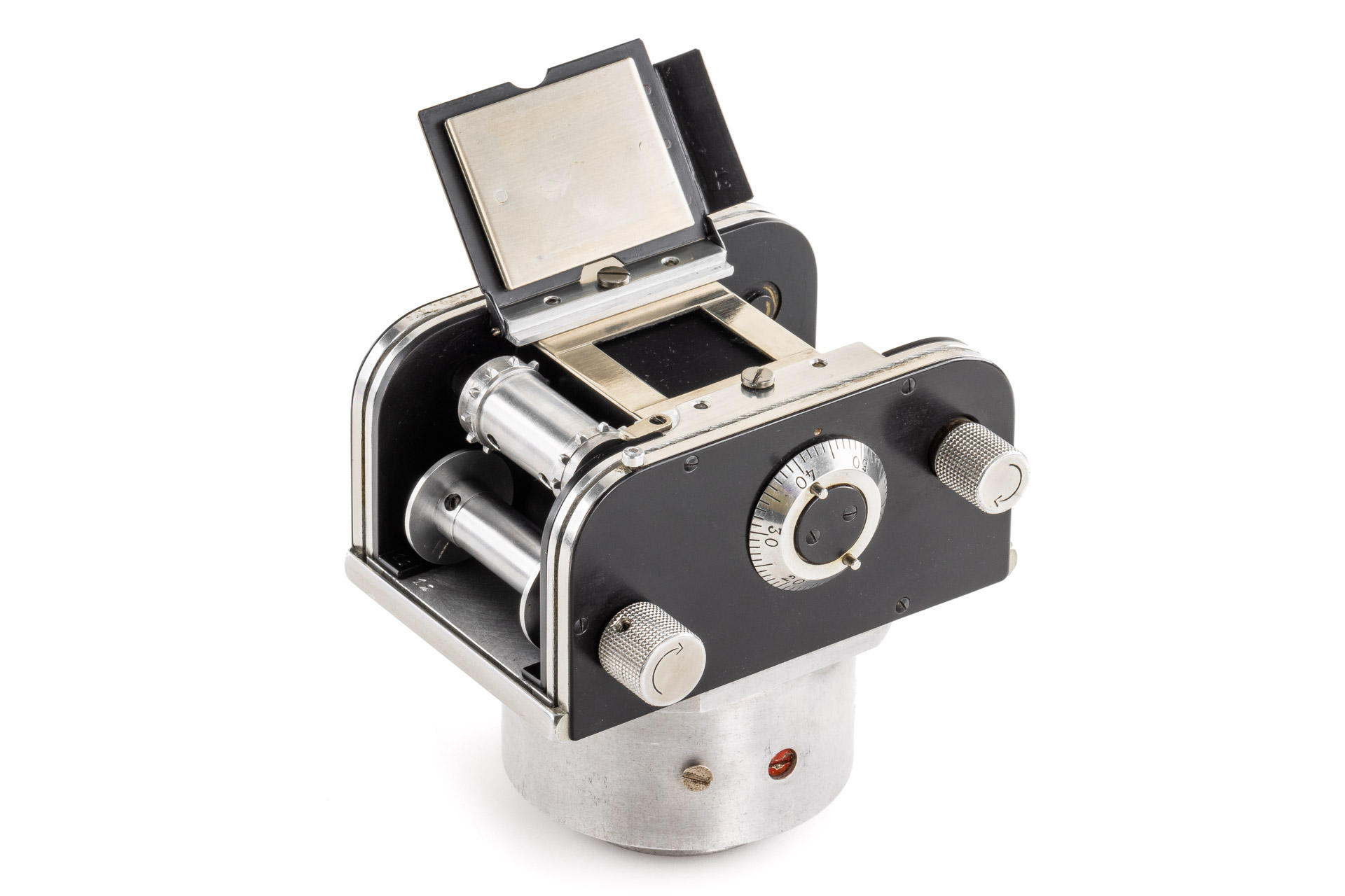 interesting and very well constructed scientific camera, all metal with some high polished parts, 24x24mm on 35mm film, frame counter, no shutter and no finder, fixed focus at ca.35cm, with clean and clear fast uncoated projection lens Boyer Jade 1.9/60mm no.287319 (1930s), in near mint condition, only very few of these cameras are known to exist