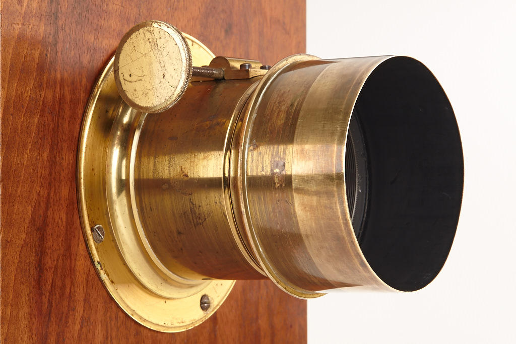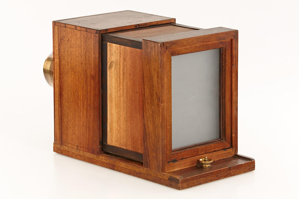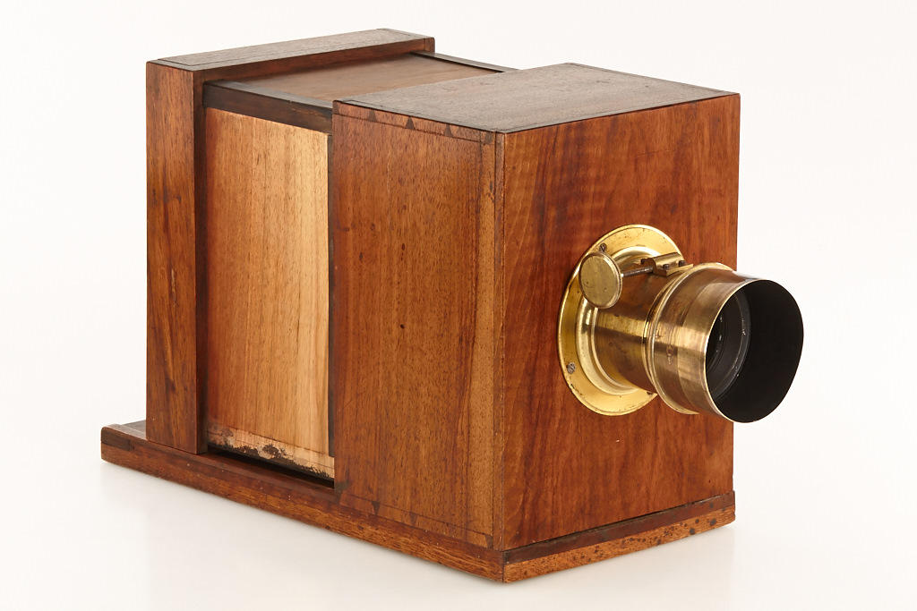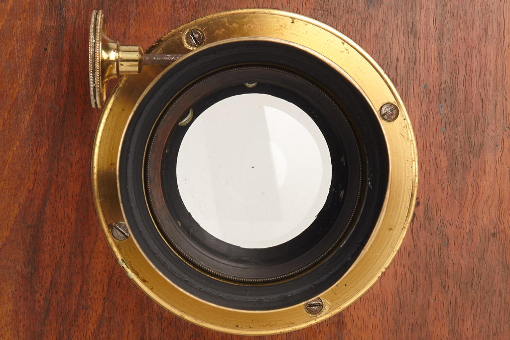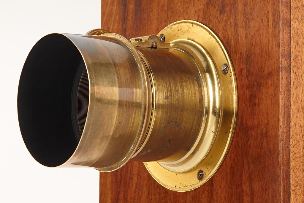 for 12.5x17.5cm daguerreotype or wet collodion plates, walnut, with an un-named brass bound Petzval lens with rack & pinion focusing, original shutter cap, wooden ground glass holder, 19x25.5x35.5cm