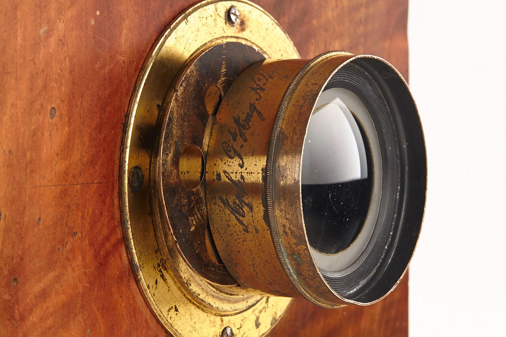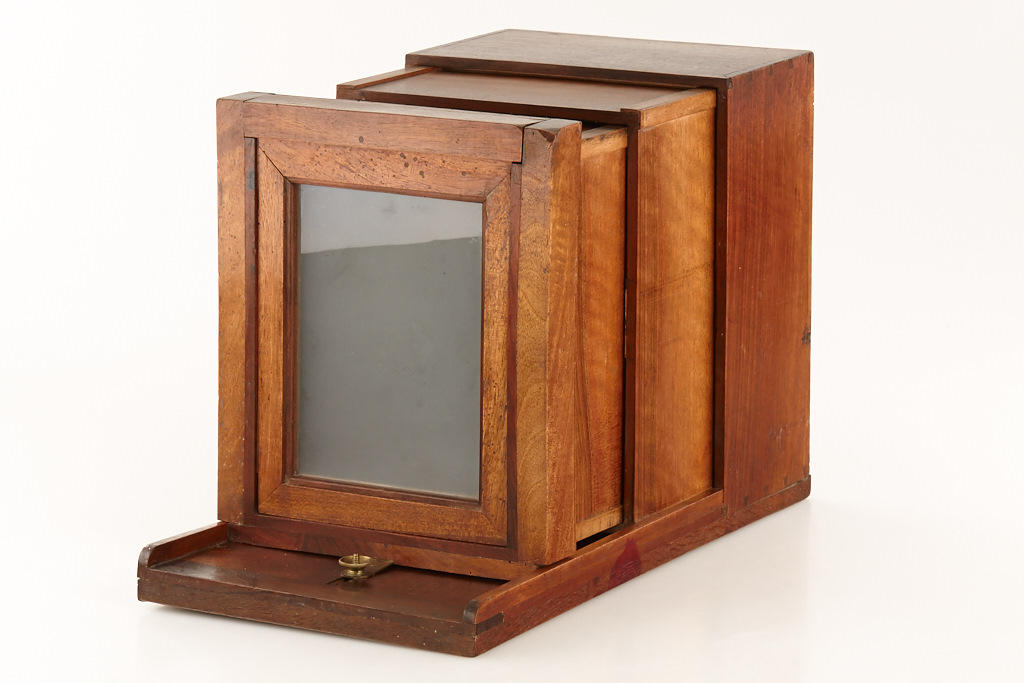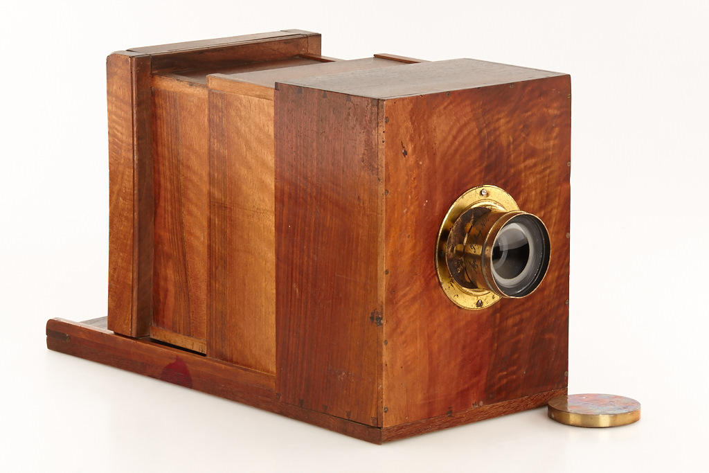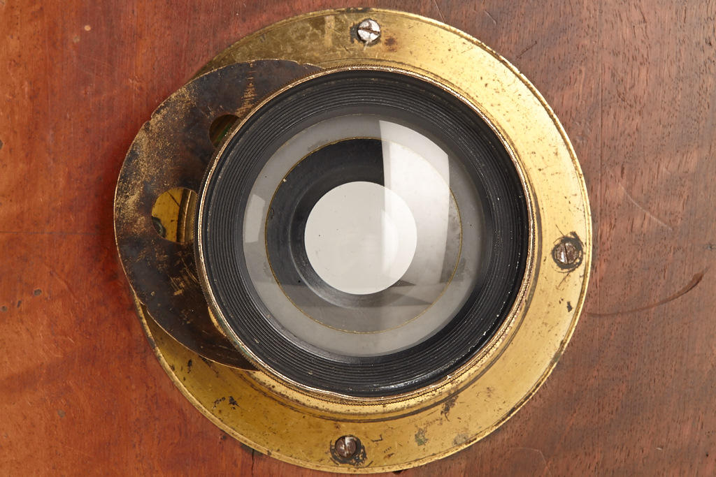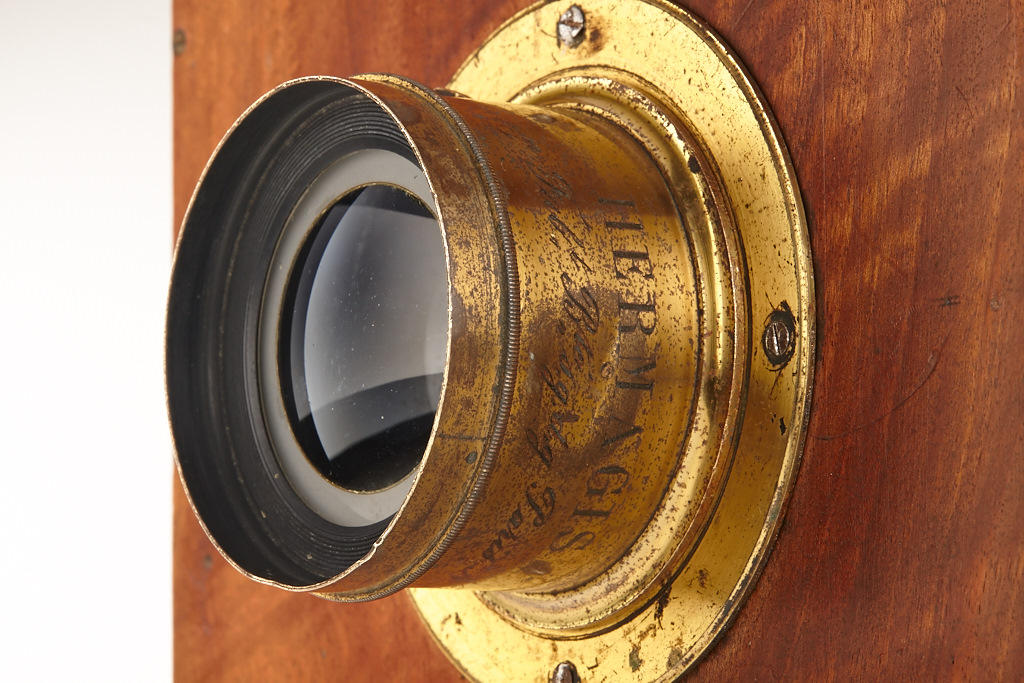 for 12.5x17.5cm daguerreotype or wet collodion plates, walnut, with brass bound Hermagis Aplanat No.4 lens no.22863 with rotating aperture disc, brass shutter cap, wooden ground glass holder, 22.5x29x45cm
