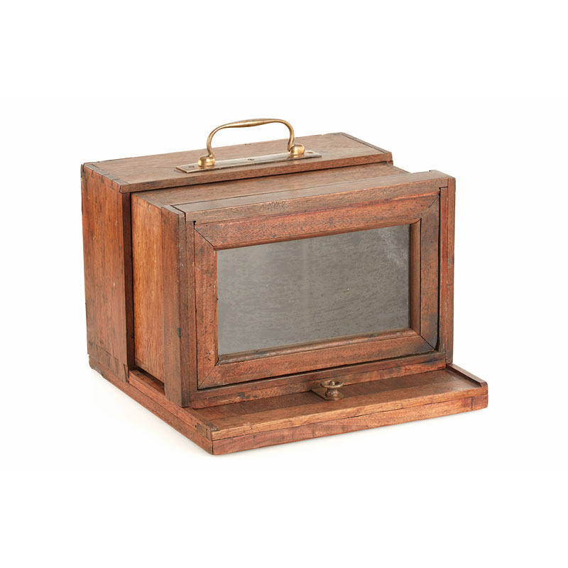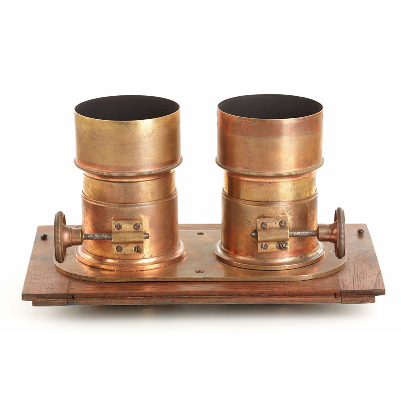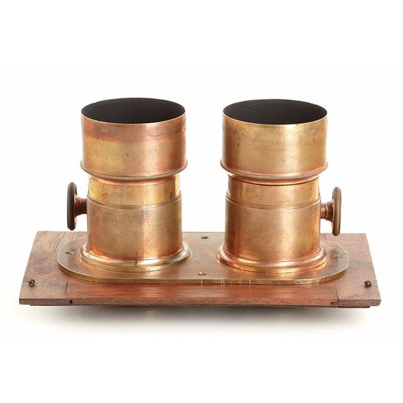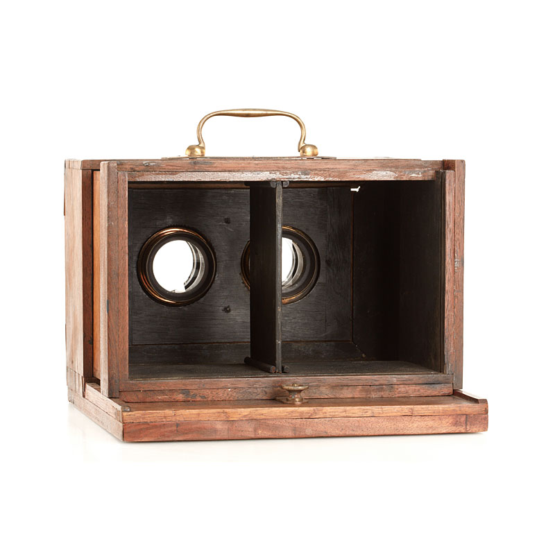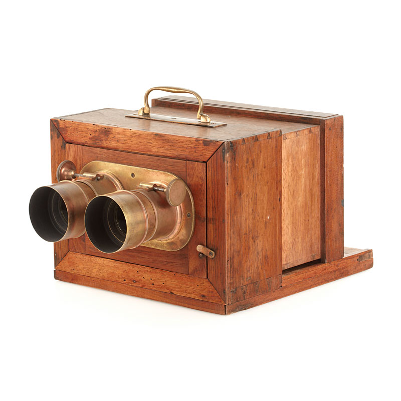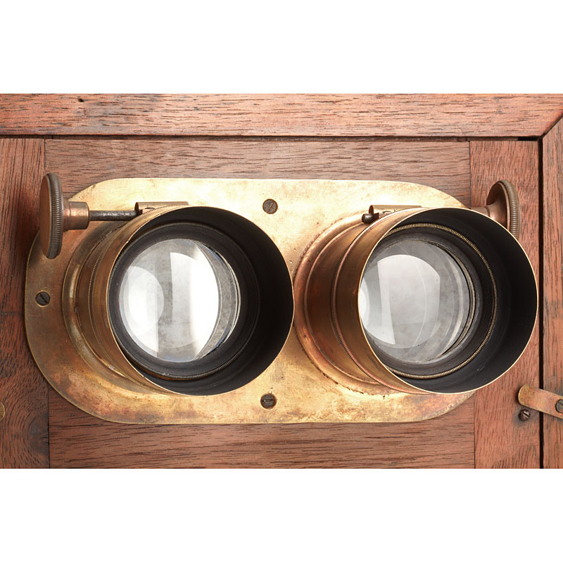 for 9x18cm wet collodium plates, wood body, with a pair of unmarked brass lenses with rack and pinion focusing, double lens cap, a very rare, early sliding box stereo camera in good condition