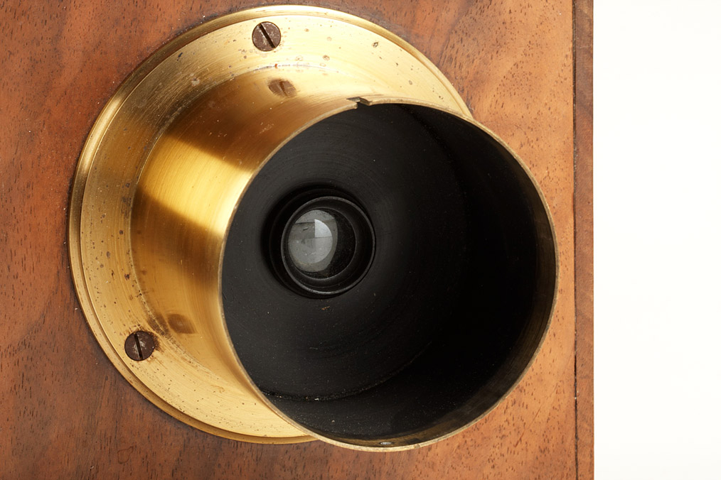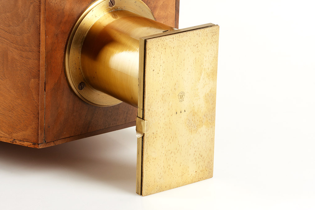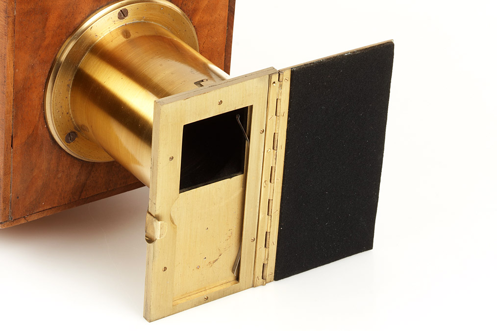 compact enlarger by unknown producer, mounted on the narrow side of the wooden pyramid-shaped body a brass-made holder for 4x10cm stereo glass plates, on the opposite a wooden 24x24cm copying-frame with hinged doors. The purpose of this enlarger is to co