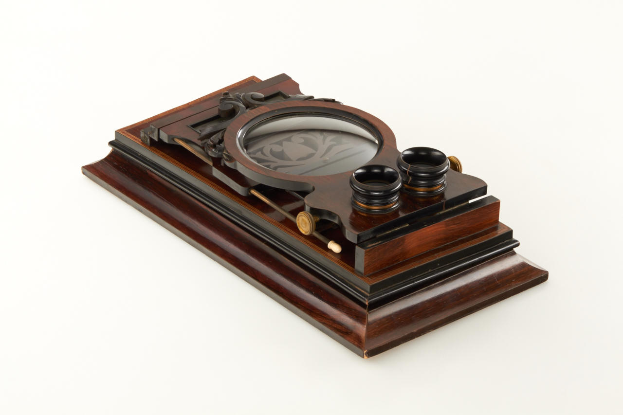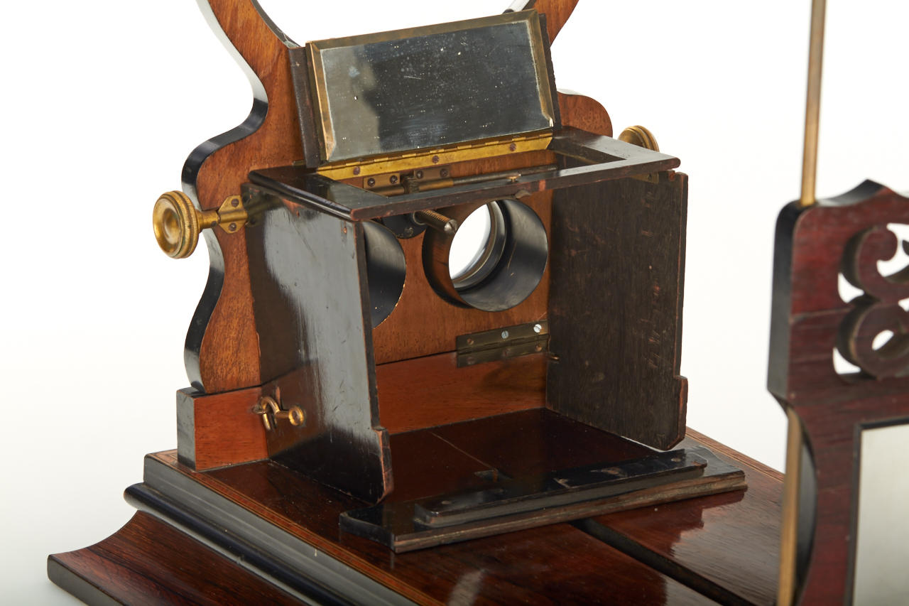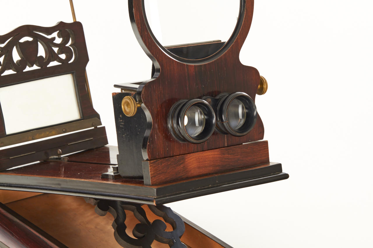 impressively large deluxe French stereo graphoscope with fine wooden veneer and inlays around the edge, lens assembly is ornamented with carving on the top, focusing eyepieces and collapsible dark chamber, in very good condition, lens replaced later with a convex glass, a very attractive display item