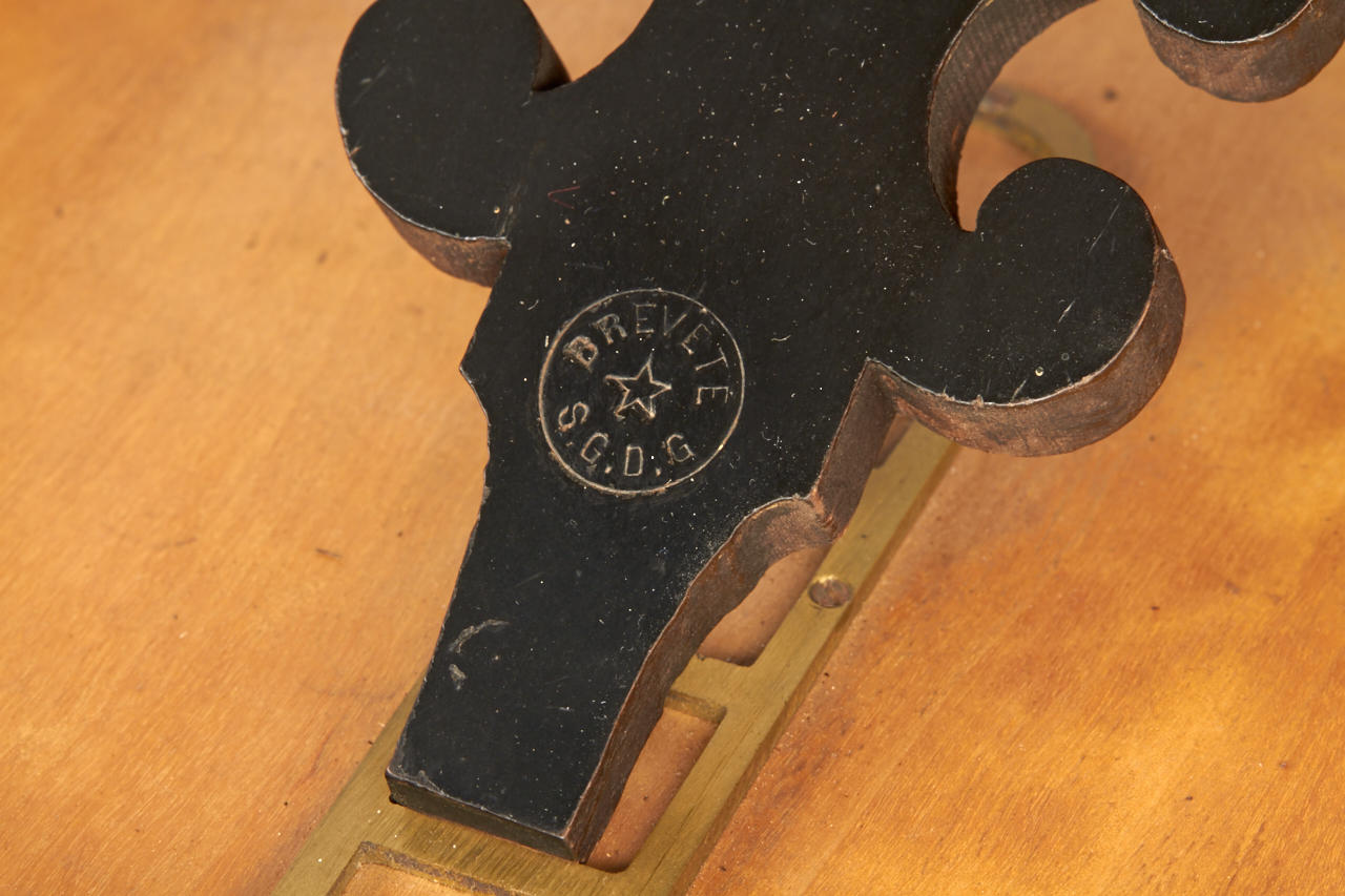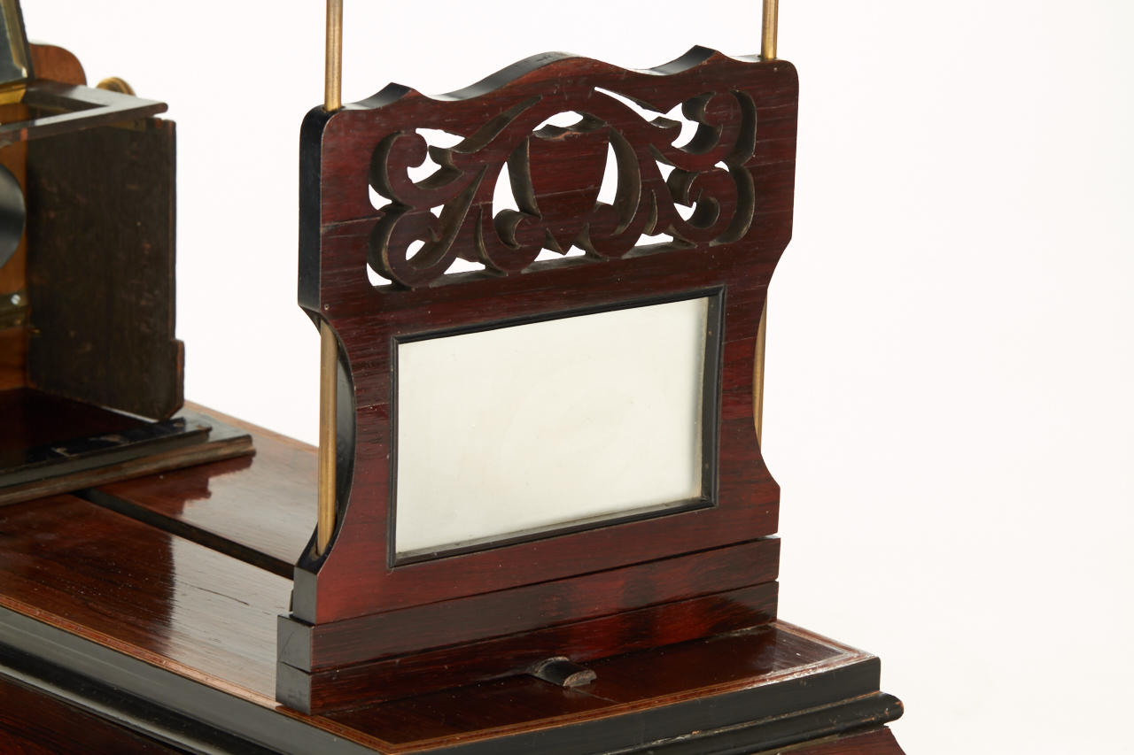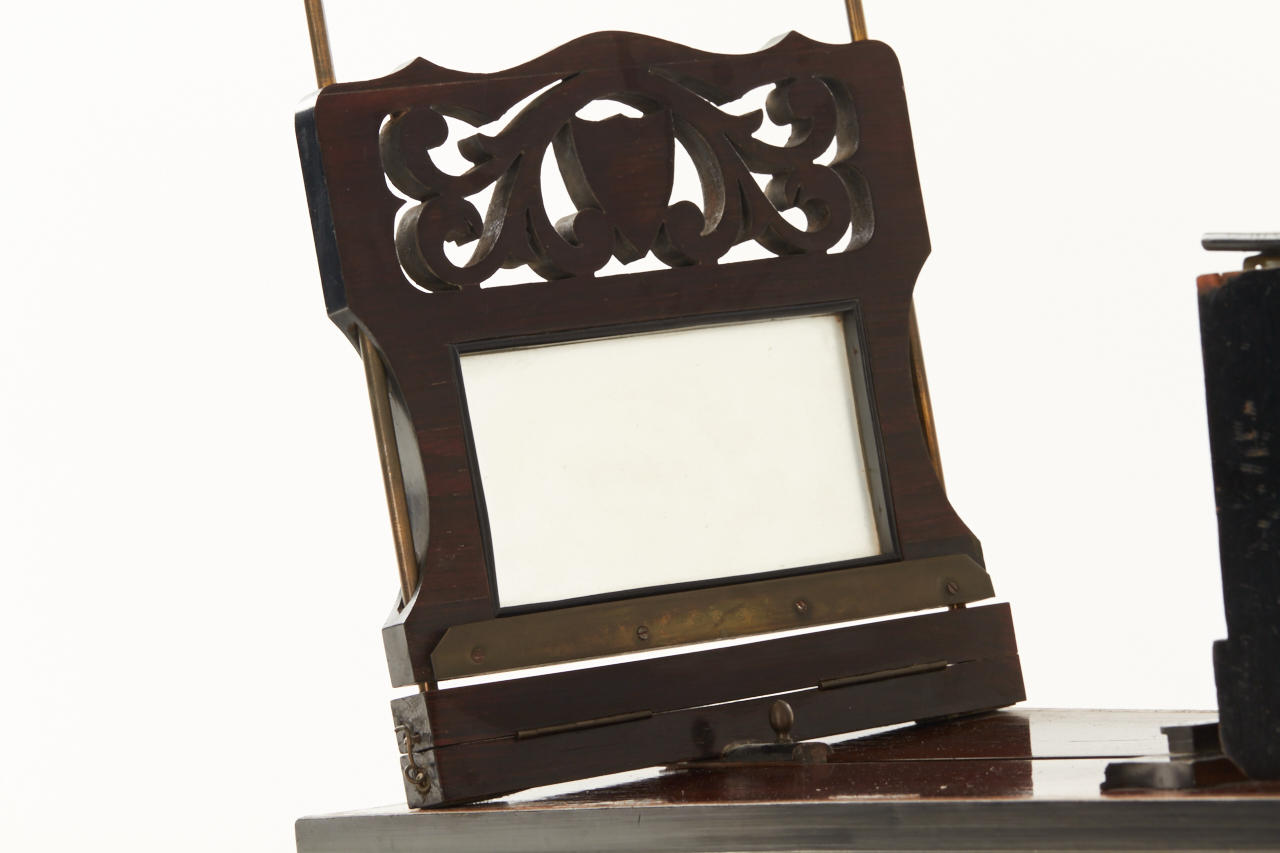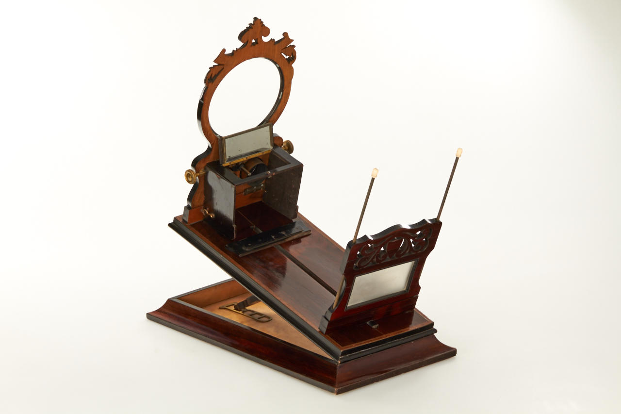 impressively large deluxe French stereo graphoscope with fine wooden veneer and inlays around the edge, lens assembly is ornamented with carving on the top, focusing eyepieces and collapsible dark chamber, in very good condition, lens replaced later with a convex glass, a very attractive display item