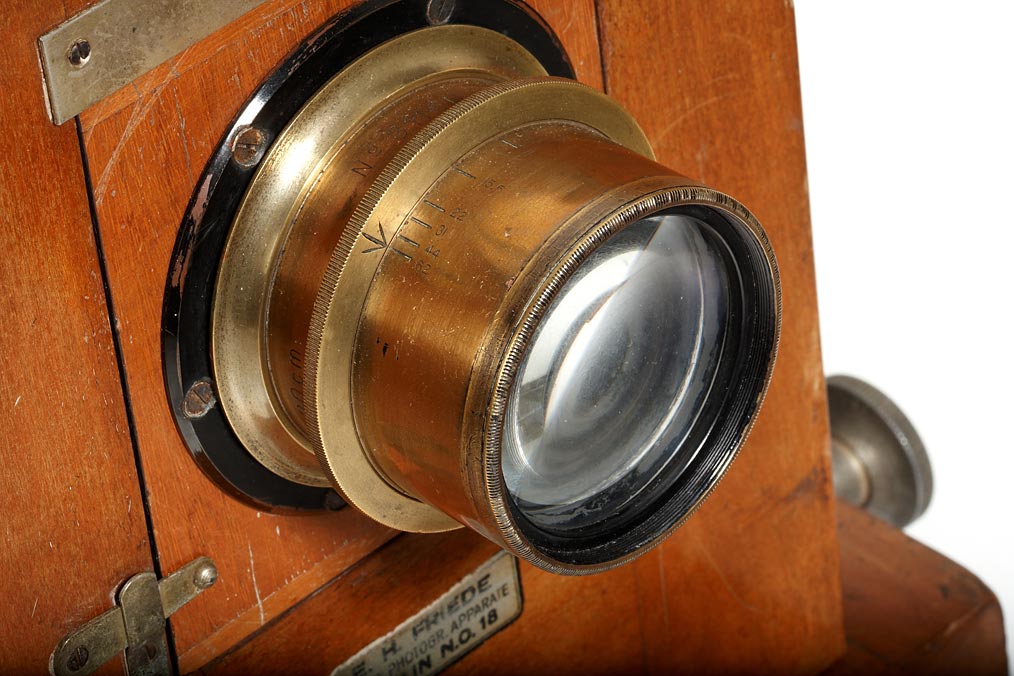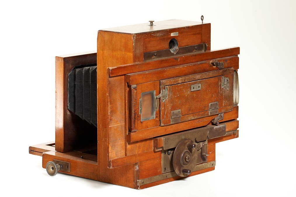 rare German camera especially designed to make identification portraits in a forensic or ethnological context, beautifully crafted walnut wood body, makers label below the lens plate, equipped with a brass bound Rodenstock 6.3/30cm lens, attached to the back of the camera is a specially designed plate holder for four exposures on glass plates in format 4.5x6cm equipped with a crank-activated mechanism to move the plates for the next exposure or to switch to the ground glass on the left side of the sledge. A scarce, almost unknown camera in perfect working order and good cosmetic condition.