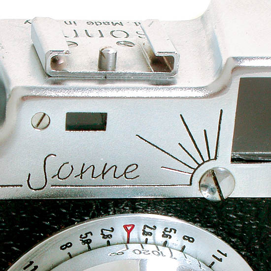 Sonne C4 in mint condition, rarer variation with stylized sun engraved on the front, pat.made in Italy, Xenar 2,8/50, cap, case, original hood in case