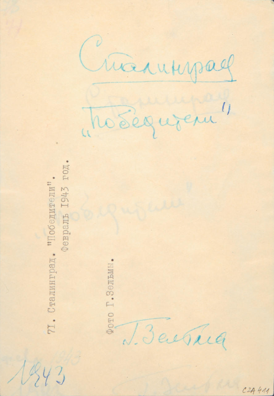 Gelatin silver print, printed in the 1960s, mounted on paper 18,8 x 13 cm Signed, dated and annotated by the photographer in ink on the reverse, signed, dated and annotated by the photographer (Cyrillic) in ink on mounted label, annotated “Stalingrad. “Victors”. February 1943. Photo by G. Zelma” (Cyrillic) with typographic description on the label PROVENANCE Howard Schickler Fine Art, New York