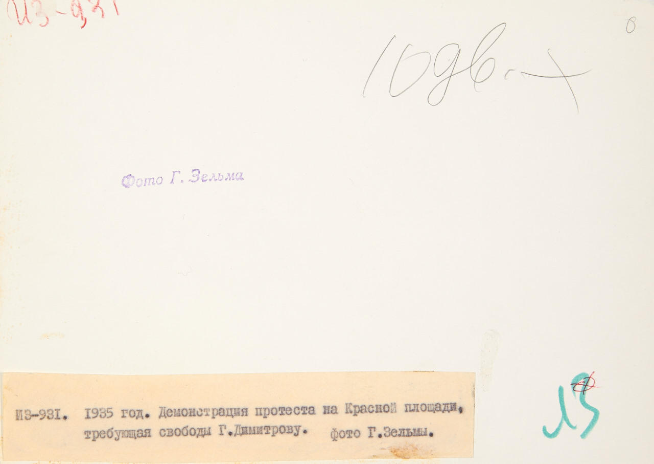 Gelatin silver print, printed in the 1960s 16,3 x 23 cm Photographer’s stamp on the reverse, annotated “1935. Protest on Red Square, demanding the release of G. Dimitrov. Photo by G. Zelma” on mounted label with typographic description on the reverse PROVENANCE Howard Schickler Fine Art, New York