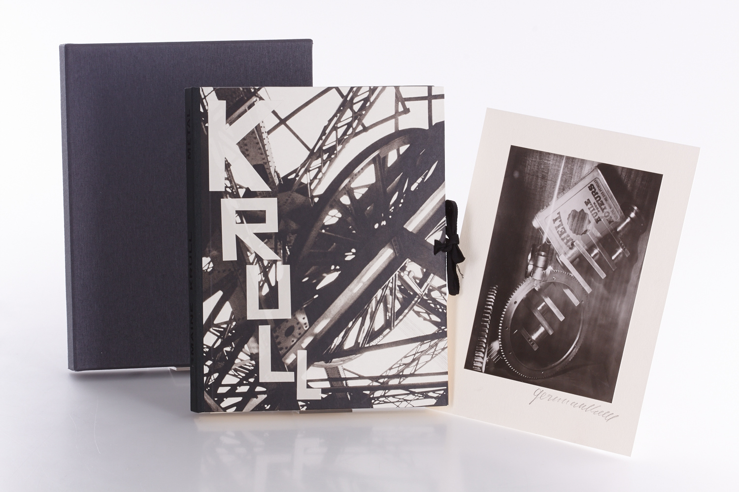 Special edition with original gelatin silver print by Germaine Krull, limited to 50 copies, edition no. 23/50 (photo ‘Shell’, 1929; printed 1978, 16 x 21,3 cm (6.3 x 8.4 in), signed and stamped by Krull) Brilliant reprint of the 1928 book, original half-cloth portfolio with 64 black and white photographs on plates in slipcase