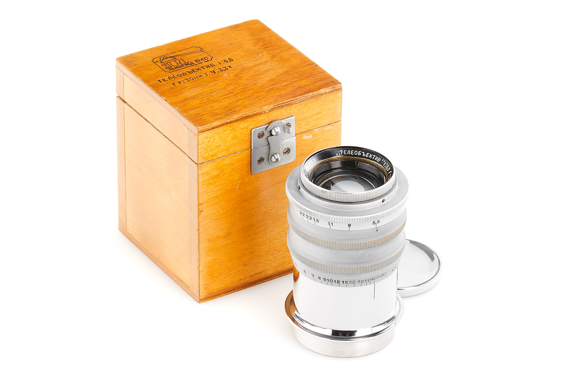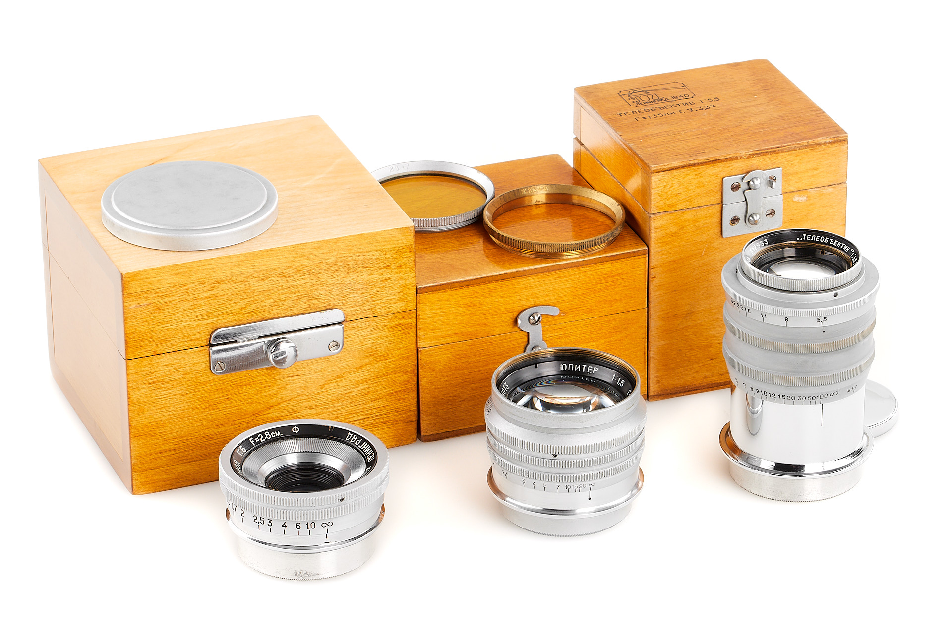 An amazing kit of three prototype lenses by GOI Leningrad in coupled M39 mount! The set includes an extremely rare GOI Orion 6/2.8cm no.44044128, GOI Jupiter 1.5/5cm and GOI Teleobjektiv 5.5/135mm. All three lenses are in beautiful, near-mint condition, all are machined to very high standard, typical for the prototypes made by GOI, each lens comes with an original, fitted wooden box. It is a rare opportunity for a collector of Soviet equipment and rare lenses in Leica mount.