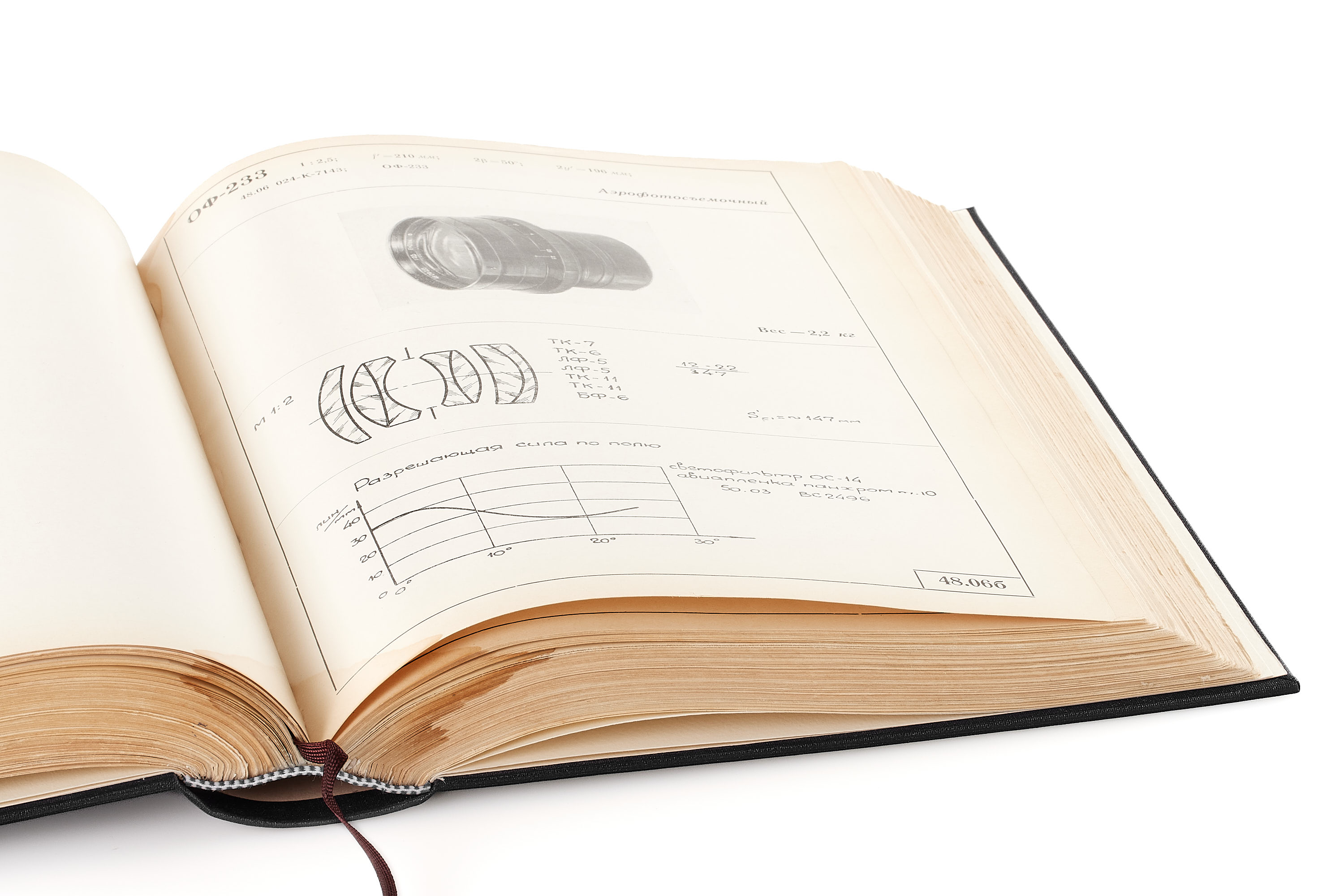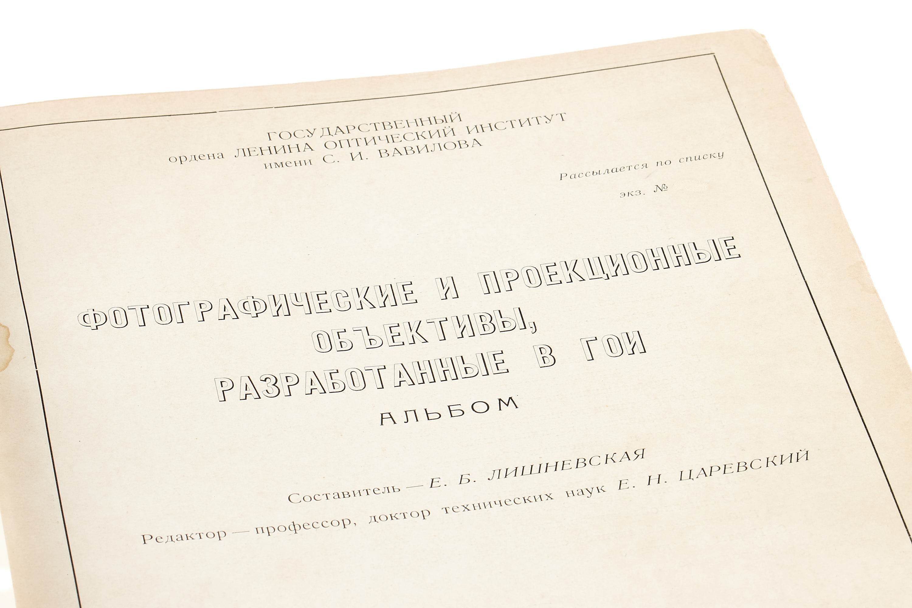 The famous Bible of the GOI lenses - a large book describing all prototypes and serial production lenses made, including photos, drawings of the optical formula and technical specifications, in very good condition, the title says 'GOI Photographic and Production Lenses', original issue from 1964 in very good condition, all pages present and undamaged, the serial number of this example has been scratched off, only a few are known to exist, it is a must-have for a collector of rare Soviet lenses!