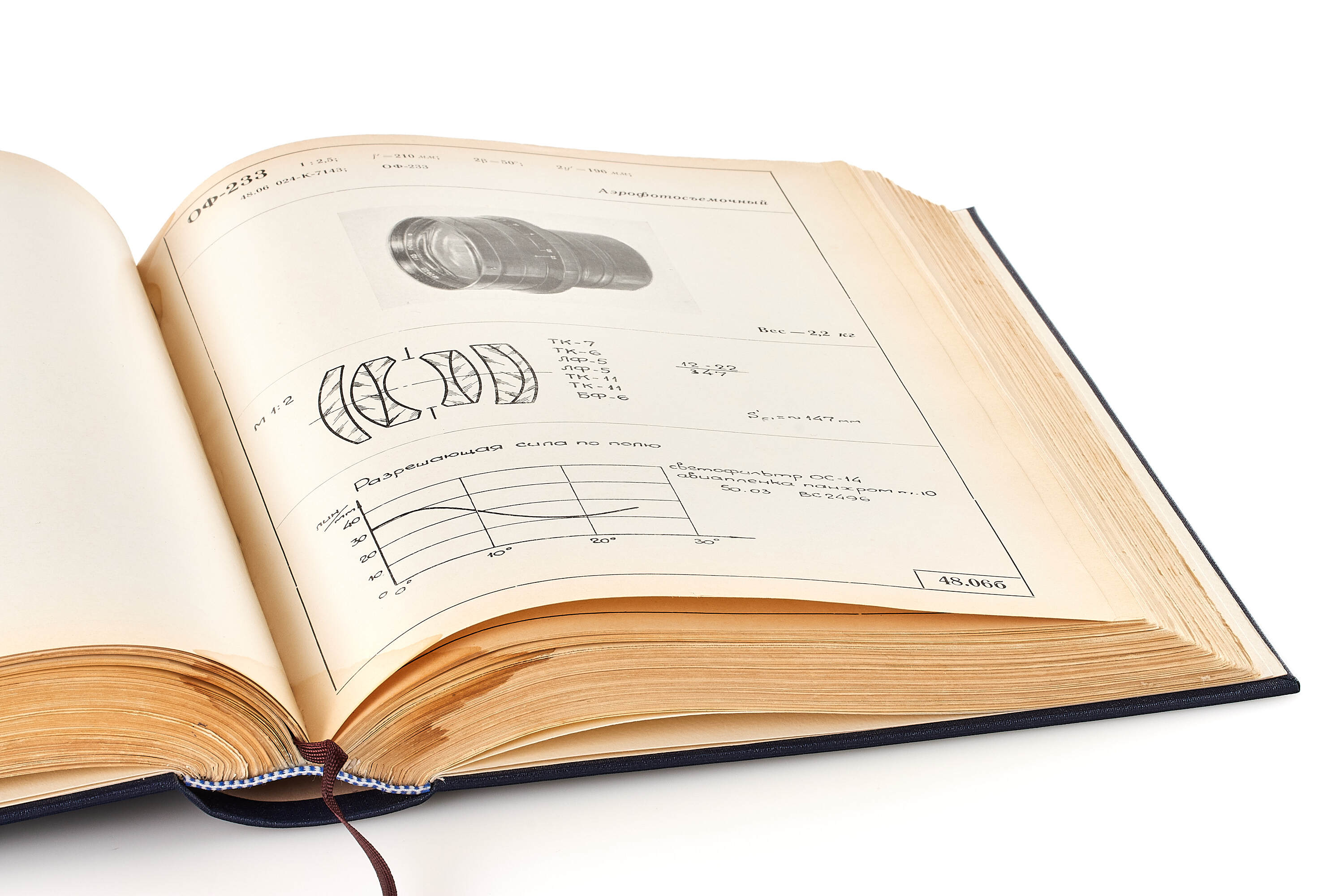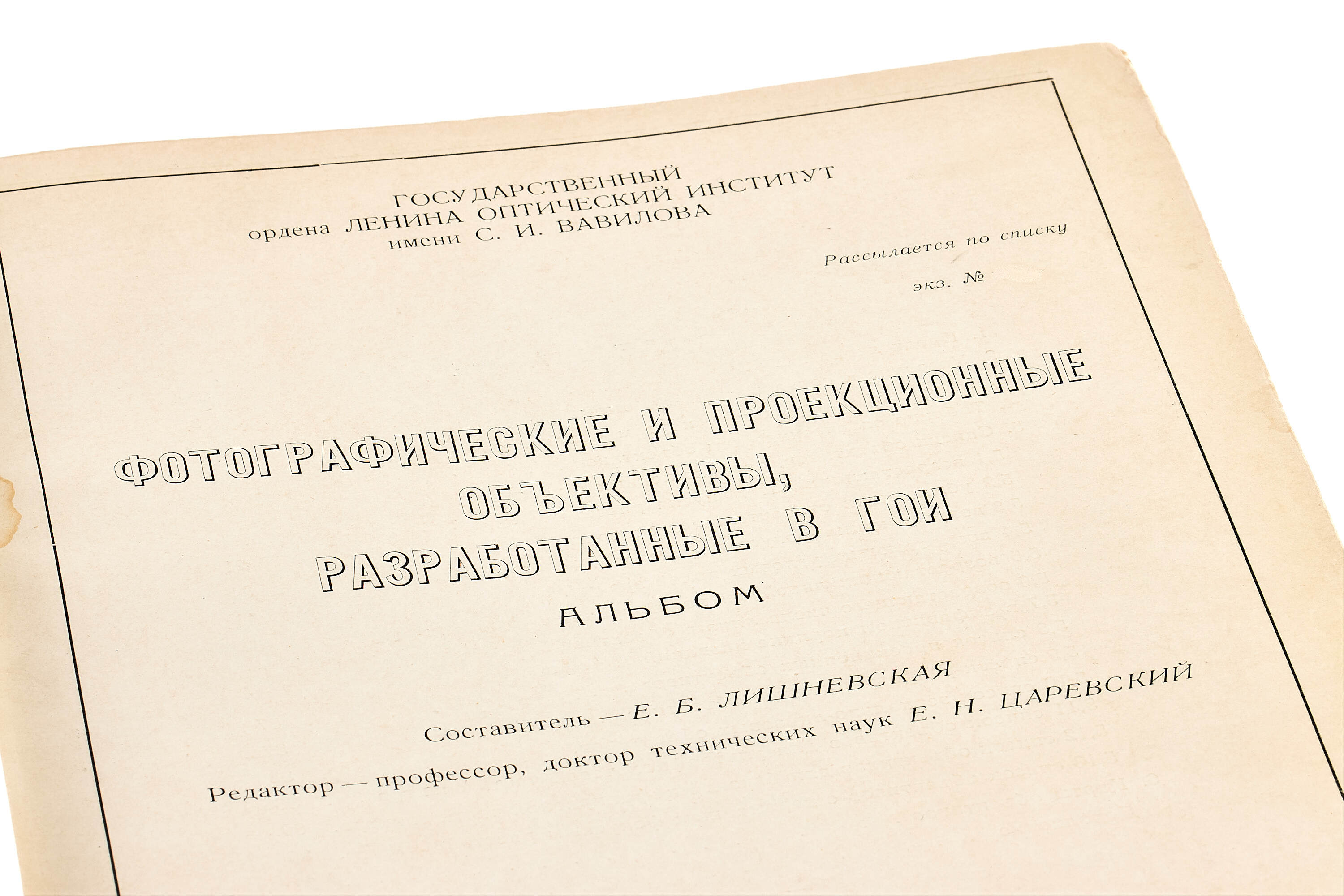 The famous Bible of the GOI lenses - a large book describing all prototypes and serial production lenses made, including photos, drawings of the optical formula and technical specifications, in very good condition, the title says 'GOI Photographic and Production Lenses', original issue from 1964 only a few are known to exist, in very good condition, all pages present and undamaged, the serial number of this example has been scratched off, it is a must-have for a collector of rare Soviet lenses!