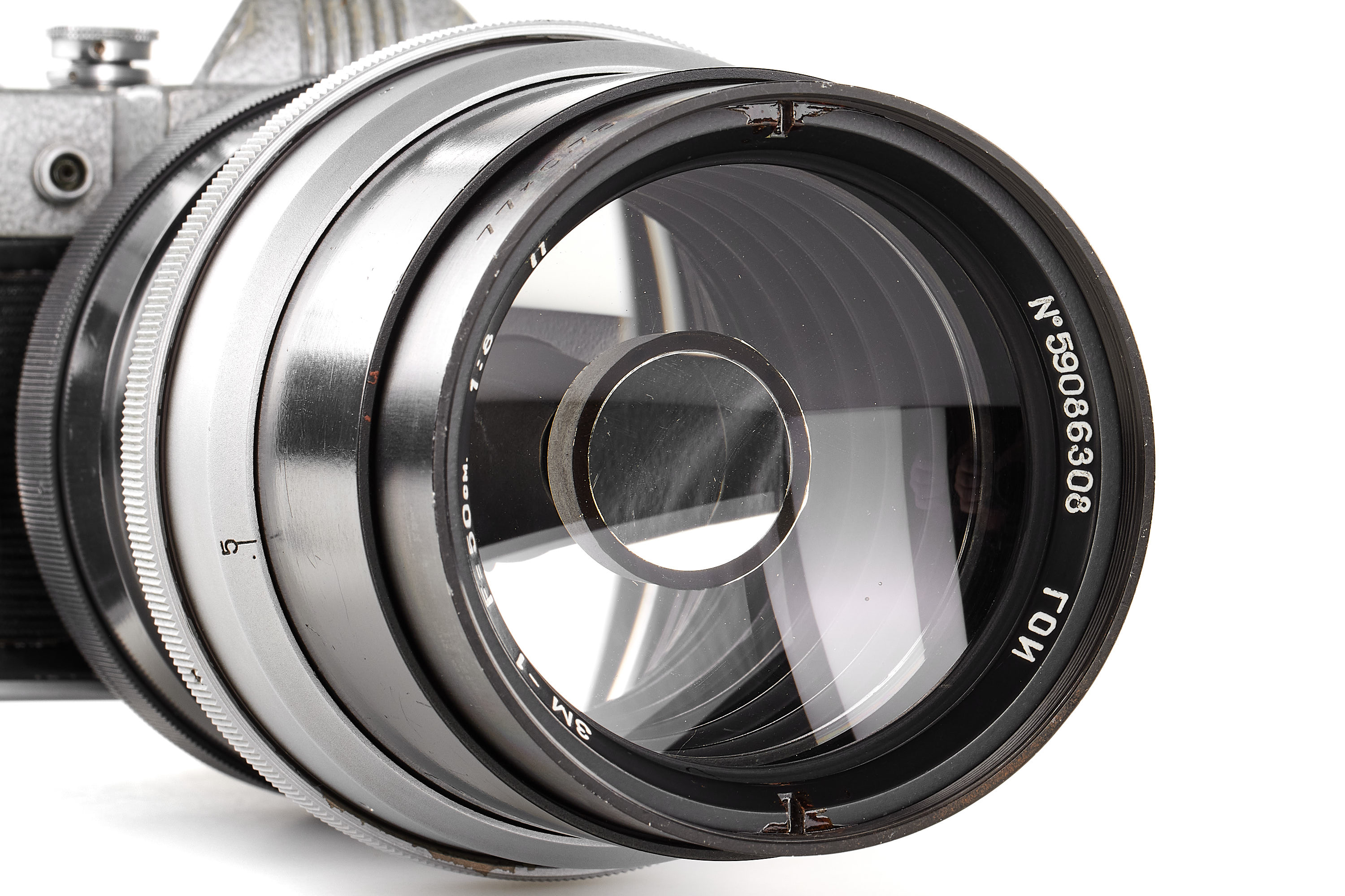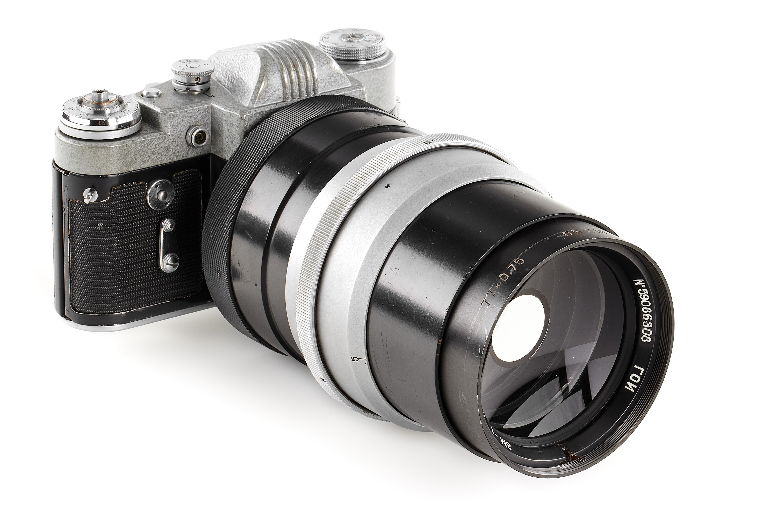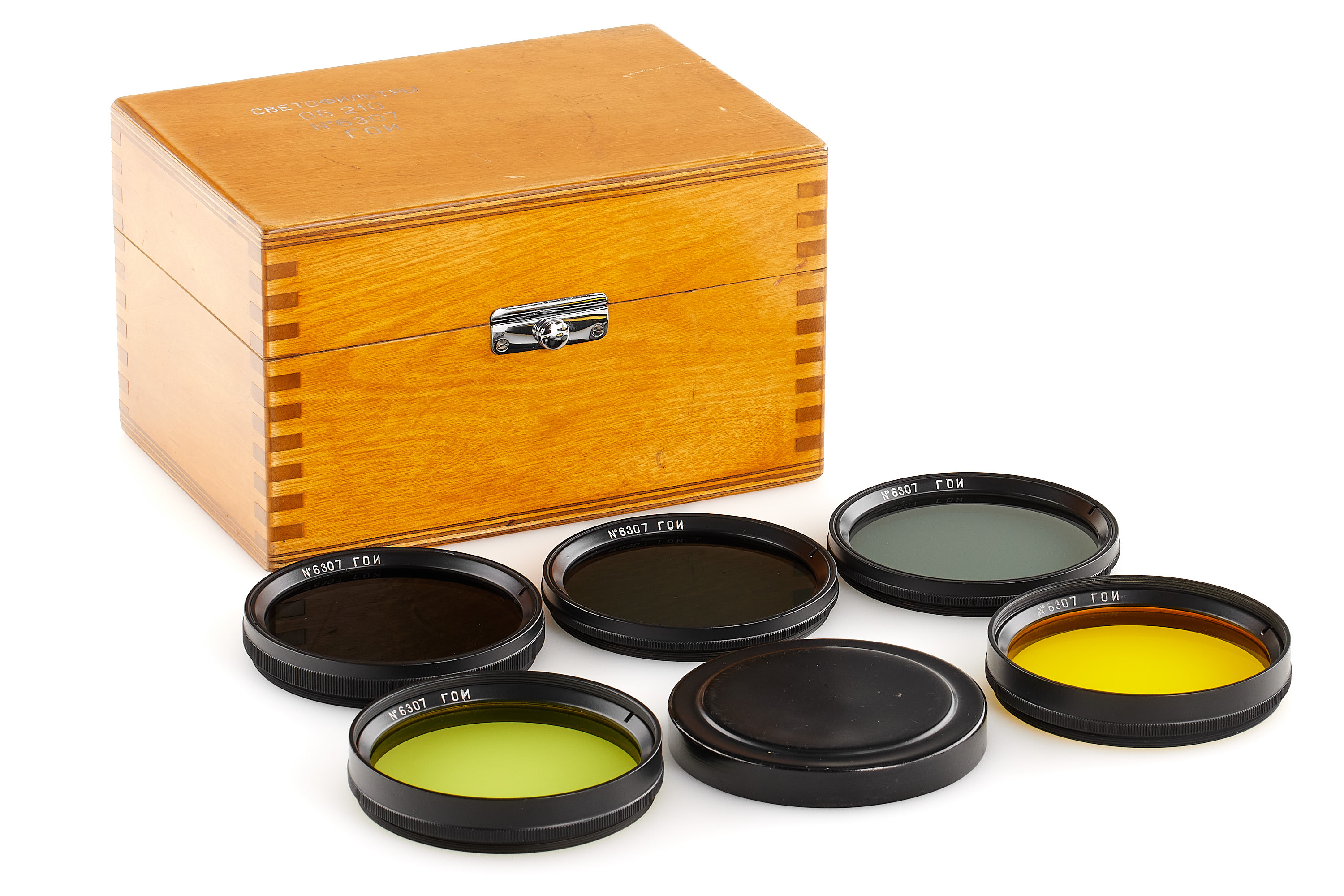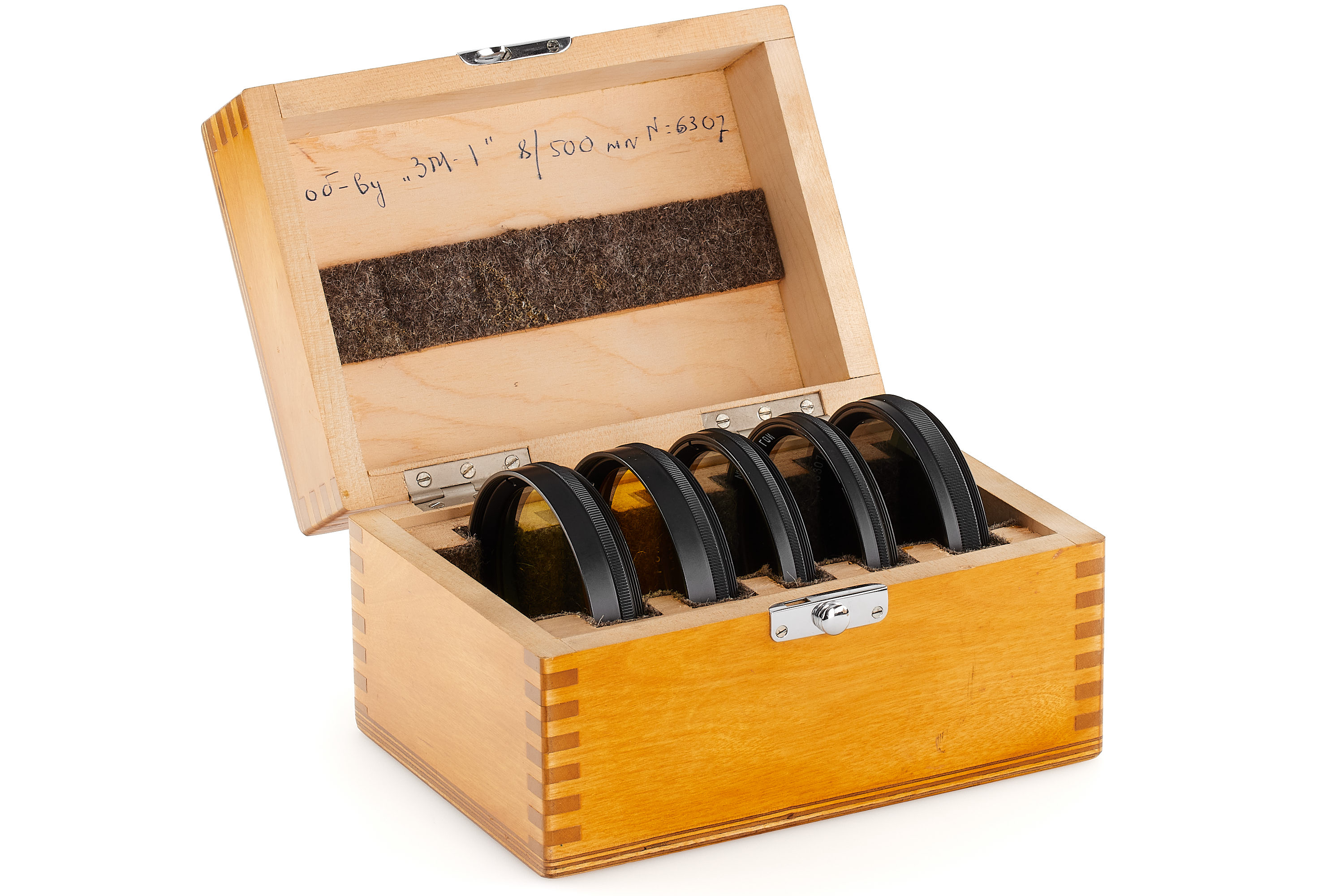 Extremely rare GOI OB-210 8/50cm, prototype of the ZM-1 lens, in very good condition, good optics only showing some dust particles, with front lens cap, quite compact mirror tele-lens in M39 mount, together with a set of 5 filters originally used with the prototype lens no.59060307 as can be read on the original GOI factory wooden box, together with 1st version Crystall no.61017547.