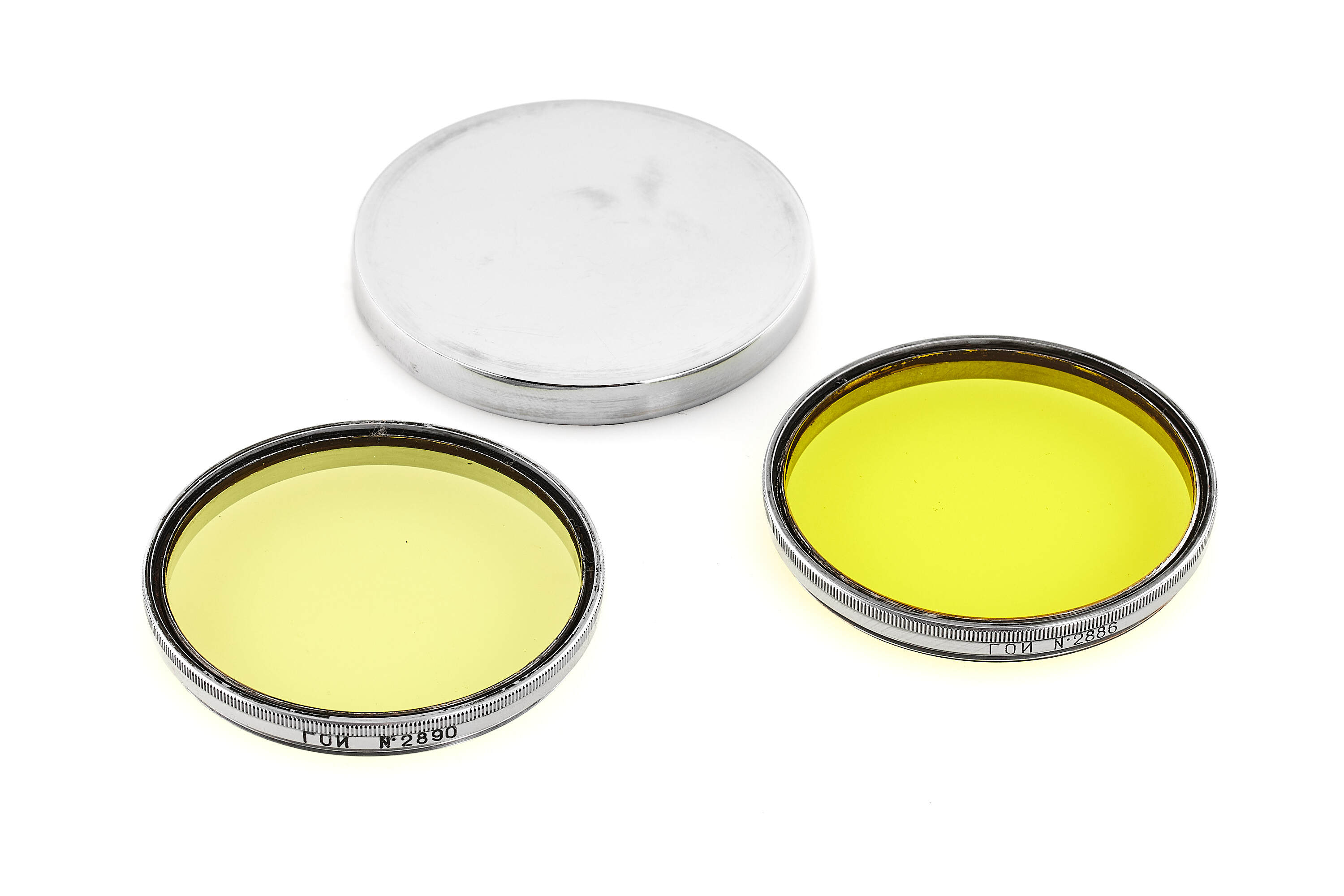 This rare prototype is distinguished by its unusual, bright chrome plating. It is accompanied by its original metal case engraved with the lens serial number, two sun filters housed in a matching metal container bearing the consecutive serial number 2653, and front and rear lens caps in the same bright-chrome finish.
