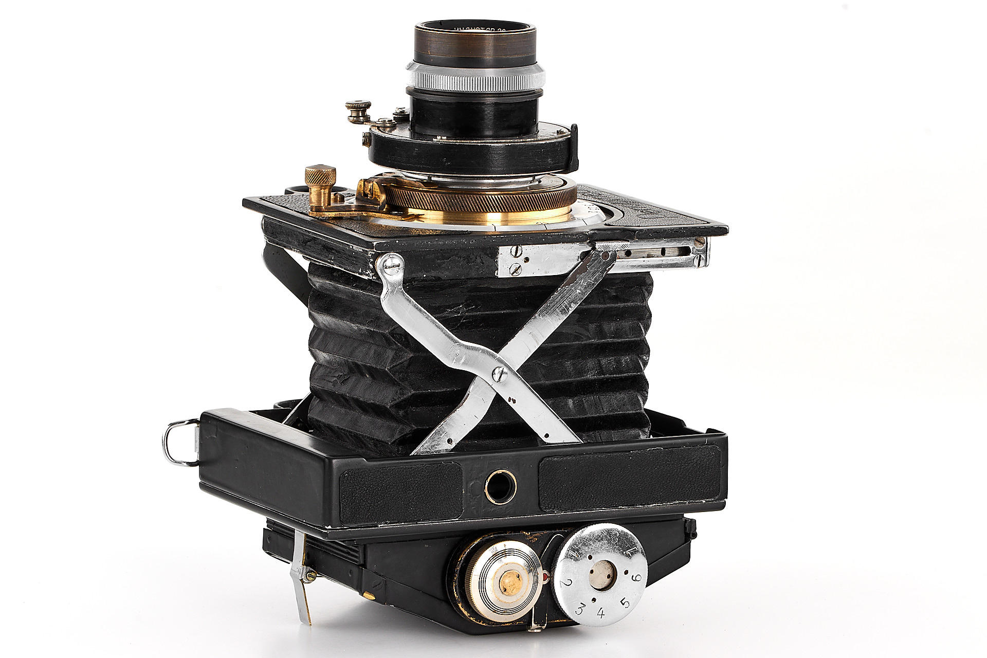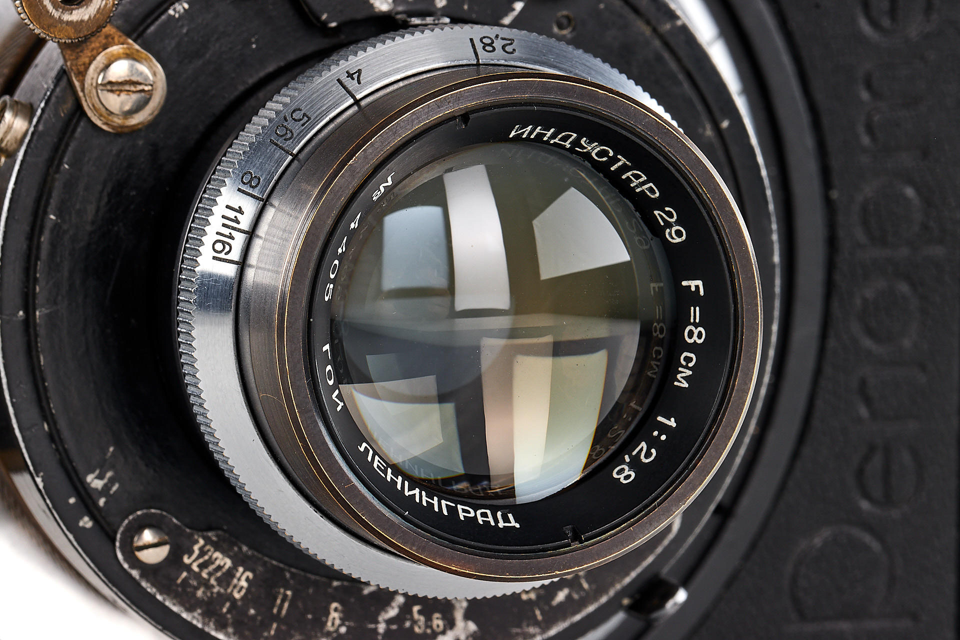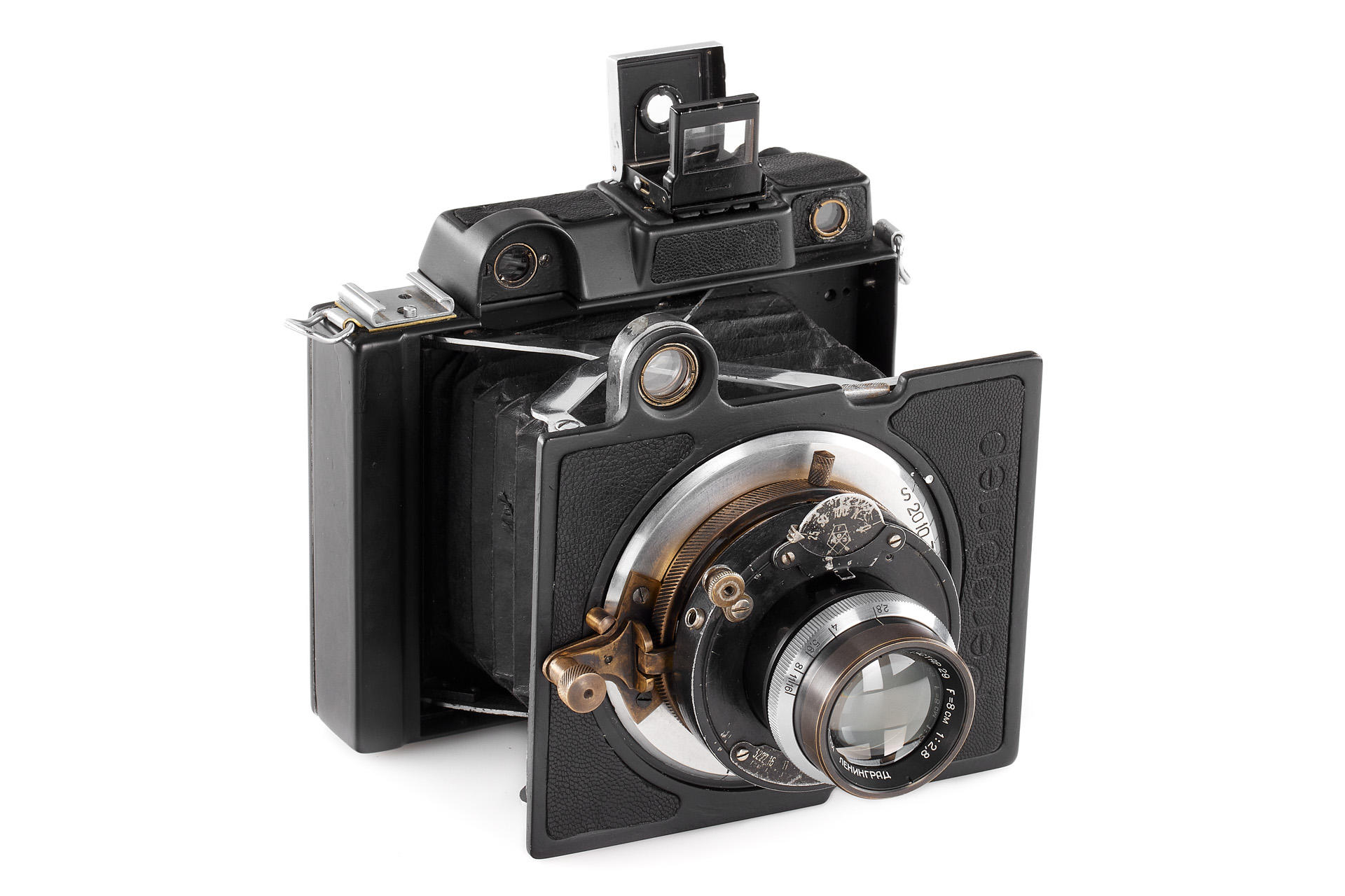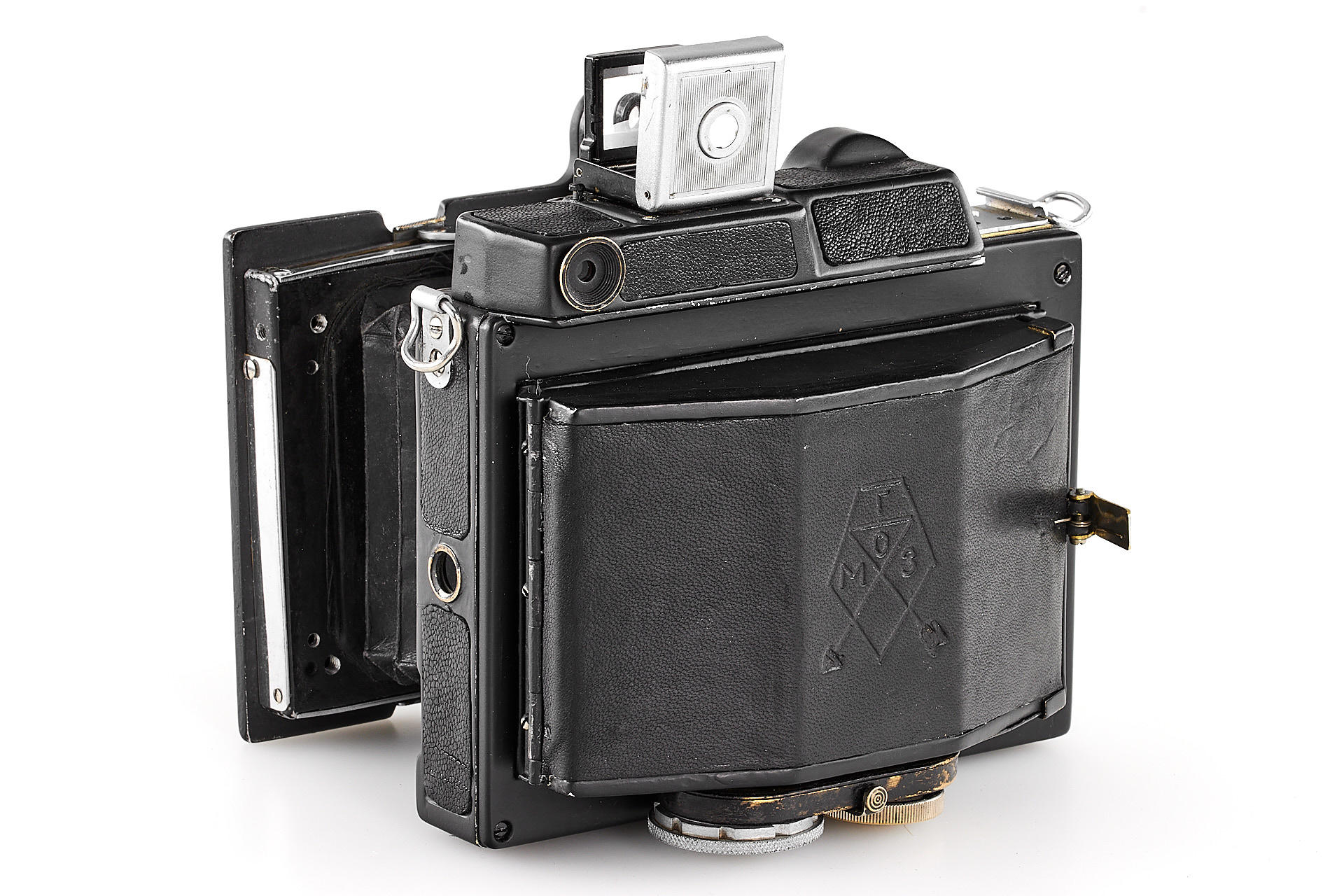 The legendary Reporter camera by GOMZ was a medium format press camera inspired by the Zeiss Ikon Deckrullo-Nettel. It was produced between 1937-1940. After WWII, around 1946-47 GOI factory together with GOMZ tried to reanimate the project by introducing an upgraded version with coupled rangefinder and a central shutter. Only one prototype is known to exist. The offered camera is in excellent condition, it is equipped with a fast, medium format GOI Industar 29 2.8/8cm no.4405 (covering up to 6x9cm). It also comes with a previously unknown rollfilm magazine with the GOMZ logo. It is a very interesting piece from Soviet photo history.
