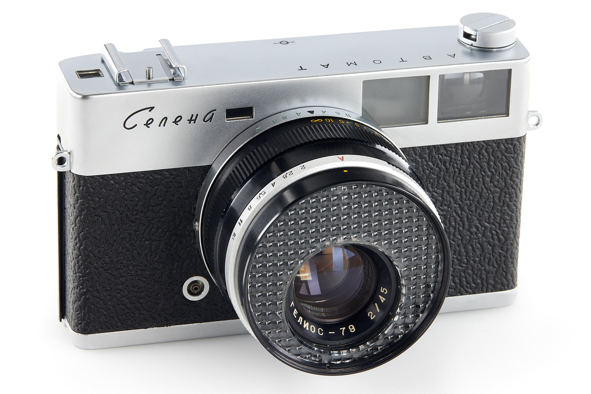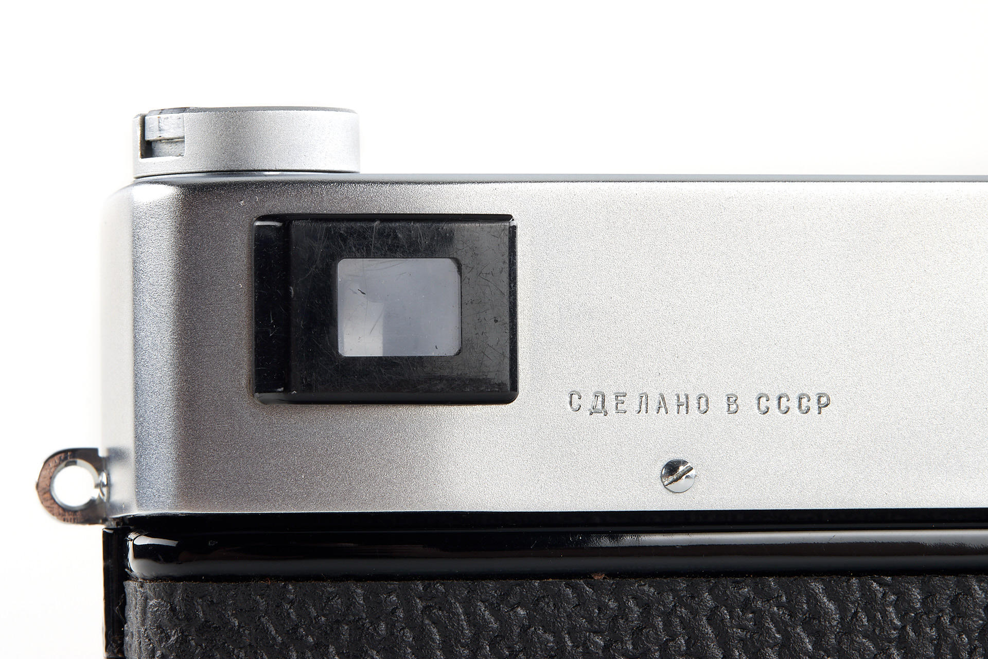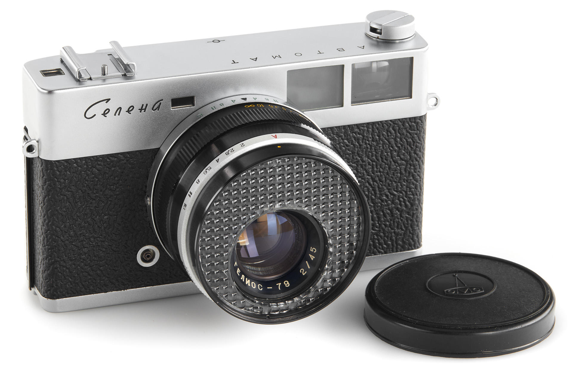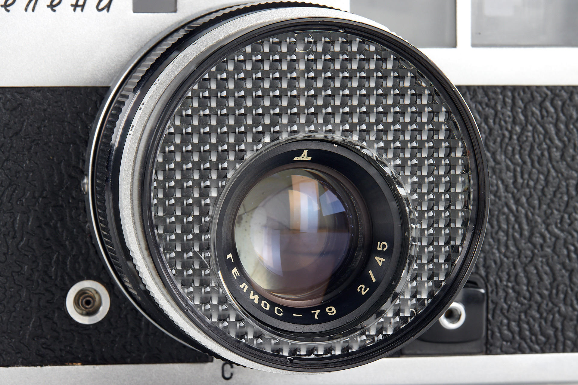 An extremely rare Russian 35mm rangefinder camera in beautiful, near mint condition, Helios-79 2/45mm lens surrounded by a selenium meter cell, in a characteristic, eccentric barrel, reportedly less than 30 examples of this unique-looking camera have been produced, it was never produced in series