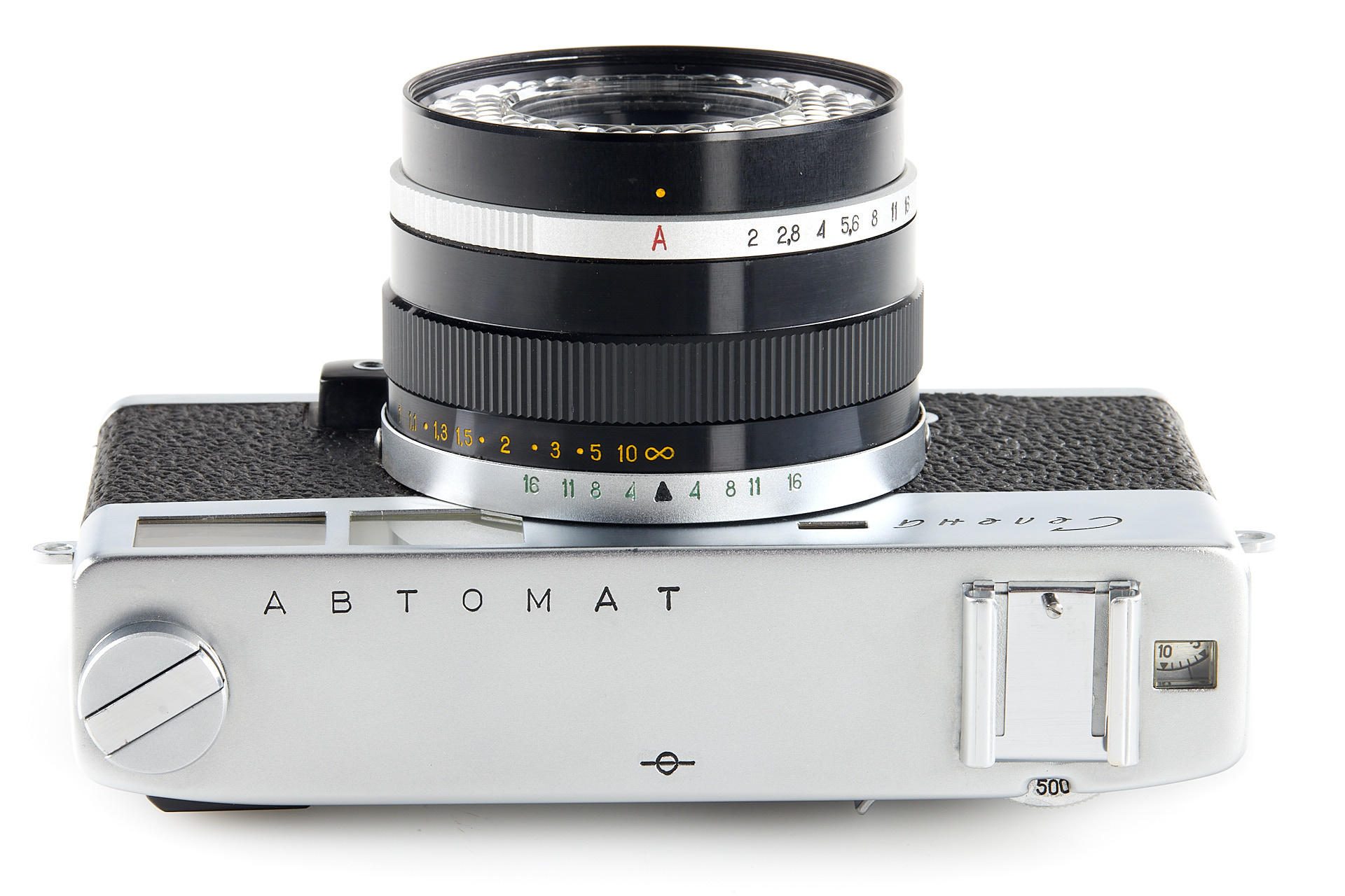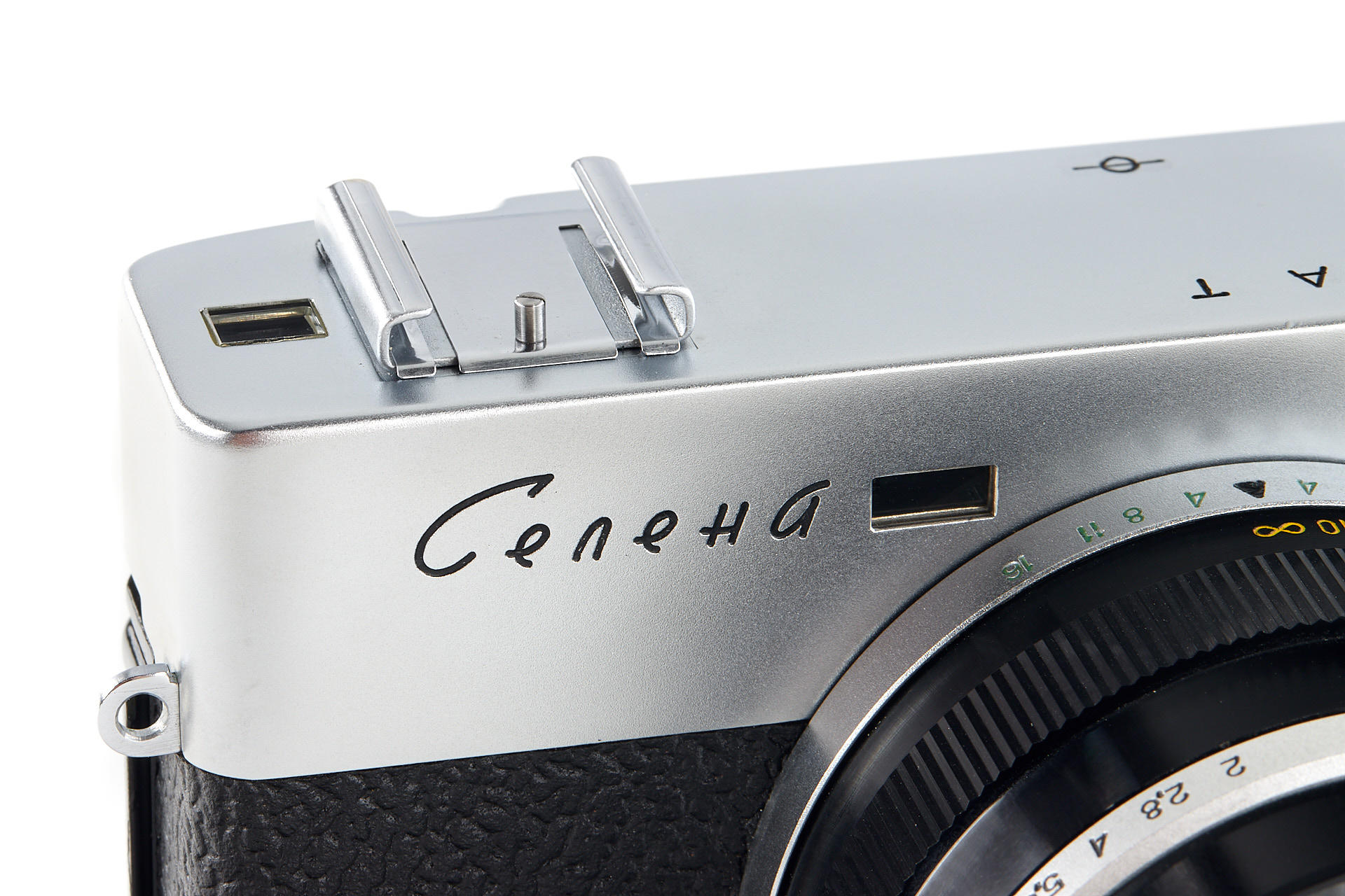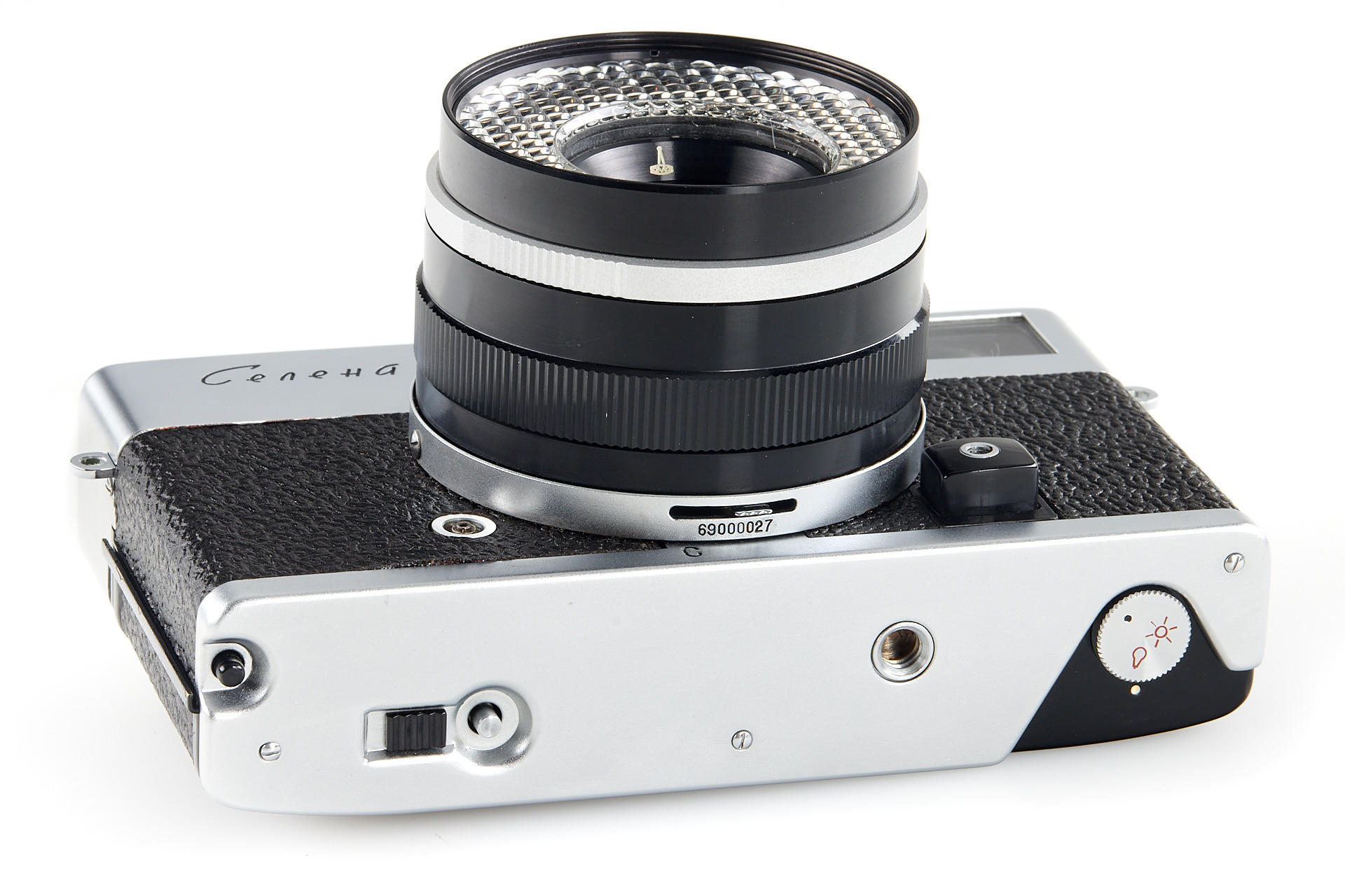 An extremely rare Russian 35mm rangefinder camera in beautiful, near mint condition, Helios-79 2/45mm lens surrounded by a selenium meter cell, in a characteristic, eccentric barrel, reportedly less than 30 examples of this unique-looking camera have been produced, it was never produced in series