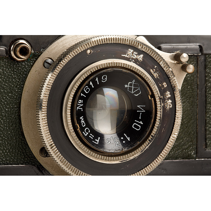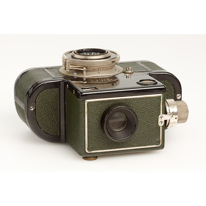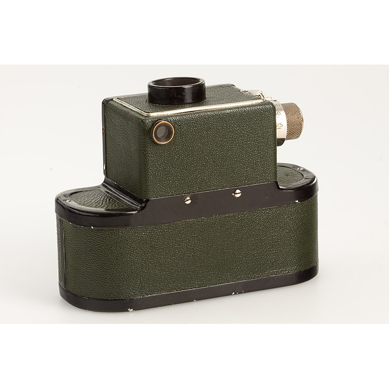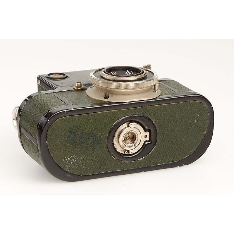 2nd type with original green leather covering, in very fine original condition with yellow logo and nickel fittings, one spool inside, working shutter, very rare variation