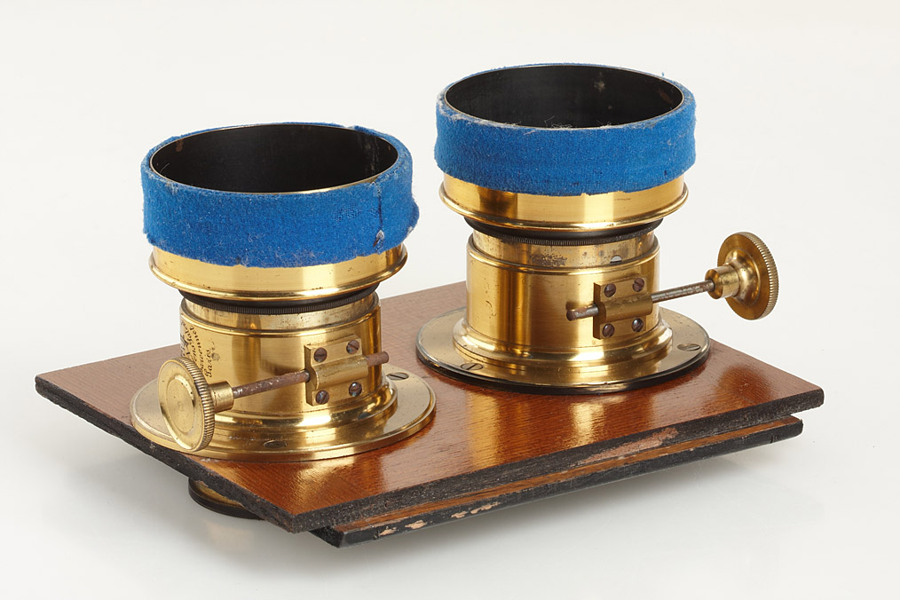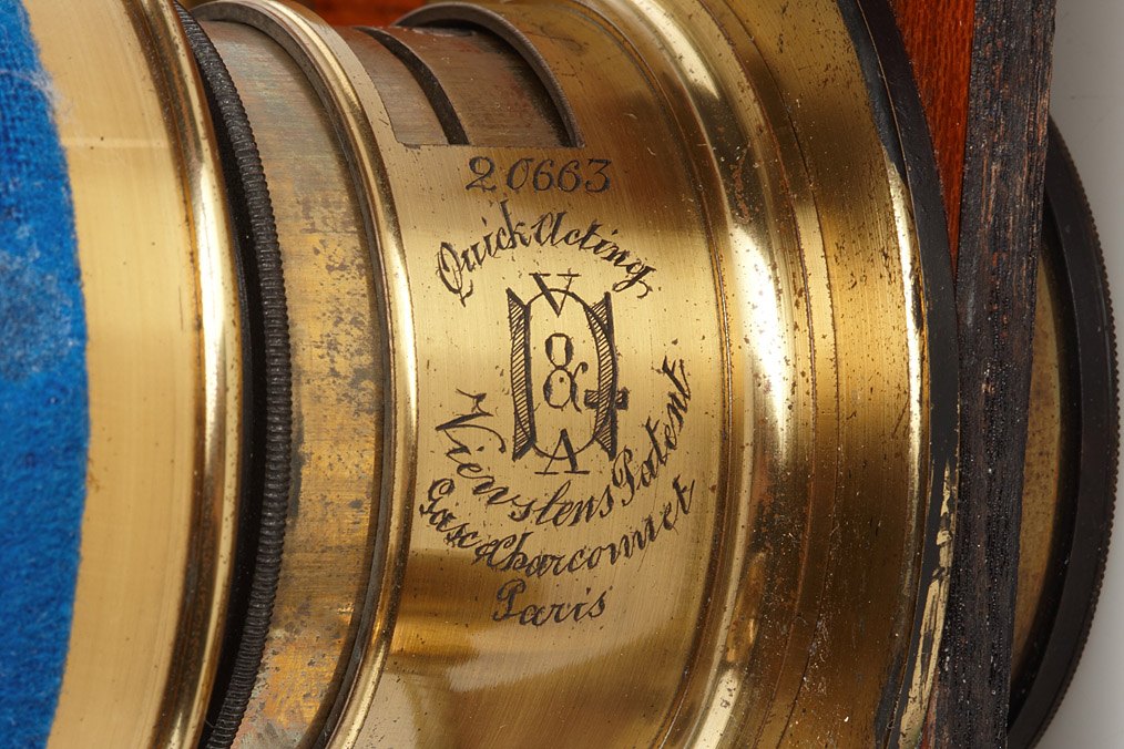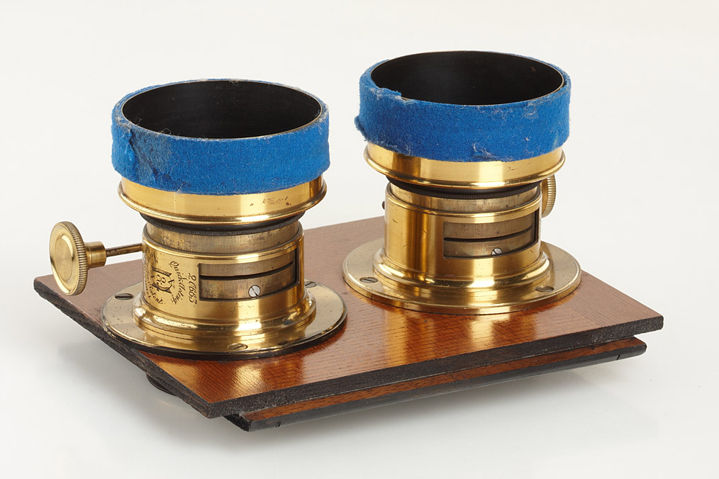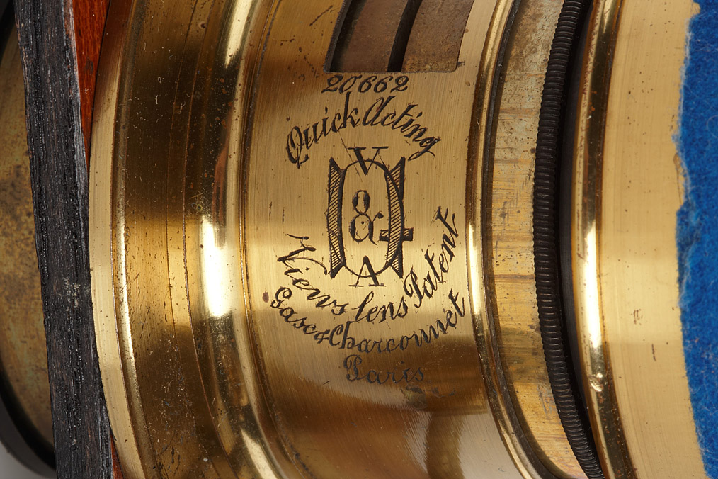 an extremely rare Gasc Charconnet stereo set consisting of a pair of identical rack and pinion brass lenses mounted on a wooden lens board and the matching pneumatic shutter in the original wooden box, two sets of 5 Waterhouse stops each in a leather case.