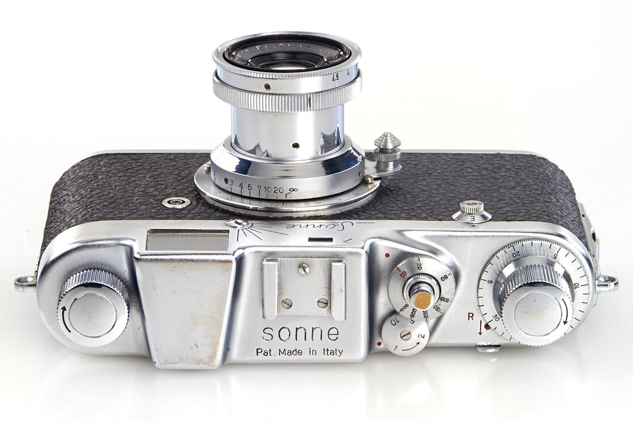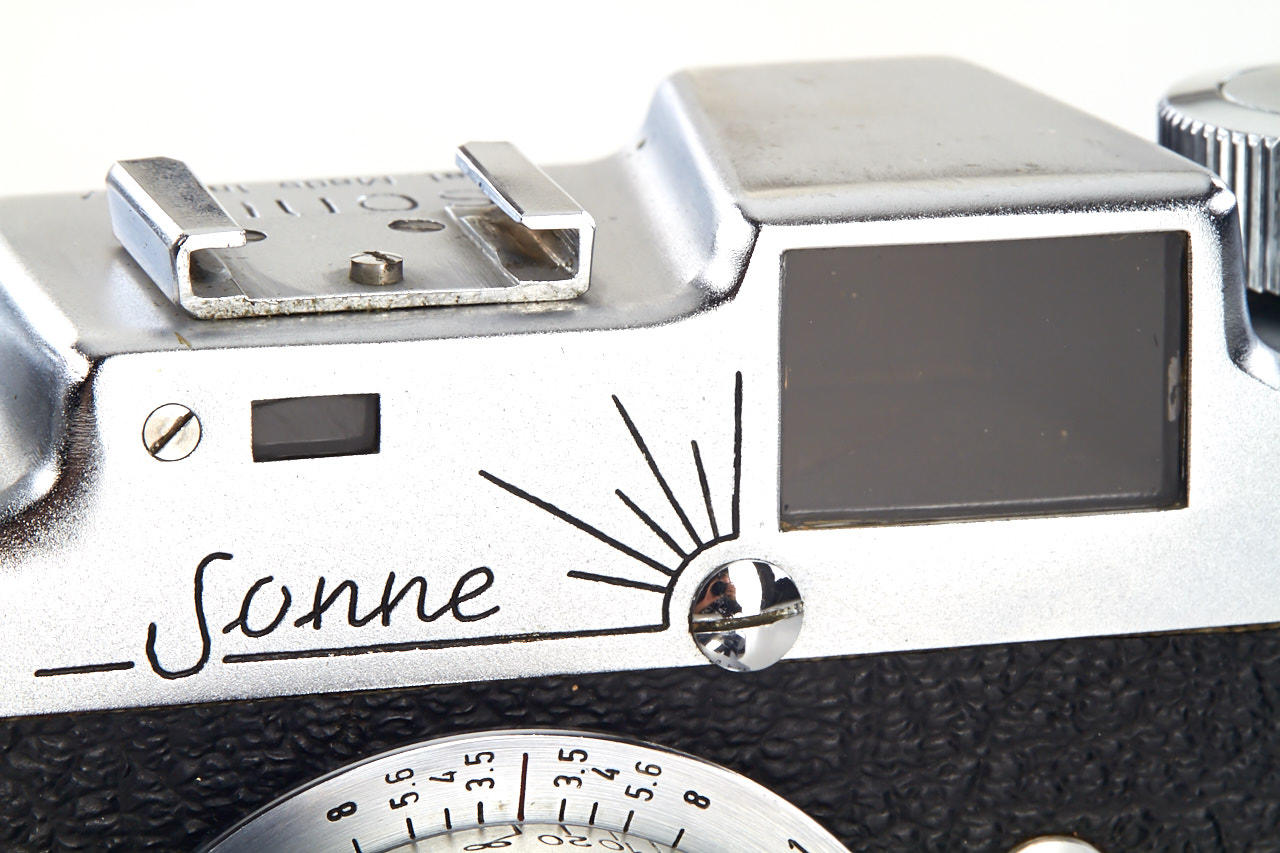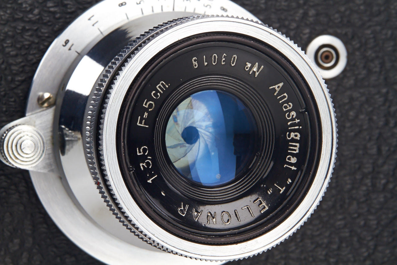 Italian Leica copy, rare variation with stylized sun engraved on front in very good condition, with matching collapsible Elionar 3.5/5cm no.03019