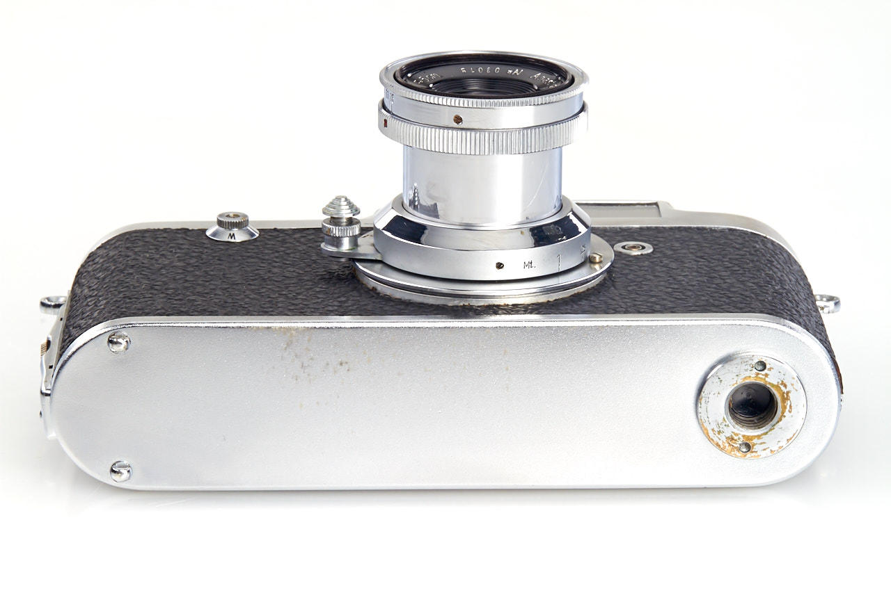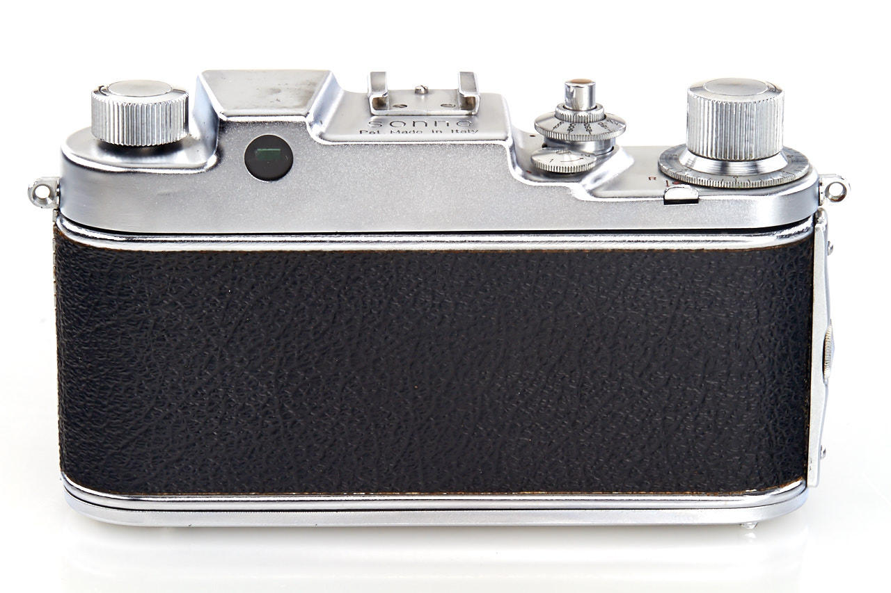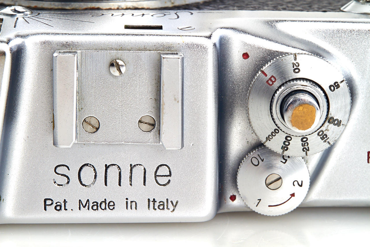 Italian Leica copy, rare variation with stylized sun engraved on front in very good condition, with matching collapsible Elionar 3.5/5cm no.03019