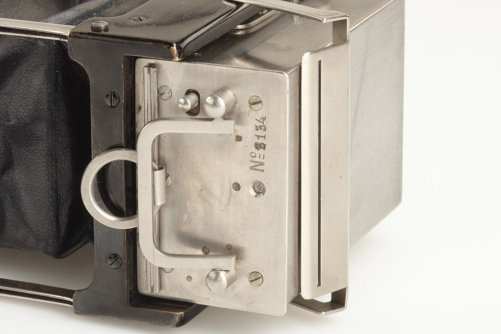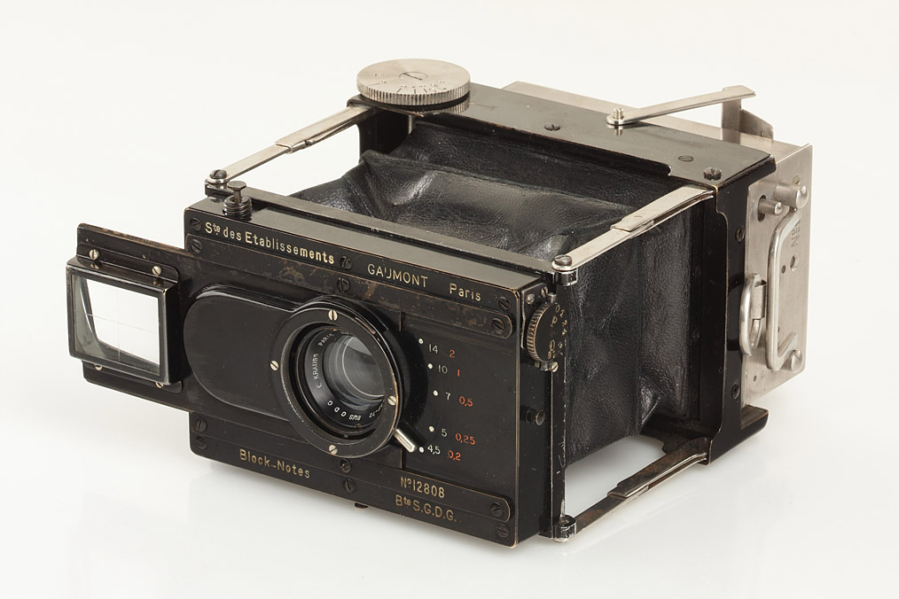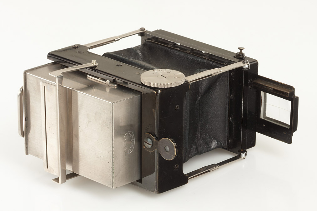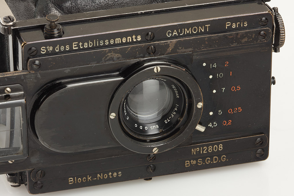 4.5x6cm with Krauss Tessar 4.5/72mm no.119286, in good original condition (missing focusing screen adapter, shutter not operable), plate magazine no.3134, Zeiss Duar filter, instructions, in original Gaumont leather case