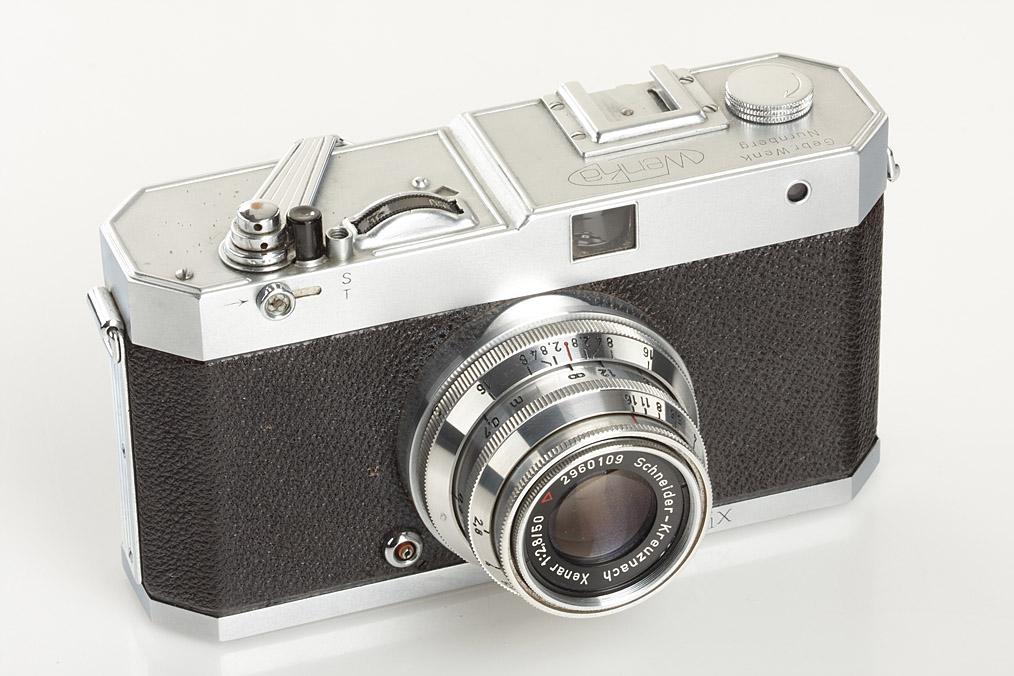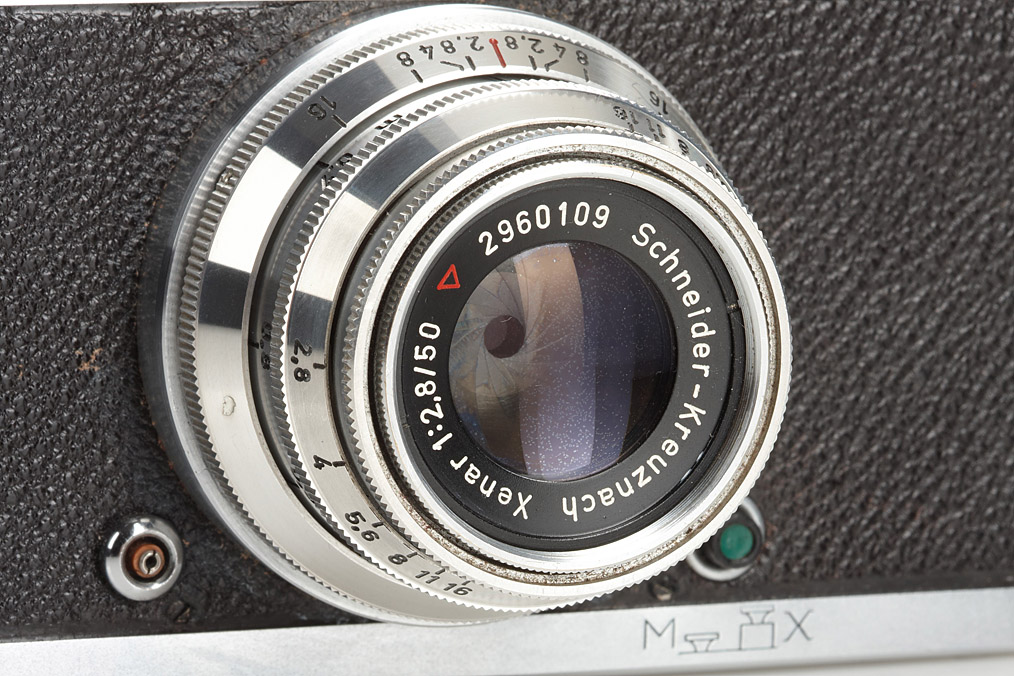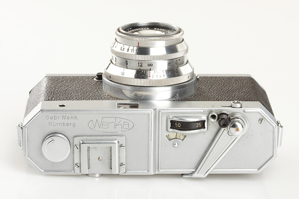 35mm coupled rangefinder camera for 24x30mm exposures, rare last version Wenka II (uncommon in this fine and perfect working condition) with three matching lenses: Xenar 2.8/50mm no.2960109, Westar 3.5/36mm no.126891 (in maker's box), Westar 4.5/100mm no.132719, 4 filters, hood, leather case - very rare outfit