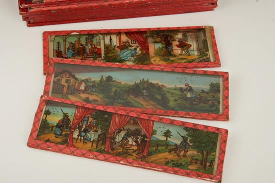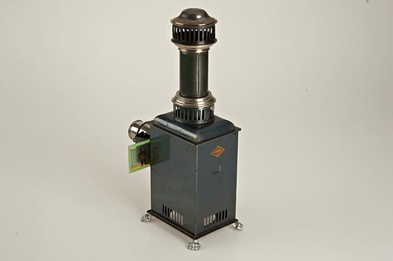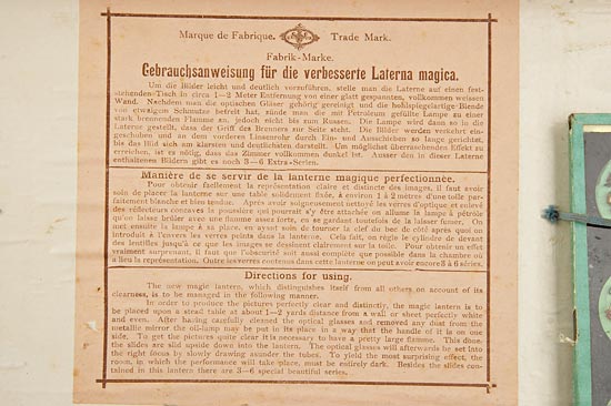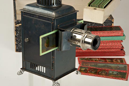 German, the square Russian-iron body on small claw feet, a cylindrical chimney above, all behind a condenser and lens in sliding focusing tube, in original box with maker's instruction label on inside lid, approximately 50 chromolithographed slides and a later electric lamp. 37cm high (a nice toy lantern in excellent condition with a large selection of slides)