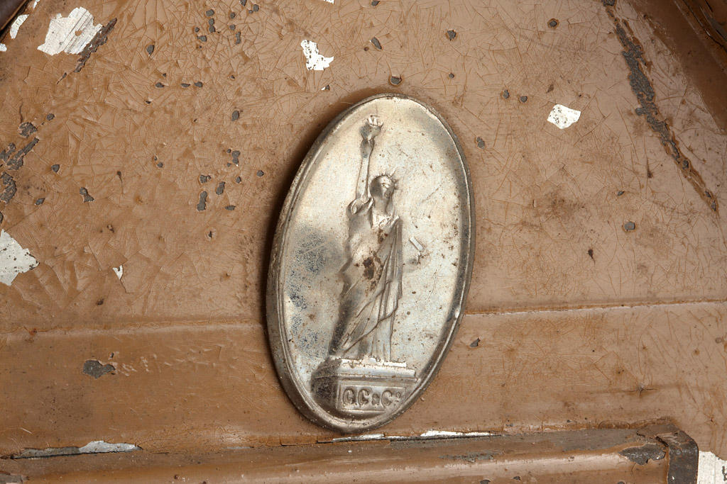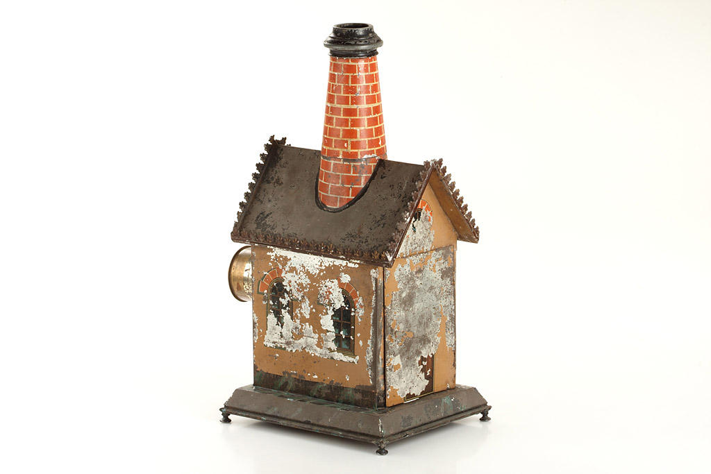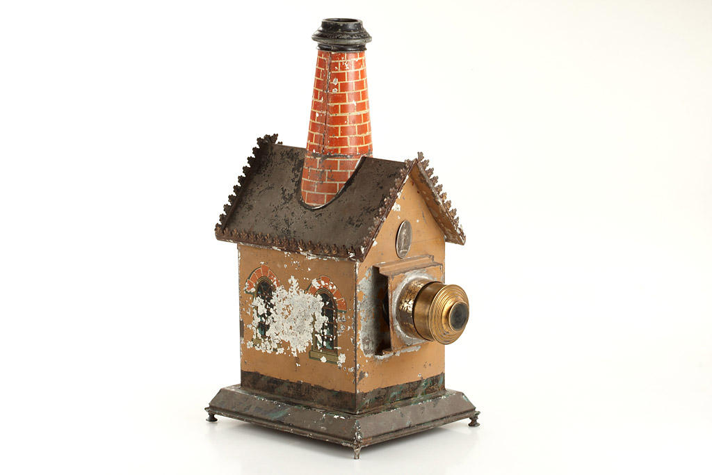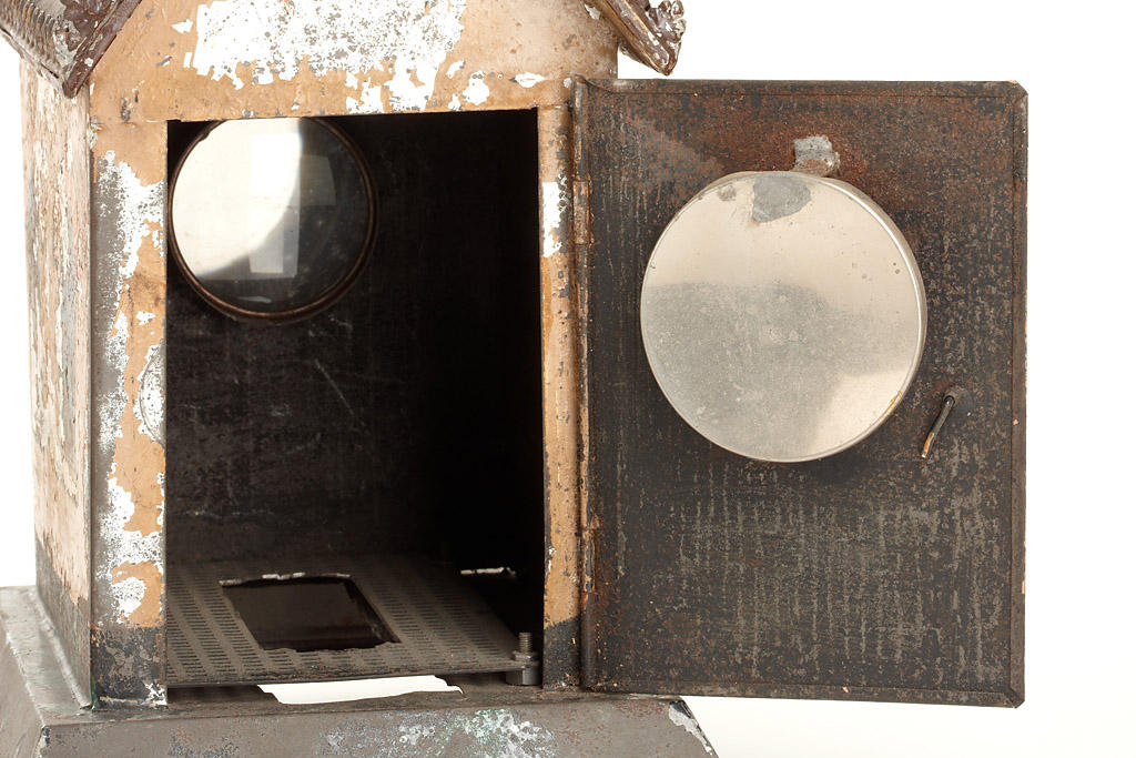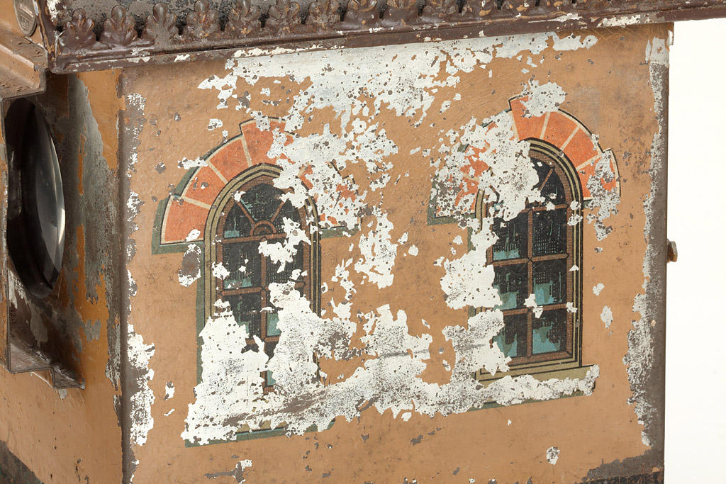 rare and beautiful lantern in the shape of a factory made by George Carette of Nuremberg, mounted on the front the makers label 'G.C.&Co.' with an embossed image of the Statue of Freedom, painted tin body with printed windows and brickwork, original brass lens, one of the original metal feet has been substituted and it seems that the lantern has been converted to electric illumination once, otherwise in complete and original condition.