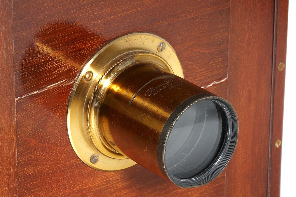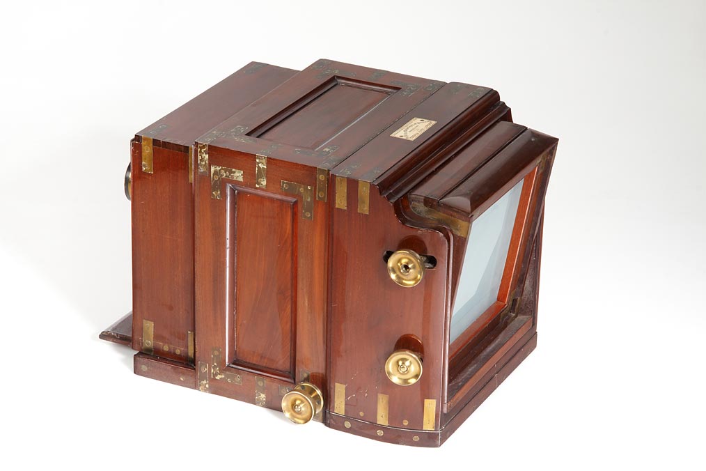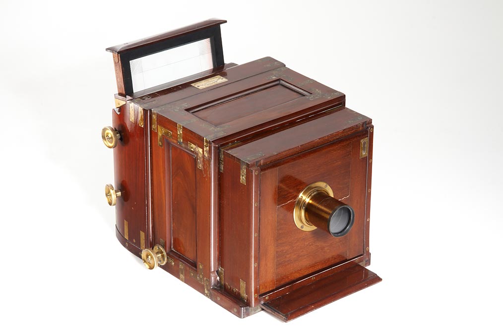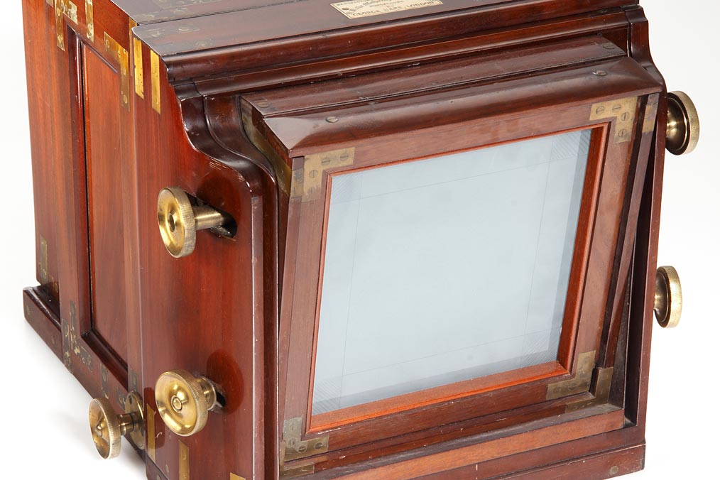outfit of half-plate sliding box camera for wet collodion and dry plates, polished mahogany body, lacquered-brass inset binding strips and fittings, the camera back with rack and pinion horizontal and vertical adjustment with locking screws, removable focusing screen, the top with ivory inset label: MANUFACTURED EXPRESSLY FOR H.H. THE MAHARAJAH OF PUNNAH, BUNDELCUND.BY GEORGE HARE,LONDON. One mahogany 7x9 inch darkslide for wet plate, three mahogany 7x9 inch double darkslides, three mahogany 6.5 x 6.5 inch double darkslides, mahogany flap shutter, five Ross brass lenses (8x5in SA Doublet no.18104, 7 1/4 x 4 1/2in OA Doublet no.18027 with wheel diaphragm, 7 1/4 x 4 1/2in OA Doublet no.17066 with wheel diaphragm and internal shutter, No.1 Cabinet no. 20664 with waterhouse stops, No.2A Extra Rapid no.20845 with waterhous stops), three seperate lensboards, three mahogany tripod legs, various accessories, all in two fitted wooden boxes (the chest for the camera has a silver plate engraved with the coat of arms of the Maharajah + MADE EXPRESSLY FOR H.H.THE MAHARAJAH OF PUNNAH, BUNDELCUND.BY GEORGE HARE, LONDON - this unique and complete outfit made by special order was very advanced for the 1870s. It was acquired by Paul-Henry van Hasbroeck in Calcutta in 1975 and is illustrated on the front page and plate II of his book '150 Classic Cameras', described on pages 33-35, ex Barron collection