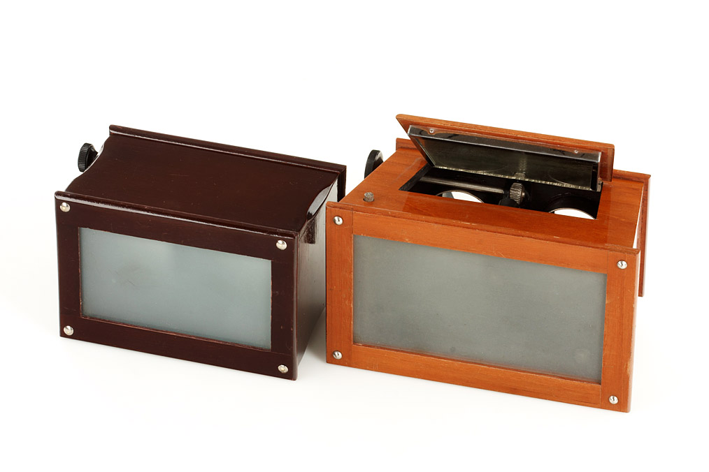 two rare German stereoscopes for various formats and by different makers (1) beautiful ‘Heidoplast’ viewer in almost mint condition, for 45x107 glass slides, wooden body, adjustable focus and eye base, (2) Zeiss Ikon stereoscope for 6x13 slides and cards in nice original condition, wooden body, hinged mirror, adjustable focus and eye base. A nice and collectable selection of high quality viewers from the 1920's. (2)