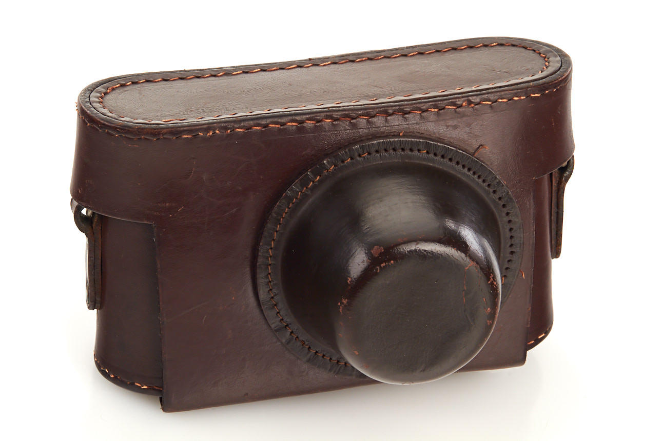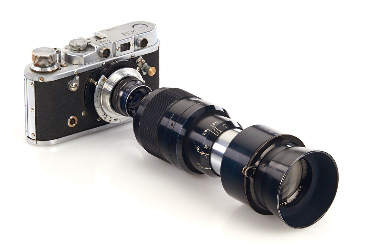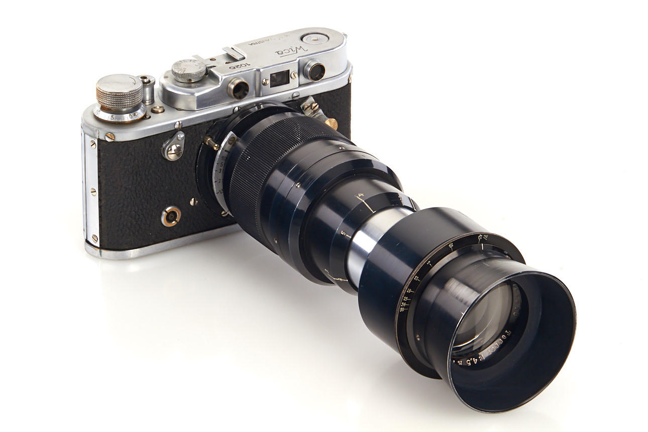 hand-made 35mm camera by R. Gerstendörfer, Vienna - second model (long top) with Angenieux Type Z2 2.9/50mm no.156751 (clean optics with very rare original front cap), and Tessar 4.5/18cm no.126549 with M37 female mount, leather case, in excellent original and working condition - according to our sales records camera no.1020 was also equipped with Angenieux Type Z2 lens