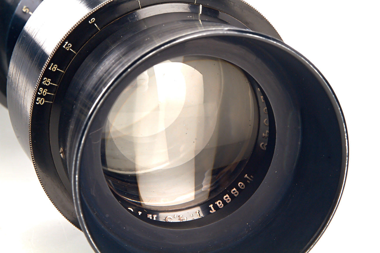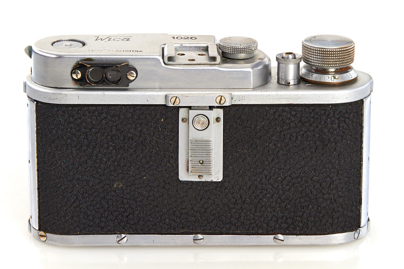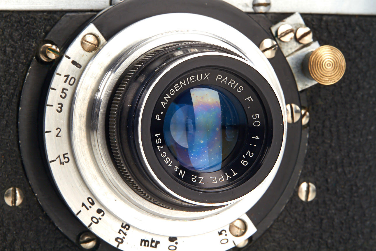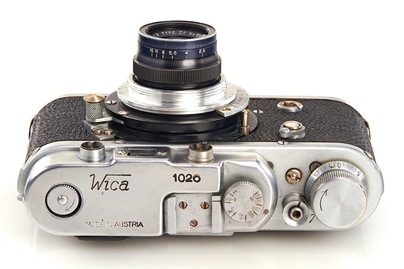 hand-made 35mm camera by R. Gerstendörfer, Vienna - second model (long top) with Angenieux Type Z2 2.9/50mm no.156751 (clean optics with very rare original front cap), and Tessar 4.5/18cm no.126549 with M37 female mount, leather case, in excellent original and working condition - according to our sales records camera no.1020 was also equipped with Angenieux Type Z2 lens