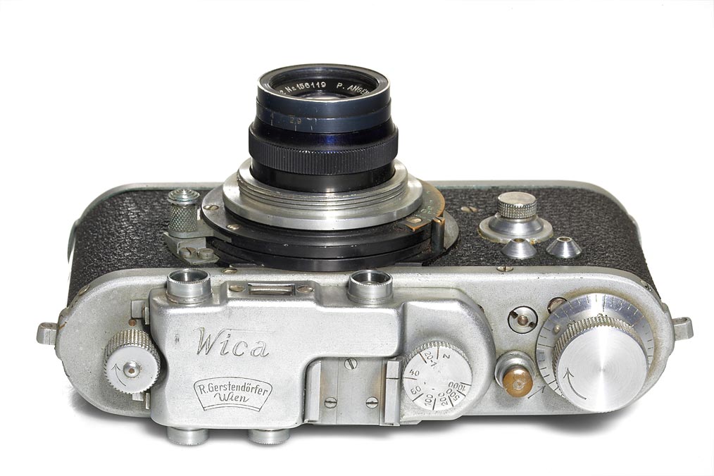 very rare Viennese camera by Gerstendörfer, second (long top) version, matching serial number on backdoor, Angenieux type Z2 2.9/50mm no.156119, in very good original and working condition, together with original WICA screen adapter