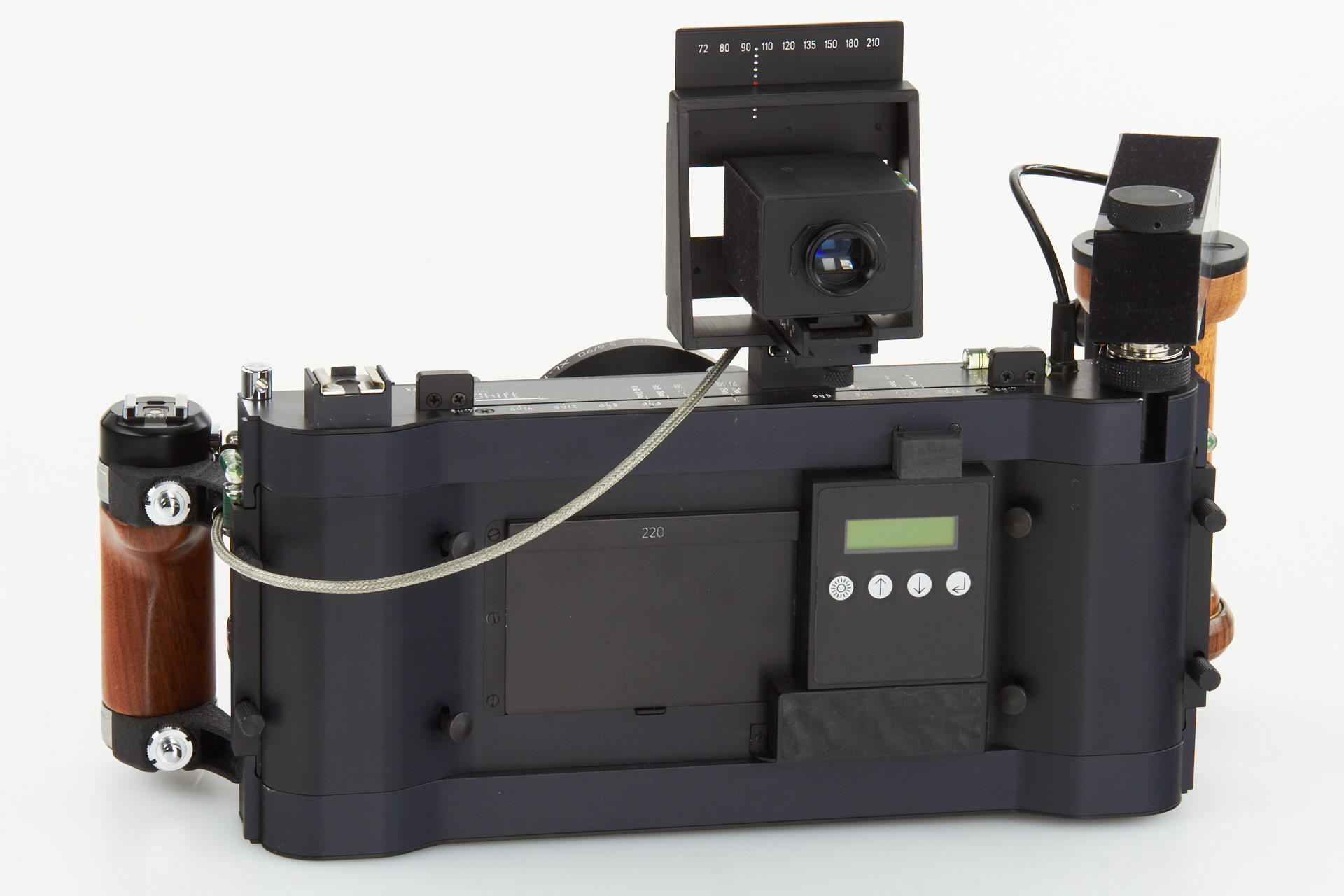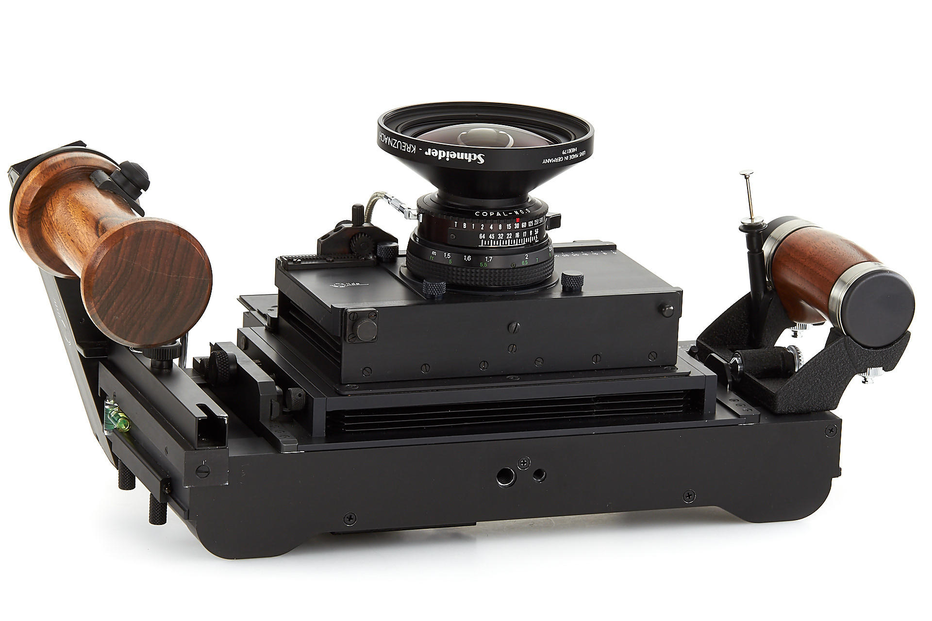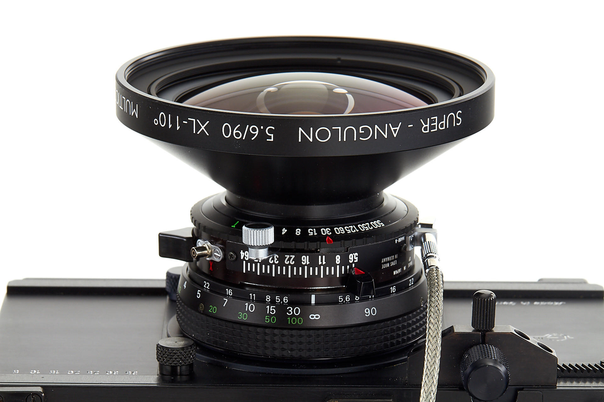 rare German panoramic camera in excellent condition, for 6x6cm to 6x17cm exposures on 120/220 roll film, extremely solid and precise construction, with panoramic lens board and Super-Angulon 5.6/90mm XL-110° no.14830179 (clean optics, with center filter, front cap), equipped on customers order with vertical tilt function as well, incl. original focusing screen, motor grip (not tested, no batteries included), special shade, multi-format viewfinder, original plastic case and a large Tamrac carrying backpack