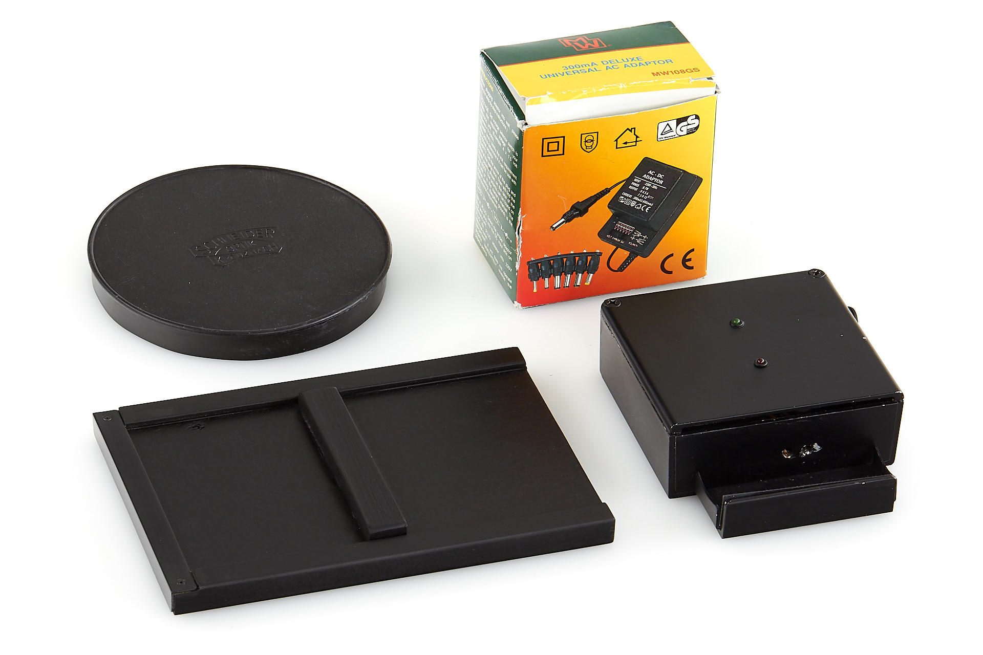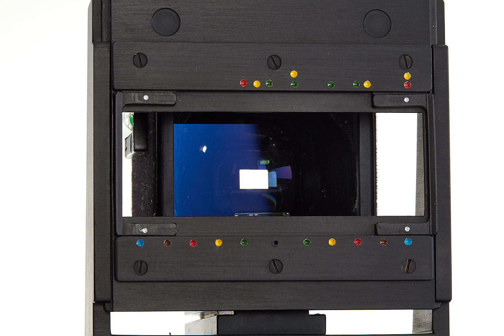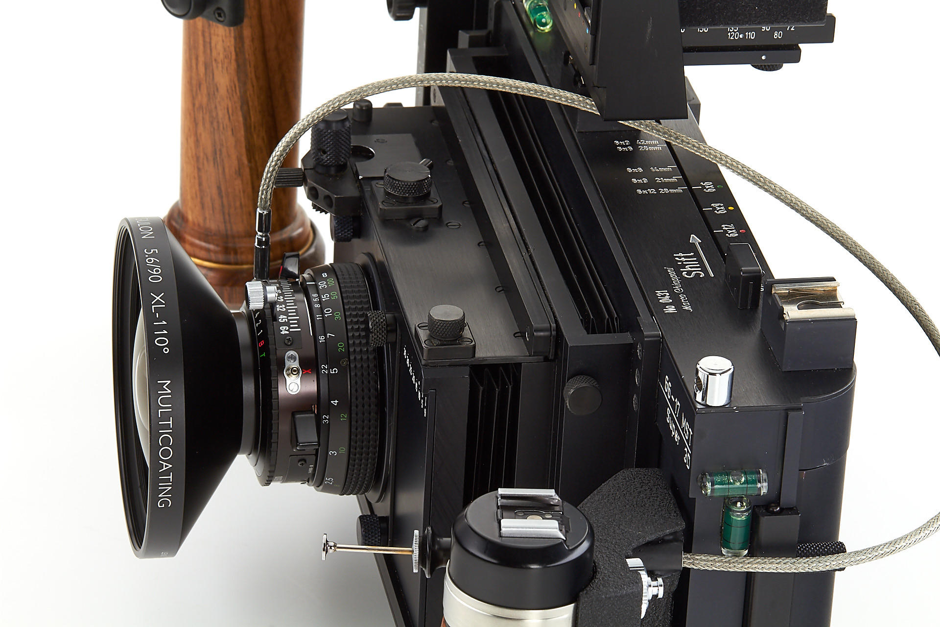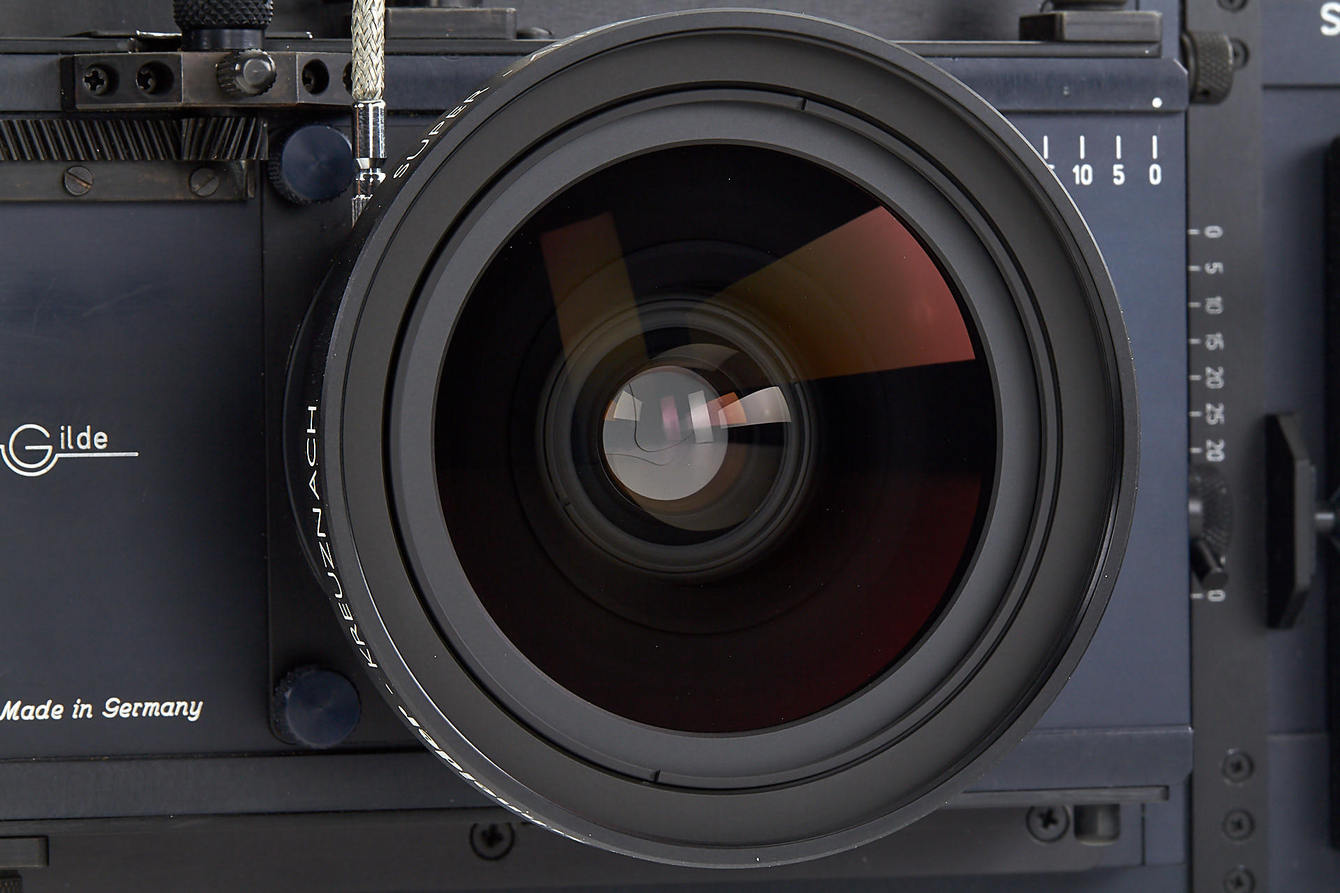 rare German panoramic camera in excellent condition, for 6x6cm to 6x17cm exposures on 120/220 roll film, extremely solid and precise construction, with panoramic lens board and Super-Angulon 5.6/90mm XL-110° no.14830179 (clean optics, with center filter, front cap), equipped on customers order with vertical tilt function as well, incl. original focusing screen, motor grip (not tested, no batteries included), special shade, multi-format viewfinder, original plastic case and a large Tamrac carrying backpack