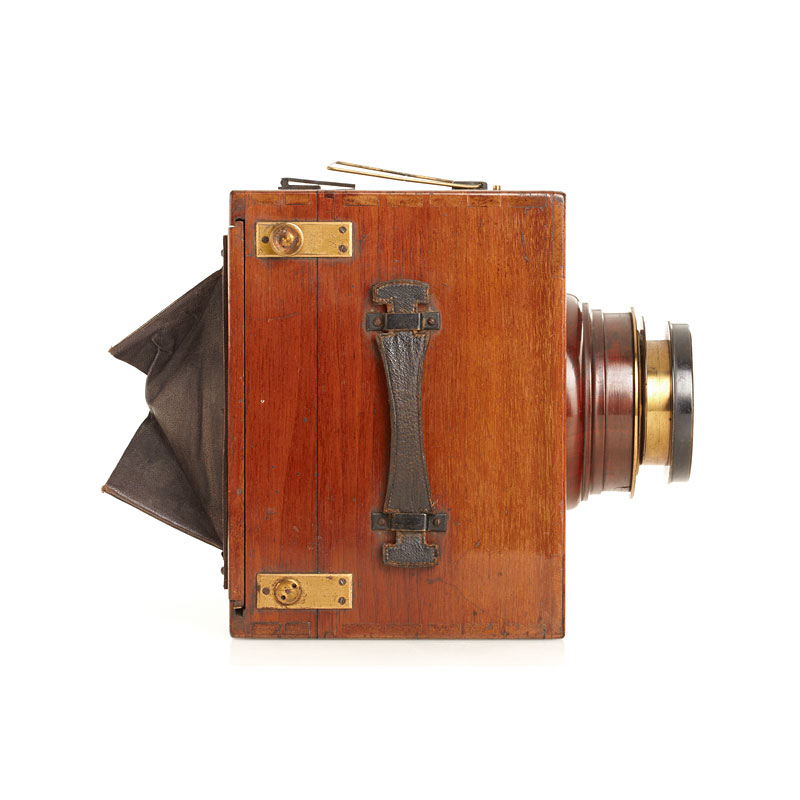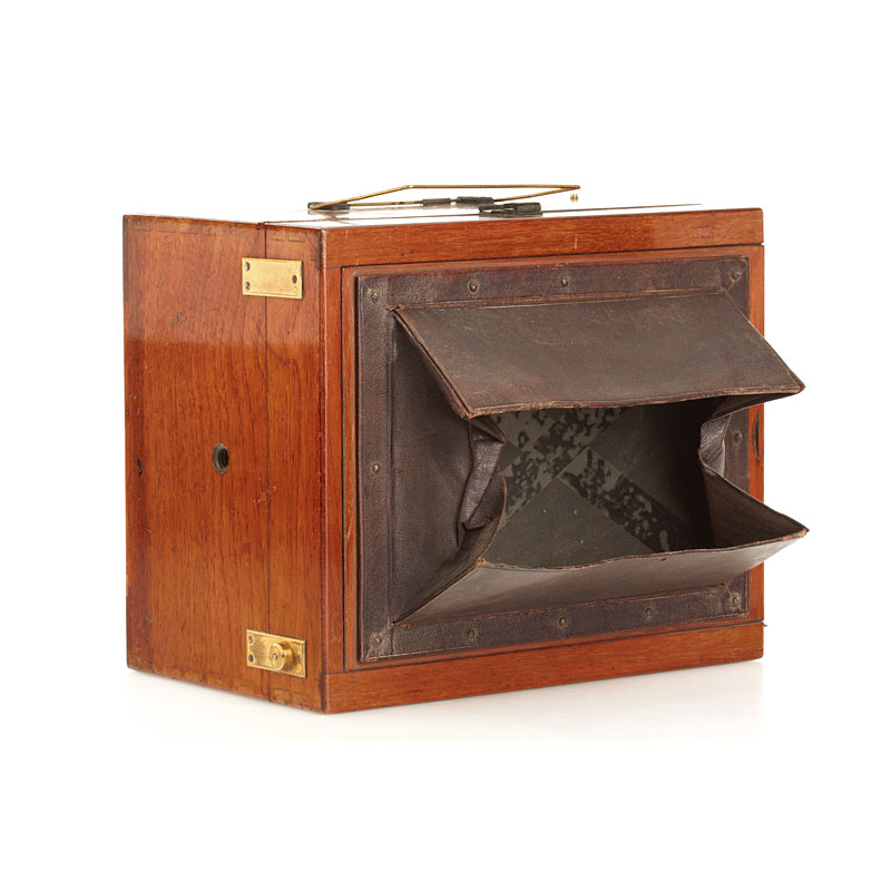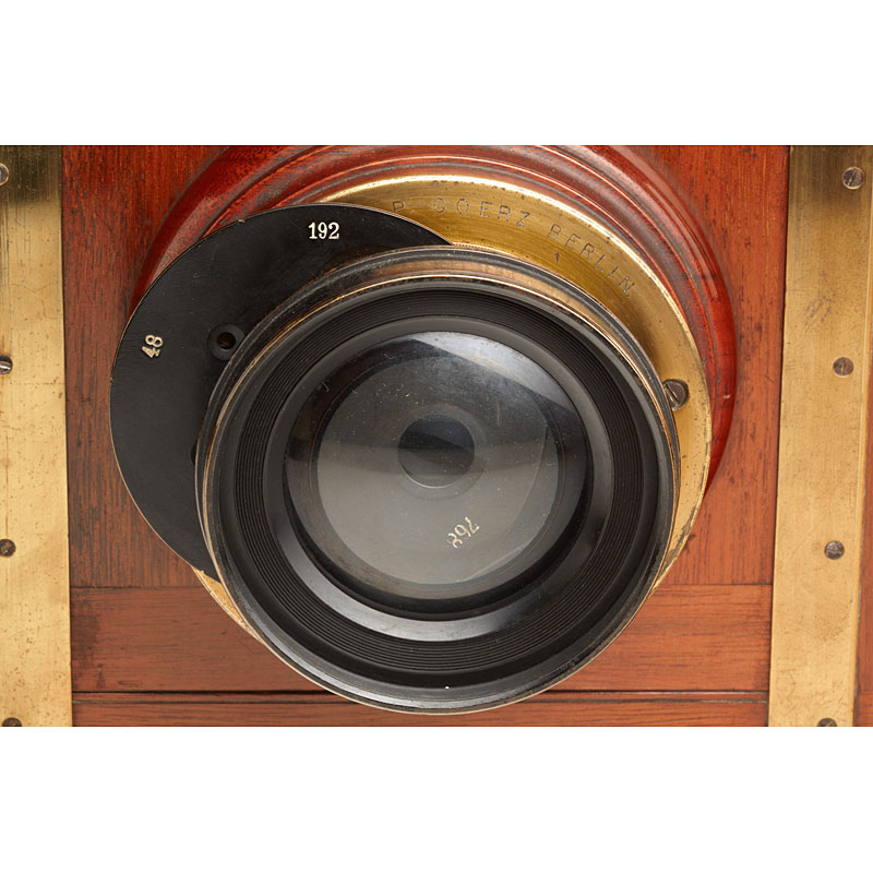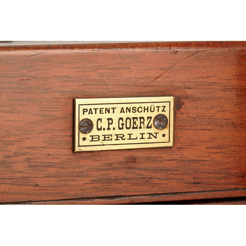 extremely rare 13x18cm walnut body with metal plaque engraved: PATENT ANSCHÜTZ C.P.GOERZ BERLIN, brass lens engraved C.P. GOERZ Berlin WEITWINKEL - LYNKEIOSKOP Serie F No.4 no.149327 with rotating iris disc, focal-plane shutter (inoperable), metal folding frame finder, camera in very fine condition