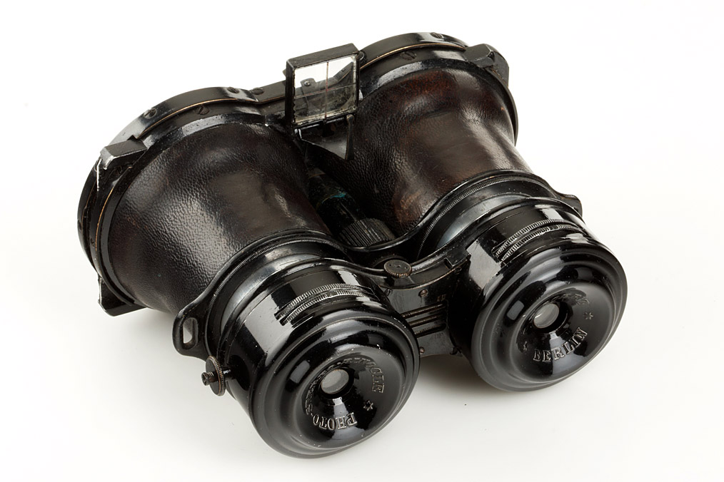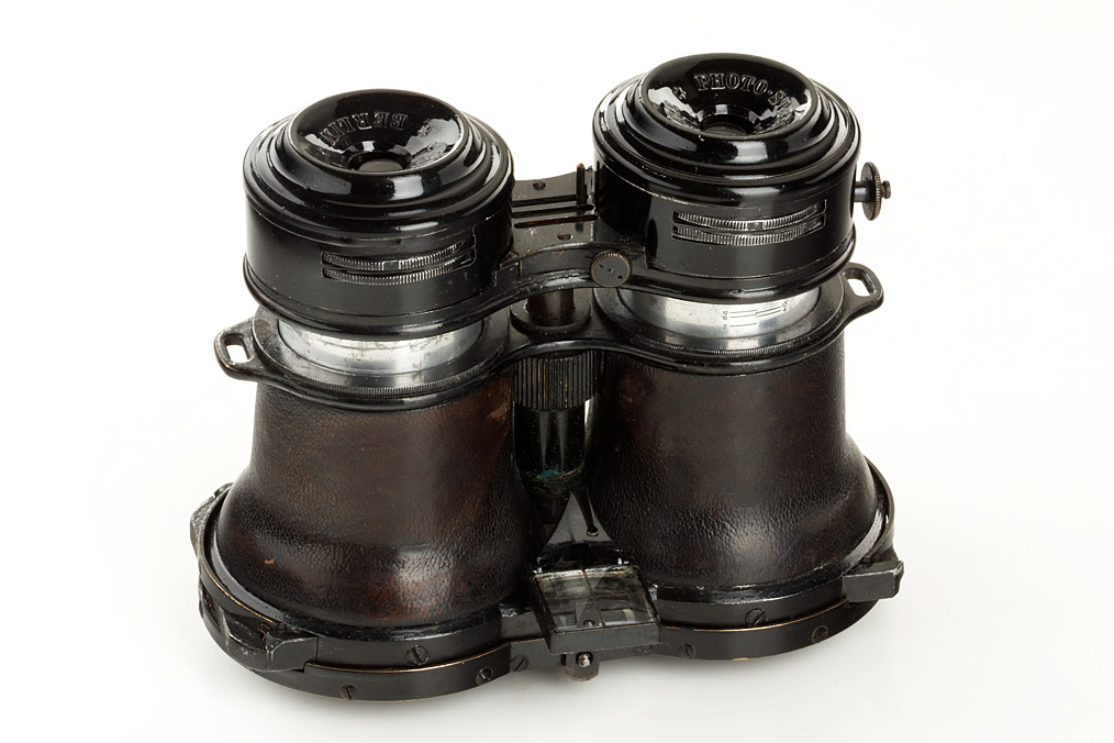 detective camera in the form of a pair of binoculars for 45x50mm stereo exposures, Doppel-Anastigmat III 75mm lenses, guillotine shutter, Newton finder, original case, the camera can be used as camera or binoculars