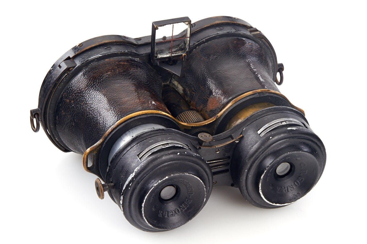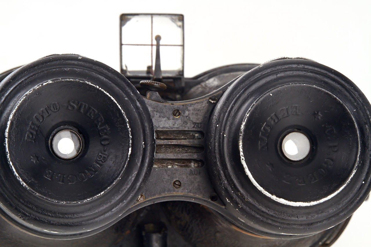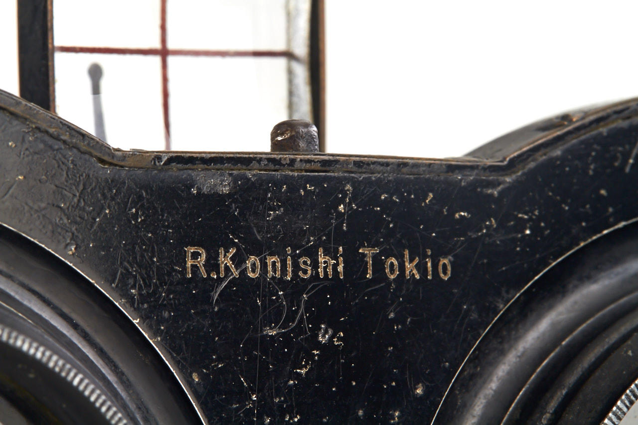 binocular detective camera for 45x50mm stereo exposures, Doppel-Anastigmat III 75mm lenses nos.80018/83342, guillotine shutter, Newton finder, the camera can be used as a camera or as binoculars, in original condition - very rare and maybe unique export camera for Japan engraved 'R.Konishi Tokyo' for the owner of Konishiroku Company in Tokyo