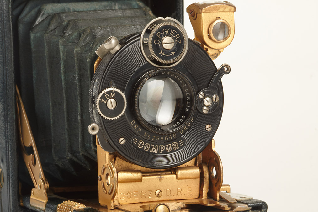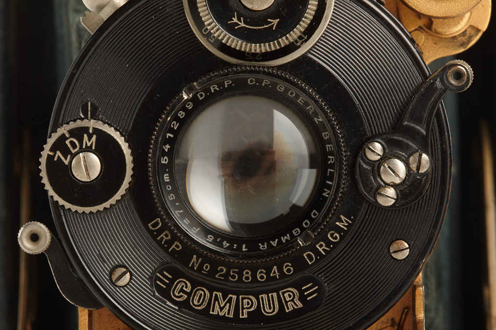 blue/green leather covered 4.5x6cm Rollfilm camera with matching leather bellows, gold plated metal parts, same serial number in back door, Dogmar 4.5/7.5cm no.541289 in Compur shutter