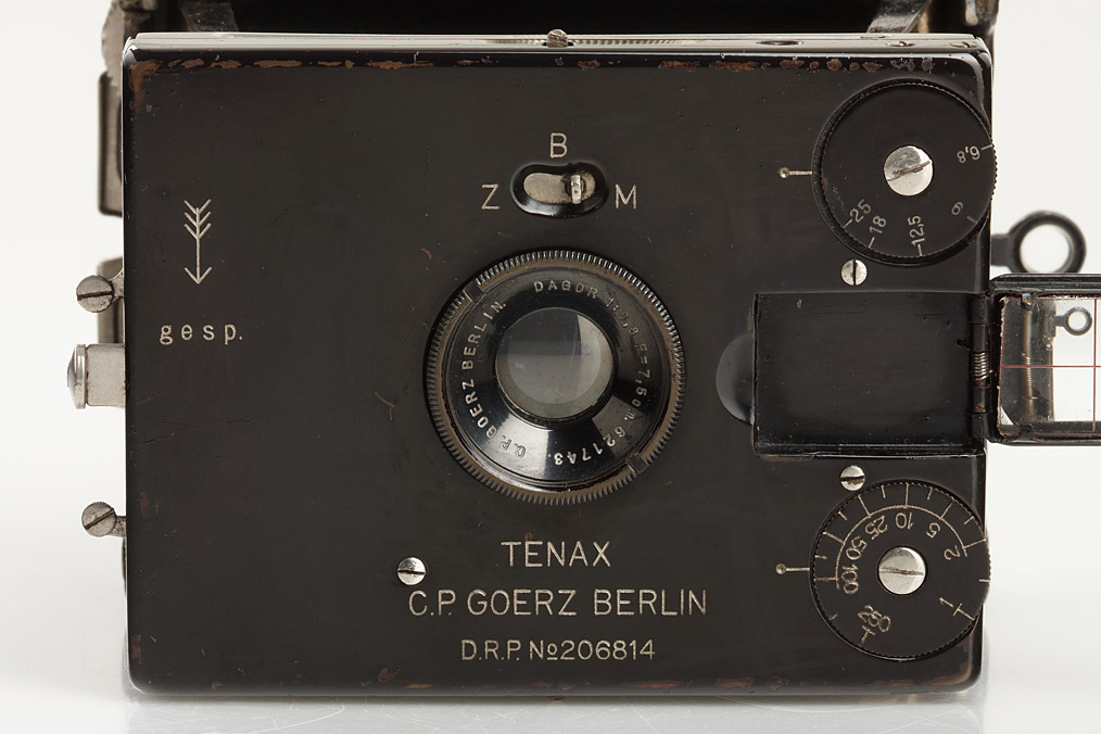 4.5x6cm, brass tropical Tenax with green reptile leather covering and bellows, nickel fittings, Dagor 6.8/7.5cm no.621743, one double-film holder - very rare