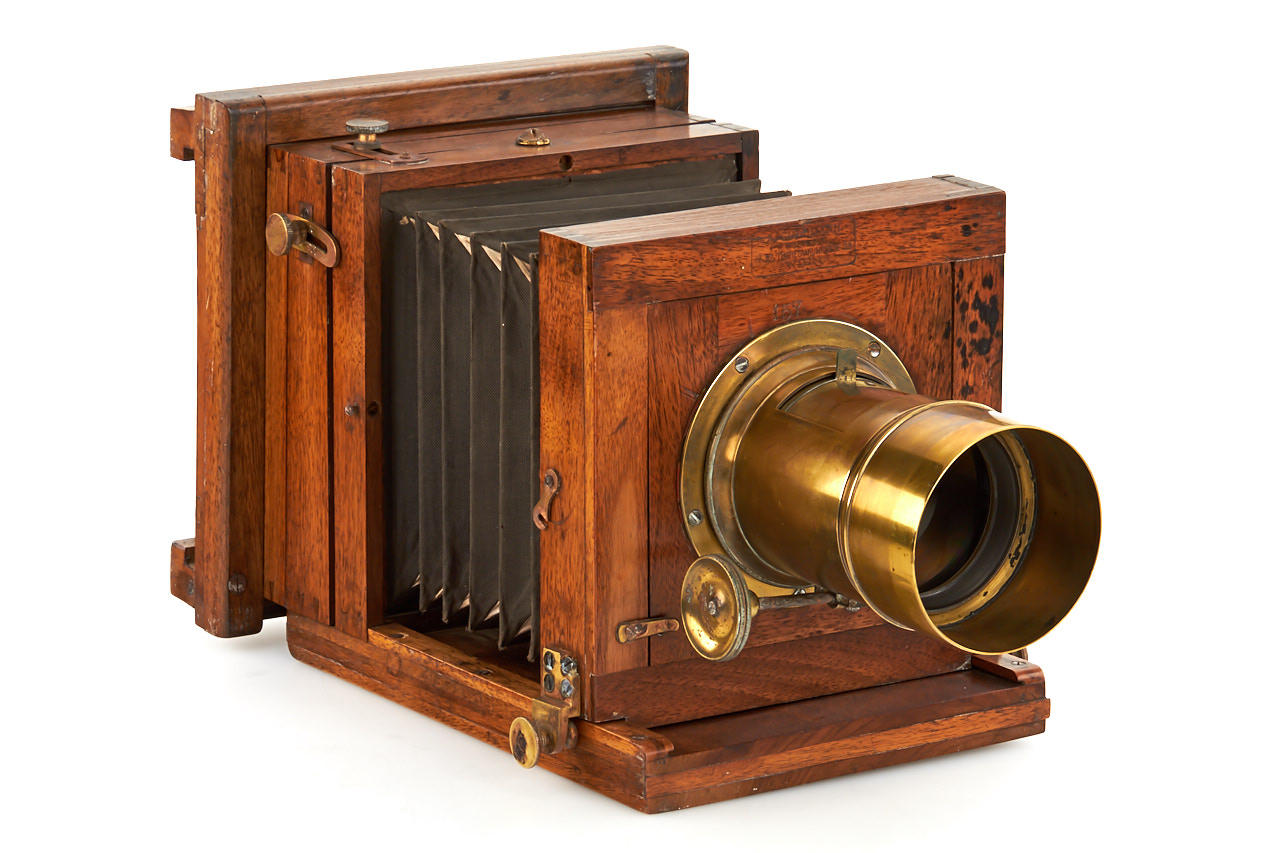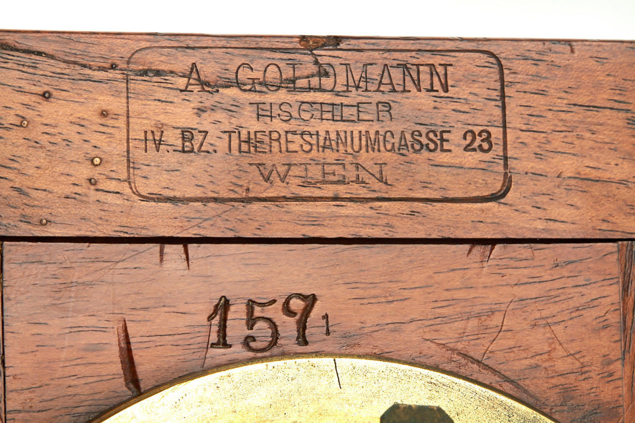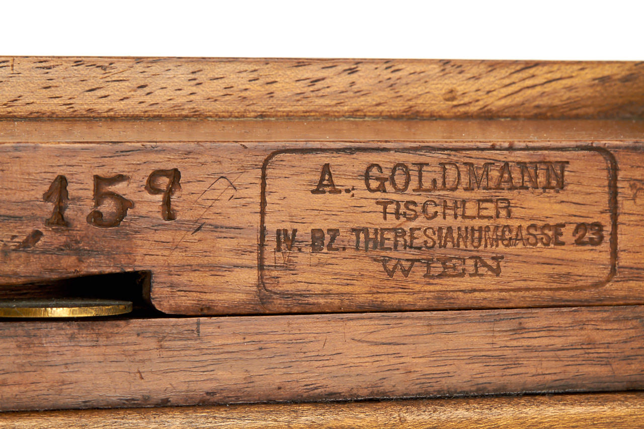 very early 1/4 plate camera, on front and rear stamped 'A.Goldmann Tischler IV BZ. Theresianumgasse 23 Wien, + serial number '157'. In very good condition, original bellows, with early Voigtländer Petzval lens no.11319 engraved 'Voigtländer & Sohn in Wien und Braunschweig' (c.25cm focal length, total height with hood c.18cm, good optics, brass cap), six glass bottles for developing chemicals, glass developing tank for single plates - Anton Goldmann was the first Austrian camera maker, he opened his workshop in 1858