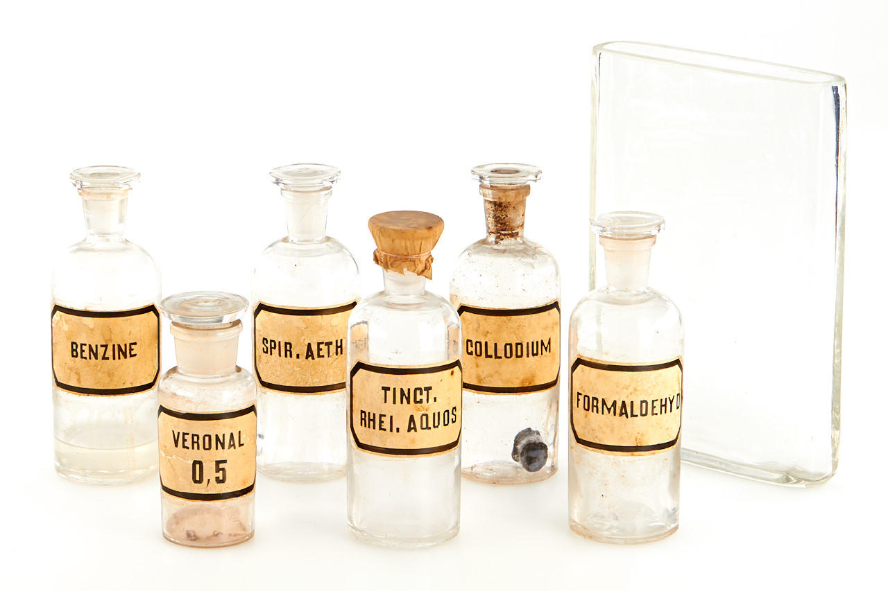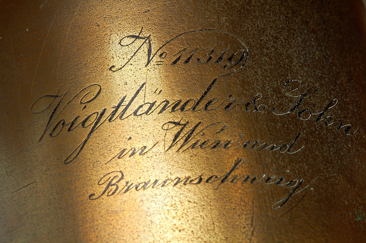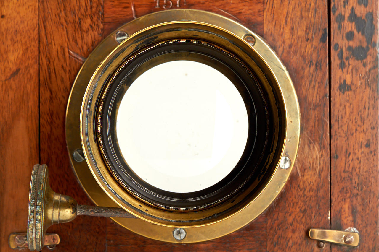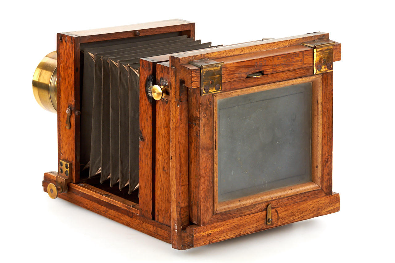 very early 1/4 plate camera, on front and rear stamped 'A.Goldmann Tischler IV BZ. Theresianumgasse 23 Wien, + serial number '157'. In very good condition, original bellows, with early Voigtländer Petzval lens no.11319 engraved 'Voigtländer & Sohn in Wien und Braunschweig' (c.25cm focal length, total height with hood c.18cm, good optics, brass cap), six glass bottles for developing chemicals, glass developing tank for single plates - Anton Goldmann was the first Austrian camera maker, he opened his workshop in 1858