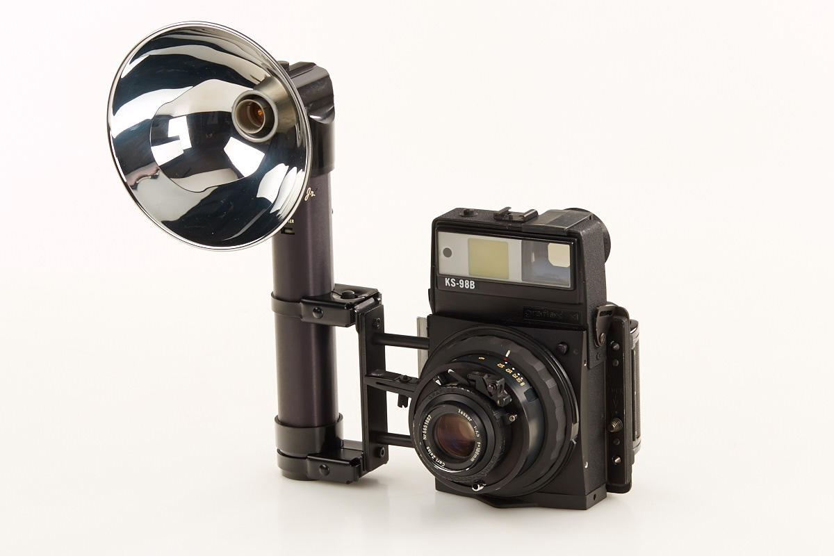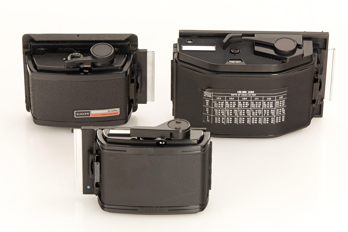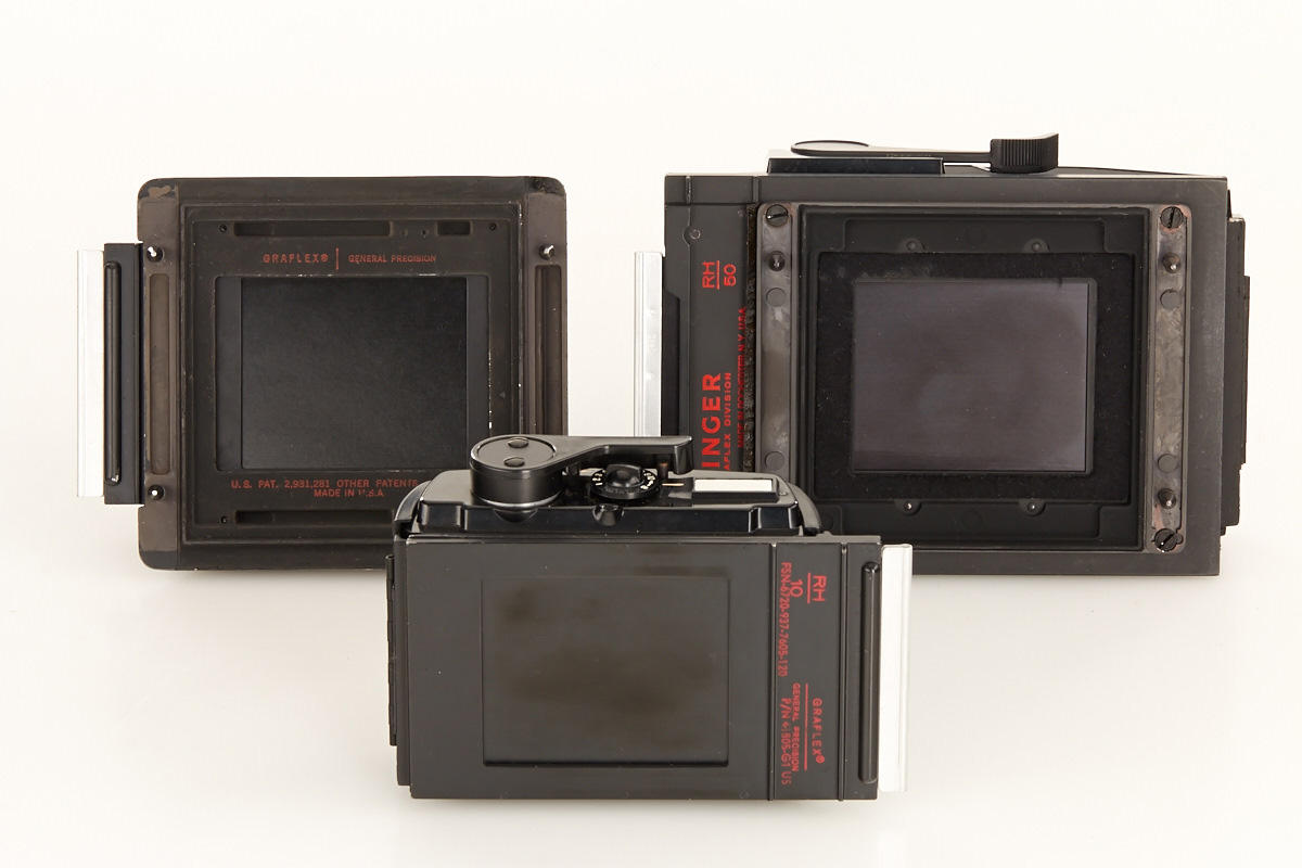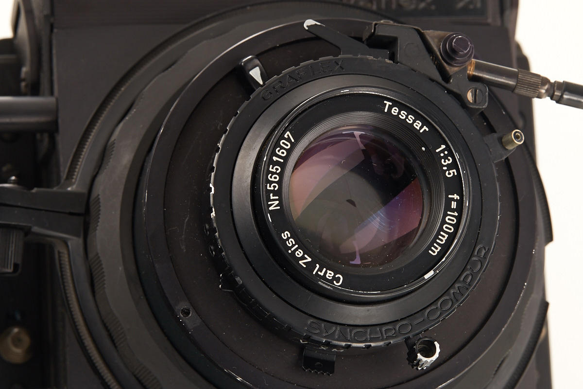 for roll film 120, very rare military Graflex outfit containing: completely black anodised Graflex XL with Tessar 3.5/100mm no.5651607 in Synchro-Compur shutter, grip, cable release, flashgun, three roll film magazines (RH10 film holder, RH20 film holder and RH50 film holder for 70mm film), hood, filters, adapter rings, cap, sport finder, instruction books, content list, all in fitted military outfit case (marked 'CAMERA SET, KS-98B PART NO.40329G7 SINGER/GRAFLEX DIVISION CONTR. NO. F42600-73-C-0181 FSN 6720-880-5298 US')