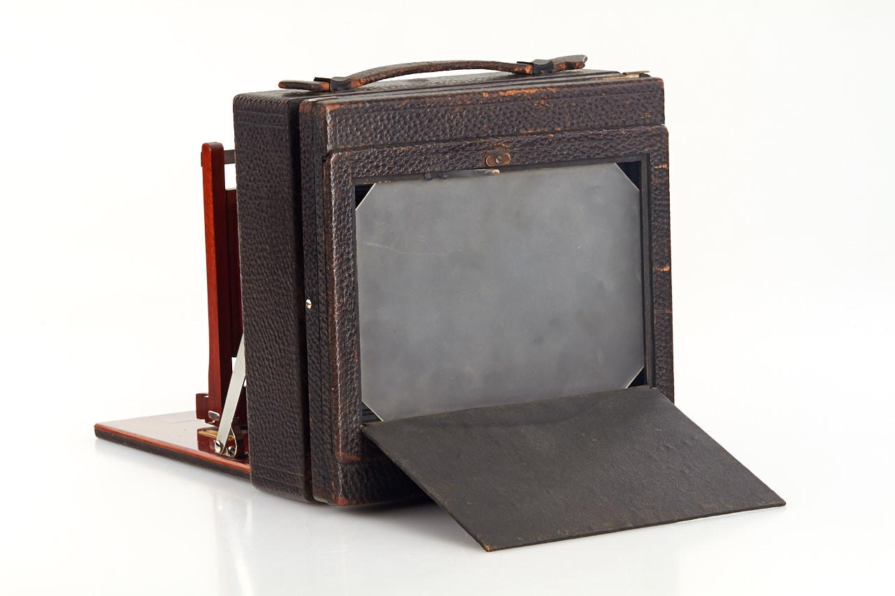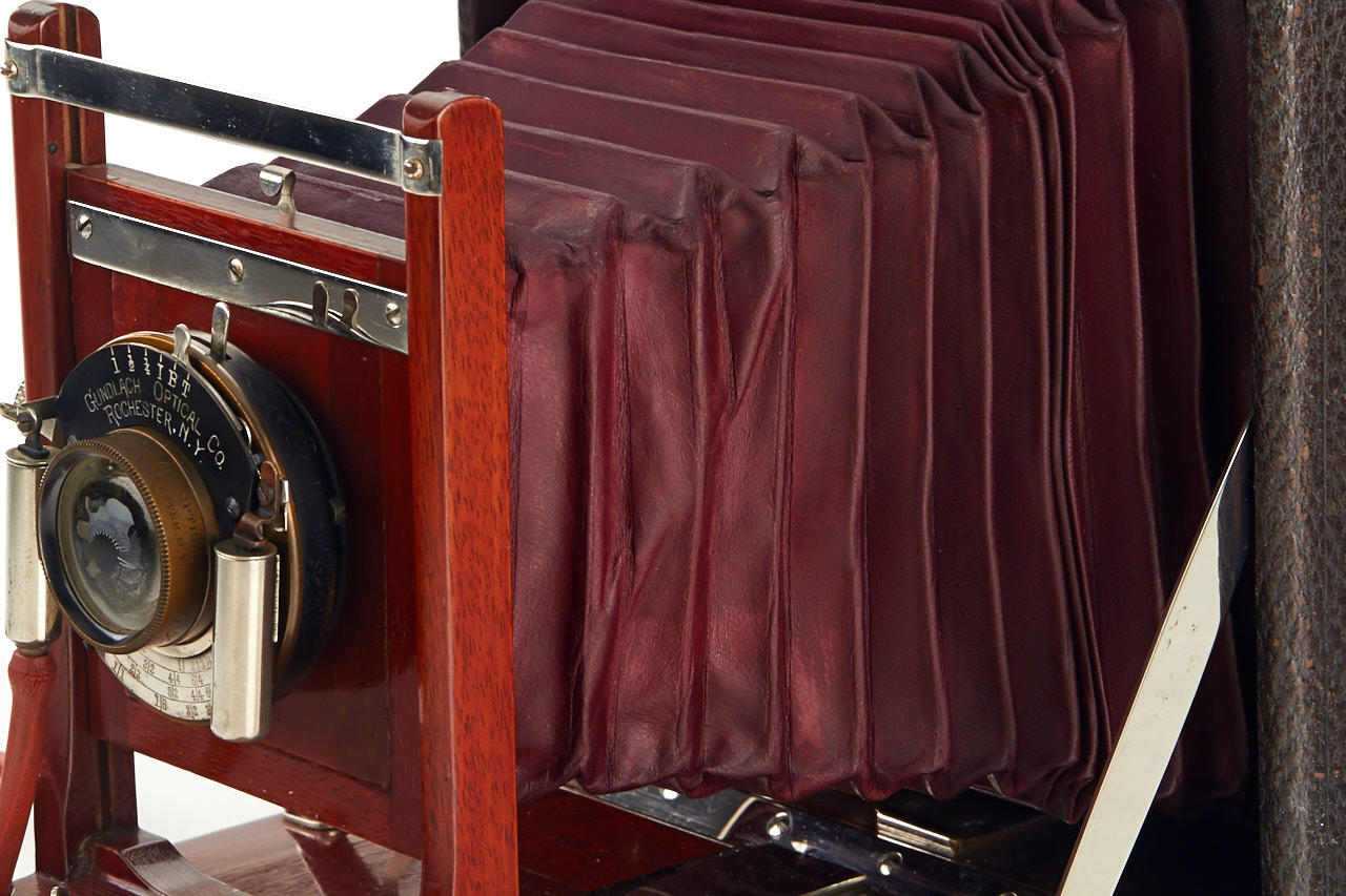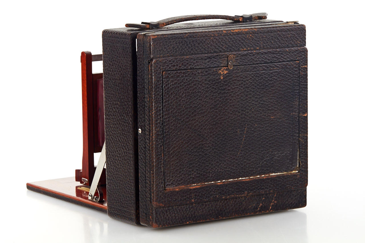 advanced 5x7" folding bed camera, brown leather covering with beautiful mahogany interior, red bellows, unmarked lens in Gundlach shutter